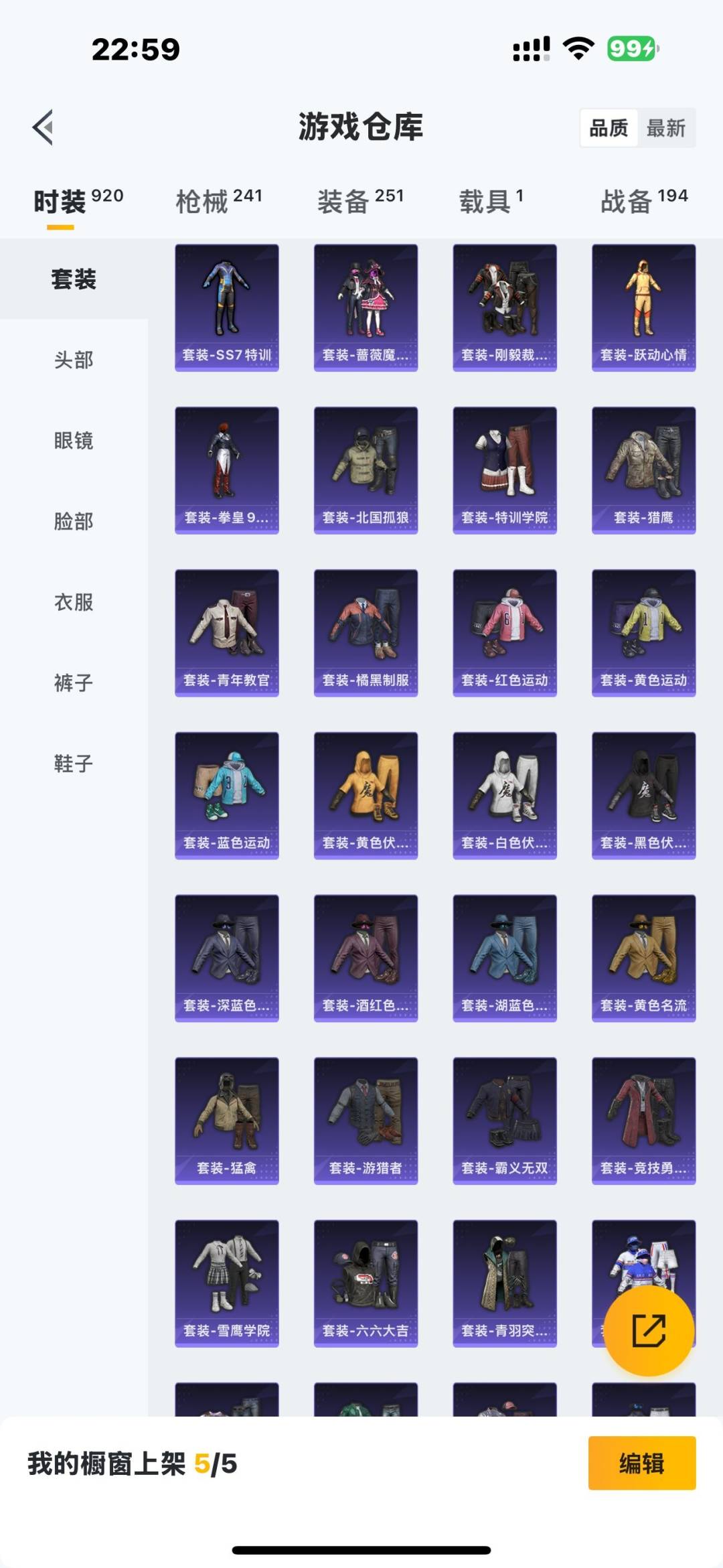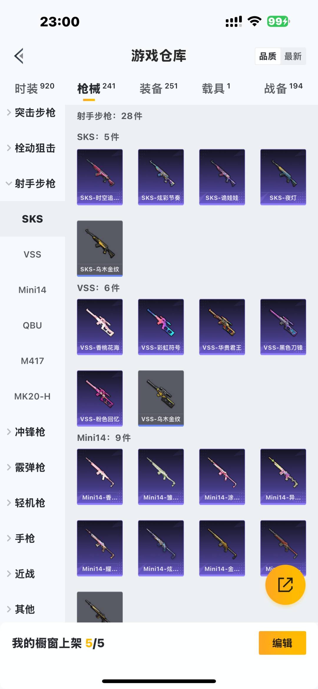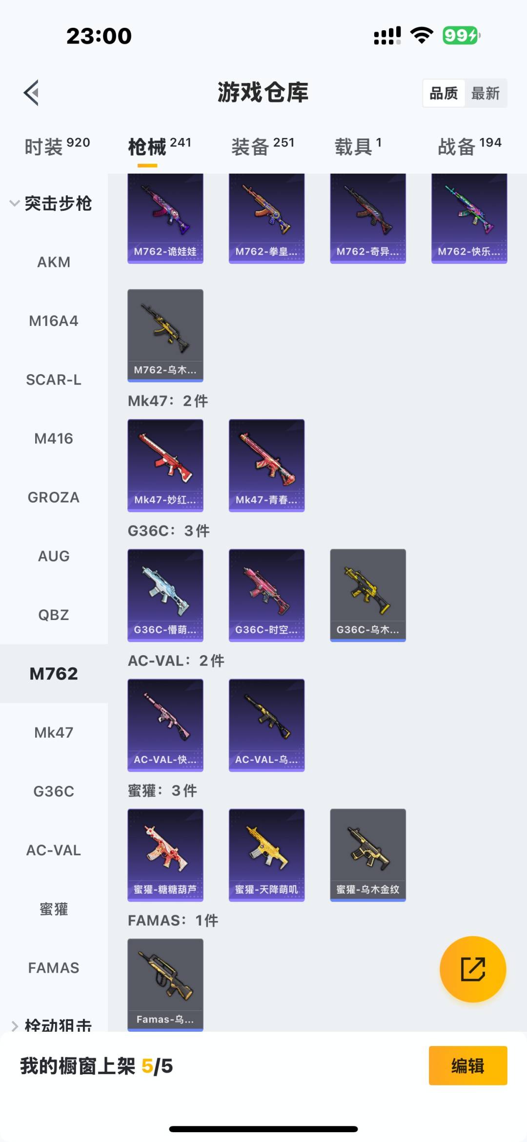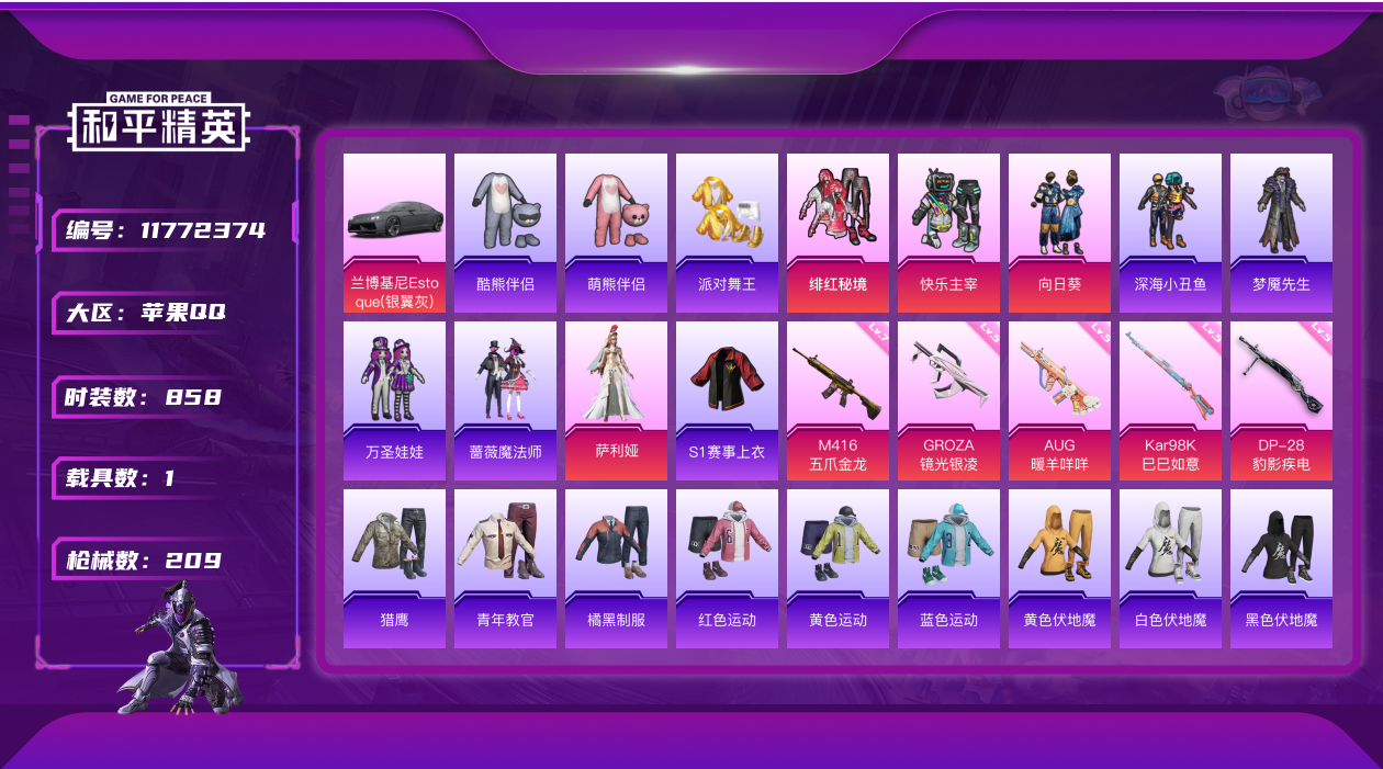 [11772374]2粉装 5特效枪 1载具 15印记 可二次 可修改实名 身法装备:舞王派对(派对舞王、小金鞋),暗影哥特(红眼罩) 优质装备:兰博基尼Estoque(银翼灰),舞王派对(派对舞王、小金鞋),M416五爪金龙,快乐主宰,向日葵(套装-向日葵先生),七级M416-五爪金龙,GROZA-镜光银凌,萨利娅,AUG-暖羊咩咩,Kar98K-巳巳如意 热门装扮:S1赛事上衣,蔷薇魔法师,万圣娃娃,梦魇先生,酷熊伴侣,深海小丑鱼,萌熊伴侣,派对舞王(小金鞋),绯红秘境 稀有枪皮:DP-28-豹影疾电 五级特效枪:五级GROZA-镜光银凌,五级Kar98K-巳巳如意,五级DP-28-豹影疾电,五级AUG-暖羊咩咩 紫色装扮:SS22特训,SS23特训,幻彩翩翩,妙红点点,浪漫假日,SS31特训套装,冰凉西瓜,SS2特训,SS4特训,SS5特训,云霄猎人,人气偶像,光速穿梭者,六六大吉,冰川特警,决胜时刻,凛冬战士,刚毅裁决者,北国孤狼,午夜朋克,SS30特训套装,SS33特训套装,青涩时光,5.56爱好者,青春冒险家,潮流游乐家,SS15特训,时空追击者,暴风机械师,SS16特训,爆裂葡萄,萌趣颜团子,特种颜团子,飞驰魅影,音速流光,SS19特训,吉莉礼服,瑞龙福将,团圆交子,SS17特训,SS18特训,向日葵先生,阳光火鸡,都市漫游者,酒红色名流,酷潮明星,金鼠迎春,长空猛禽,雪山征服者,雪山精英,雪鹰学院,霓虹极客,霓虹街区,霸义无双,青年教官,迎春赐吉,缤纷果语,蓝彩潮人,蓝色守护者,蓝色运动,虎虎生威吉莉,血色贵族,超能勇士,跃动心情,骑行爱好者,魅力单车,黄色伏地魔,黄色名流,黄色格斗者,黄色运动,黎明保卫者,黑色伏地魔,龙的传人,龟仙人,香桃花海,熔岩游骑兵连帽夹克,缤纷假日,极地朋克,柠萌假日,橘黑制服,沙漠兵团,派对绅士,涂山之恋,深蓝色名流,清新柠檬,滨海假日,幻影武者,圣诞大吉,坚韧舞者,夏日音浪,夜莺强袭者,完美偶像,帅气教官,幻世保卫者,怒火燎原,战地英姿,战地菁英,战地领军,湖蓝色名流,滨海厨神,绮丽涂鸦,甜蜜菠萝,生化防暴队,疯狂小兔子,白熊同盟,白色伏地魔,破晓战魂,破蛋小黄鸡,碟中谍A款,甜蜜告白,游猎者,福星高照,空岛之星,空投萌叽,竞技勇士朋克,竞技达人朋克,紧急救援,红色运动,甜蜜熊情侣,王牌教练,牛气冲天,灰色格斗者,炫蓝之夏,热血青春,