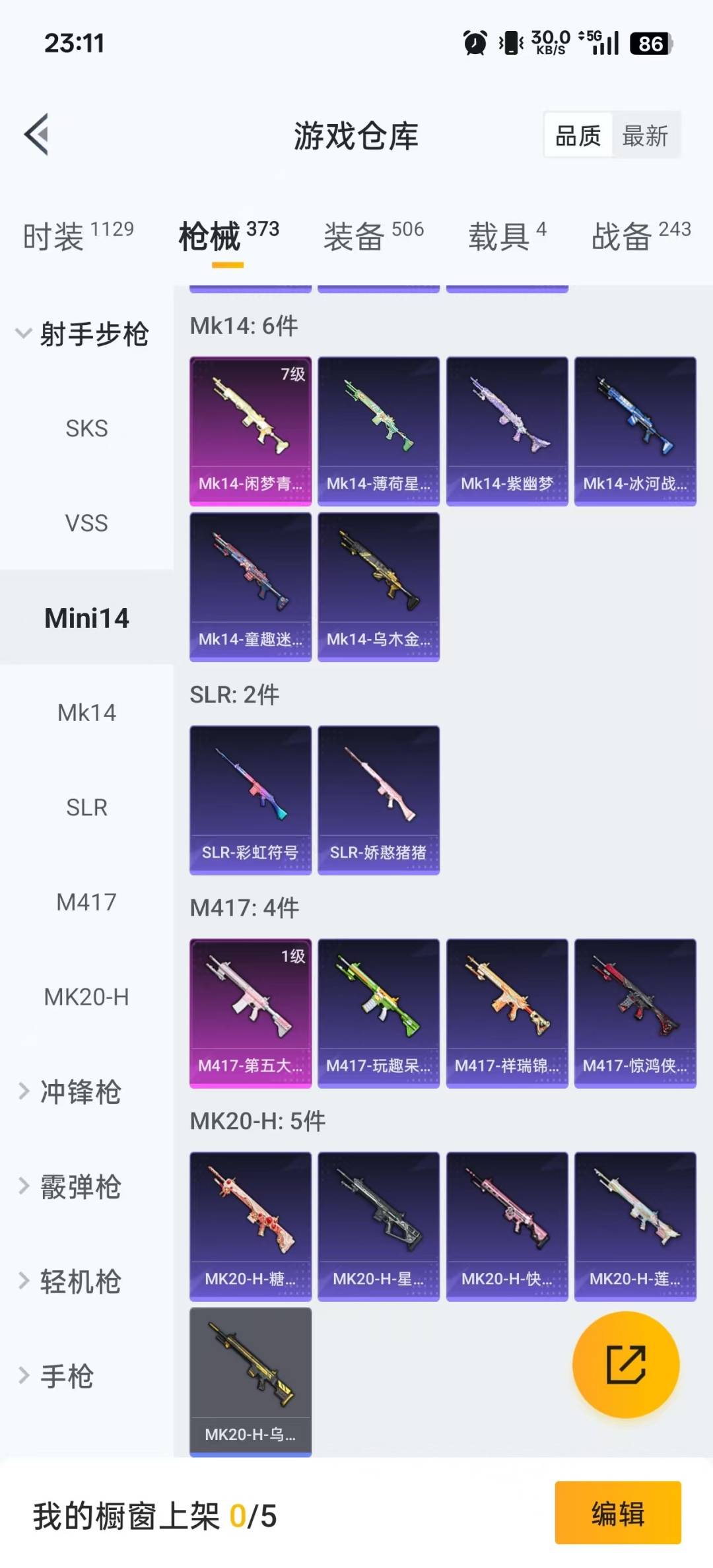 AKM-炫紫旋律,AKM-梦之光华,SCAR-L-童趣迷兔,SCAR-L-青春物语,SCAR-L-纯梦嫁纱,M416-暖熊萌萌,M416-心之恋语,M416-风花雪月,M416-五爪金龙,GROZA-镜光银凌,AUG-星之彼岸,Kar98K-未来歌姬,Kar98K-巳巳如意,AMR-炫光之旅,Mk14-闲梦青缨,M417-第五大道,Vector-环太平洋,P90-沙丘之主,SPAS-12-音爆索尼克,DP-28-圣堂之誓,烟雾弹-猫咪绅士,破片手榴弹-粉粉猫爪