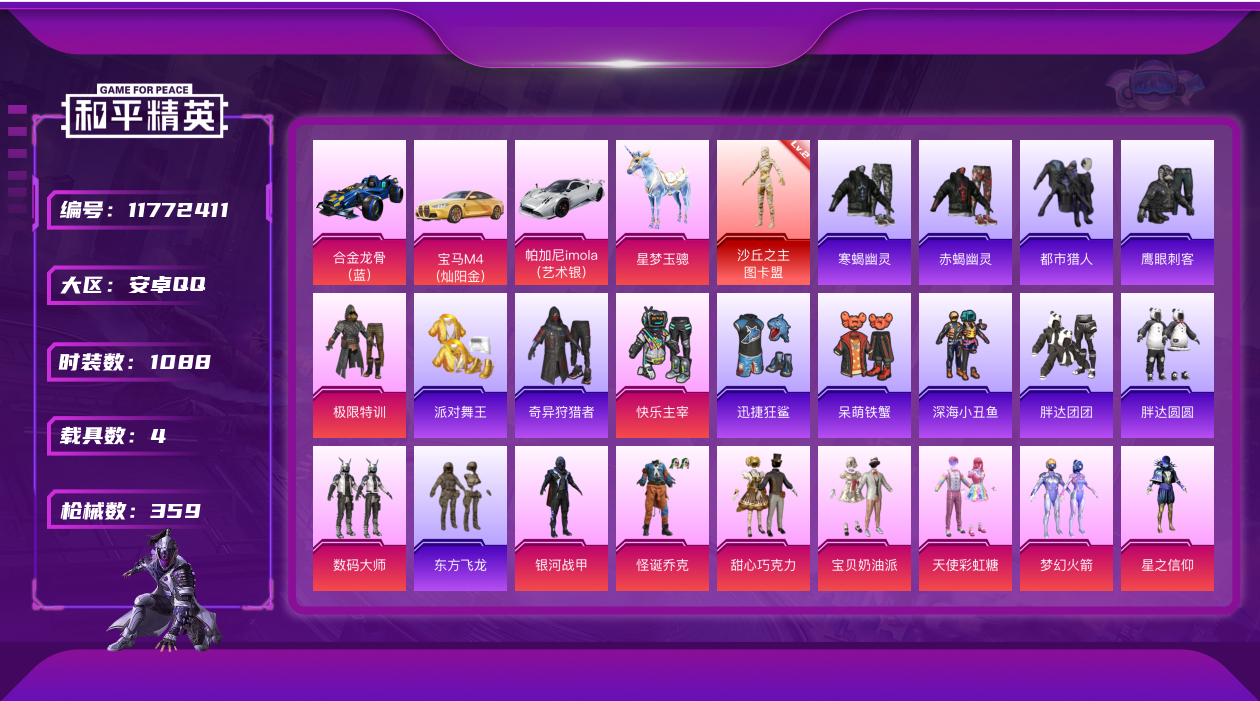 [11772411]1红装 45粉装 25特效枪 4载具 16印记 可二次 可修改实名 身法装备:寒蝎幽灵,赤蝎幽灵,都市猎人,舞王派对(派对舞王、小金鞋),暗影哥特(红眼罩),零号机款机体服(黄螳螂),8号机(新粉螳螂),Mark.06(新蓝螳螂),萌熊伴侣背包(粉熊背包) 优质装备:沙丘之主-图卡盟(黄金木乃伊),二级沙丘之主-图卡盟(2级黄金木乃伊),怪诞乔克(小丑),星梦玉骢,帕加尼imola(艺术银),宝马M4(灿阳金),三级宝马M4(灿阳金),零号机款机体服(黄螳螂),合金龙骨(蓝),甜心巧克力,舞王派对(派对舞王、小金鞋),天网终结者,迪迦闪耀型(奥特曼),寒蝎幽灵,赤蝎幽灵,寒蝎幽灵,都市猎人,枪皮-星际漫游M416,萌熊伴侣背包(粉熊背包),AKM炫紫旋律,M416五爪金龙,M416心之恋语,奇异狩猎者,梦幻火箭(新101)(新火箭少女101粉色套装),蝶舞迷情,极限特训,数码大师,快乐主宰,星之信仰,宝贝奶油派,天使彩虹糖,放客神游,银河战甲,金属狂野,智能音符,SCAR-L童趣迷兔,天禅智恒,绚金战神,花间之火,冰霜白皇,新星烈龙(小白龙),俏皮狐尾,星之彼岸,AUG星之彼岸,AKM梦之光华,M416风花雪月,SCAR-L青春物语,M416暖熊萌萌,Vector环太平洋,SCAR-L纯梦嫁纱,SPAS-12音爆索尼克,M417第五大道,Kar98K未来歌姬,AMR炫光之旅,MK14闲梦青缨,DP-28圣堂之誓,P90沙丘之主,七级MK14-闲梦青缨,七级Vector-环太平洋,七级M416-暖熊萌萌,七级AKM-梦之光华,七级AUG-星之彼岸,七级SCAR-L-童趣迷兔,破片手榴弹粉粉猫爪,六级破片手榴弹粉粉猫爪,烟雾弹猫咪绅士,GROZA-镜光银凌,星穹咏叹调,AKS-74U-星穹咏叹调,七级AKS-74U-星穹咏叹调,绯穹魔姬,Kar98K-巳巳如意 热门装扮:飓风飞鹰,吟月归客,紫电风暴,赤焰黑爵,冷魅冰骑,寒光使者,复仇流浪者,千面幻镜,音爆索尼克,第五大道,超级赛亚人贝吉塔,呆萌星弥,未来歌姬,炫光之旅,万古烈焰,宙之时溯,星云暗核,冰炎战车,紫钛骑兵,圣堂之誓,创世·救赎,动感兔斯基,胖达圆圆,胖达团团,激萌罗小黑,迅捷狂鲨,鹰眼刺客,呆萌铁蟹,深海小丑鱼,东方飞龙,都市猎人,派对舞王(小金鞋),赤蝎幽灵 稀有枪皮:MG-36-沧焰双生,DP-28