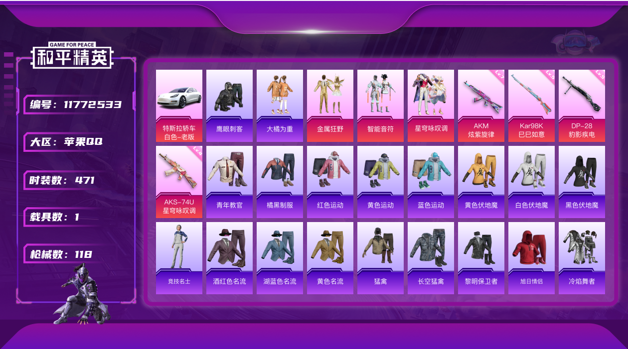 [11772533]3粉装 4特效枪 1载具 8印记 可二次 可修改实名 身法装备:暗影哥特(红眼罩) 优质装备:特斯拉Model 3(珍珠白),AKM炫紫旋律,金属狂野,智能音符,七级AKM-炫紫旋律,星穹咏叹调,AKS-74U-星穹咏叹调,Kar98K-巳巳如意 热门装扮:大橘为重,鹰眼刺客 稀有枪皮:DP-28-豹影疾电 五级特效枪:五级Kar98K-巳巳如意,五级DP-28-豹影疾电 四级特效枪:四级AKS-74U-星穹咏叹调 紫色装扮:SS22特训,SS23特训,SS21特训,SS31特训套装,人气偶像,冰川特警,冷焰舞者,北国孤狼,旭日情侣,SS30特训套装,SS33特训套装,青涩时光,顶瓜瓜,SS20特训,SS16特训,SS19特训,瑞龙福将,团圆交子,SS17特训,糖果砰砰,异彩先驱,SS18特训,都市魅力,酒红色名流,酷萌兔限定,野性战心,长空猛禽,霓虹极客,青年教官,青春校园,缤纷果语,耀眼新星,蓝彩潮人,蓝色运动,虎虎生威吉莉,街头潮人,超能勇士,风行保卫者,魅力单车,麻辣教官,黄色伏地魔,黄色名流,黄色运动,黎明保卫者,黑色伏地魔,龙的传人,龙魂突击队,香桃花海,极速红龙,格斗先锋,橘黑制服,沙漠兵团,深蓝色名流,幻影武者,夏日音浪,完美偶像,帅气教官,幻世战舞者,战地督导,湖蓝色名流,绮丽涂鸦,疯狂小兔子,白色伏地魔,破晓战魂,破蛋小黄鸡,福星高照,竞技达人朋克,红色运动,王牌教练,牛气冲天,灼焰舞者,牛气满满,猛禽,特战装甲,SS29特训,星途旅人,创世·幻影,创世·追猎,异域银装,鱼渊荷华,玉兔迎春,燕燕于飞,巳巳如意,森林游猎者,竞技名士,暗影哥特(红眼罩),街头风暴,惊鸿侠骨,SS25特训,锦衣飞扬,金羽特工,浪漫天命,日照花林,智谋强哥,核芯基因,人鱼之吻,摇滚狂鲨,迷域探索者,大橘大利,隐空刺,抹茶蜜豆,智慧之神,SS9特训,耀粉歌者,粉恋花,蓝冰羽,紫幽梦,SS32特训服(SS32特训套装),风舞幻音,白糯汤圆,光之冒险,丛林猎人 优质战备:创世·救赎降落伞,星途旅人降落伞,未来歌姬降落伞,飞行器-炫紫旋律,炫紫旋律降落伞,深海曼妙降落伞,蓝莓炮弹降落伞
