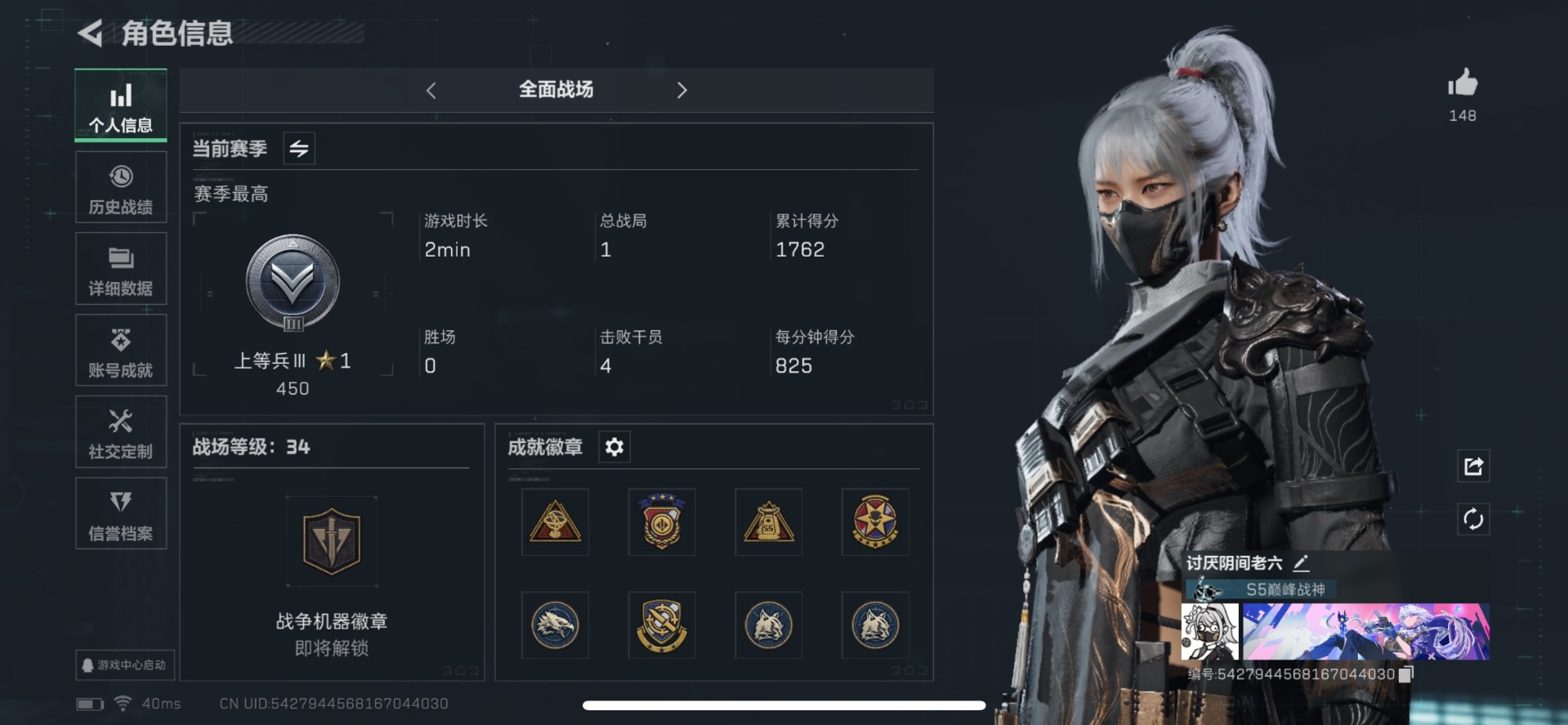 - [11445430]可二次 可修改实名 实名:可修改 烽火地带段位:铂金 全面战场段位:尉官 总资产:96.9 哈夫币:5.077 传说武器皮肤:SR-25射手步枪-水墨云图,复合弓-黑-天际线 史诗武器皮肤:PSG-1射手步枪-无垢,QSZ92G-风林火山 干员外观:红狼-蚀金玫瑰,露娜-黑·天际线