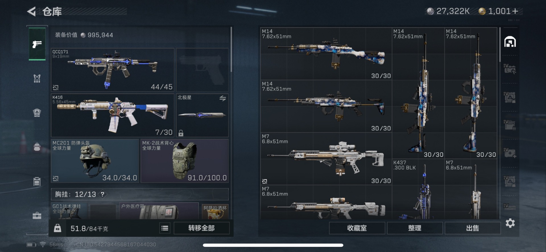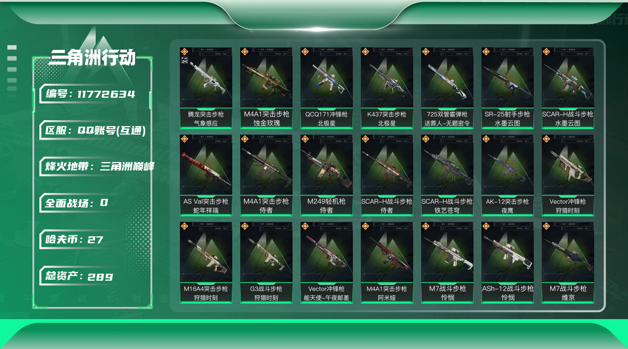 [11772634]总资产:289.7M 3干员外观 2近战传说 27传说枪械 哈夫币:27.322K 可二次 可修改实名 优质装备:近战-怜悯,近战-北极星,K416突击步枪-命运(典藏),腾龙突击步枪-气象感应(典藏),顶级安全箱(3x3),AUG突击步枪-气象感应(典藏) 烽火地带段位:三角洲巅峰 全面战场段位:上等兵 传说武器皮肤:SR-25射手步枪-水墨云图,SCAR-H战斗步枪-水墨云图,AS Val突击步枪-蛇年祥瑞,SCAR-H战斗步枪-铁艺苍穹,M16A4突击步枪-狩猎时刻,Vector冲锋枪-狩猎时刻,Vector冲锋枪-能天使-午夜邮差,G3战斗步枪-狩猎时刻,复合弓-黑-天际线,K437突击步枪-北极星,QCQ171冲锋枪-北极星,725双管霰弹枪-送葬人-无题密令,M4A1突击步枪-阿米娅,AK-12突击步枪-夜鹰,M7战斗步枪-神秘艺术,M7战斗步枪-维京,M7战斗步枪-怜悯,ASh-12战斗步枪-怜悯,M4A1突击步枪-蚀金玫瑰,SCAR-H战斗步枪-侍者,M249轻机枪-侍者,M4A1突击步枪-侍者 干员外观:红狼-蚀金玫瑰,骇爪-水墨云图,露娜-黑·天际线