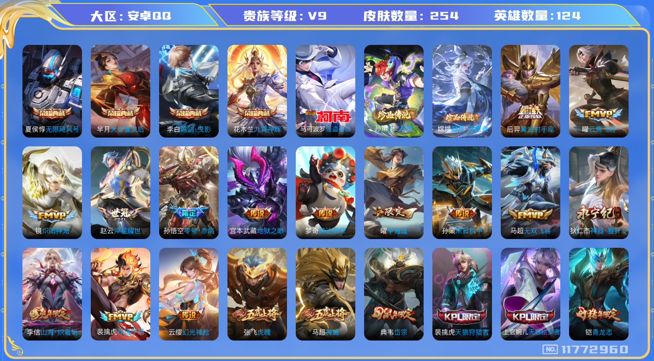 [11772960]【商品标题】:安卓Q-V9-至尊星耀V段位-124英雄-254皮肤-4典藏-0珍品无双-0无双-3珍品传说-24传说-76史诗