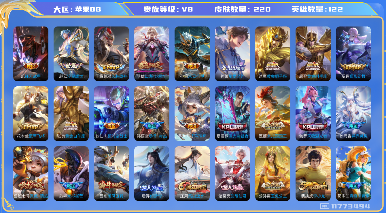 [11773494]V8 19传说 122英雄 220皮肤 可修改实名 优质装备:黄金狮子座,黄金射手座,冠军飞将,绛天战甲(鸡嘴战神),黄金白羊座,猫影幻舞,久胜战神,零号·赤焰,飞鸢探春,淬星耀世,超时空战士-狄仁杰,末日机甲-孙策,挚爱之约,山海·炽霜斩(李信年限) 珍宝阁皮:蔷薇恋人,玩趣恶龙 限定皮:至尊宝,武陵仙君(小桃花),异界灵契(白毛香),傲雪梅枪,高山流水,匿光决锋者,五谷丰年,御风骁将(吕布年限),天狼溯光者,李小龙,朱雀志(守约年限),如梦令-后羿,孙行者,猪悟能,青春决赛季,女儿国国王,寅虎·瑞焰(虎皮蛋子),时之祈愿-云中君,玉兔公主,无尽星芒,山海·玄木吟(马可年限) 史诗皮:化蝶舞,苍穹之光,白龙吟,黄金分割率,千年之狐,永昼,晚萤,末日机甲-吕布,修罗,女仆咖啡,摇滚巨星,水果甜心,绅士熊喵,天才门将,心灵骇客,暗隐猎兽者,幽灵船长,鬼剑武藏,暗渊魔法,心灵战警,乐园奇幻夜,天秀·启明,地狱岩魂,拒霜思,缤纷独角兽,金属风暴,原初追逐者,圣诞狂欢,鹰眼统帅,魅力维加斯,黎明之约,赏金猎手,奇遇舞章