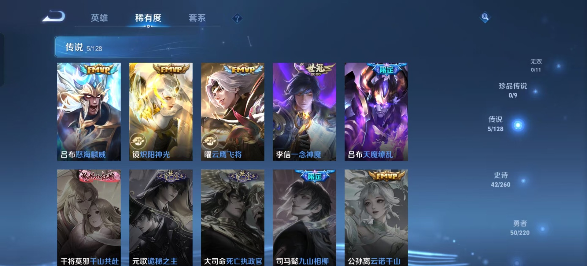 - PX_2093333-91 苹果QQ/至尊星耀/87皮肤/109英雄/0典藏/0珍品无双/0无双/0珍品传说/5传说/19史诗/5稀有英雄 【5 传说皮肤】齐天大圣 孙悟空,海洋之心 武则天,炽阳神光 镜,星之鸣奏 杨玉环,愿照·山河定 司空震, 【19 史诗皮肤】末日机甲 吕布,心灵战警 亚瑟,鬼剑武藏 宫本武藏,冰锋战神 关羽,魅力维加斯 妲己,鹰眼统帅 狄仁杰,逐浪之夏 李元芳,黎明之约 雅