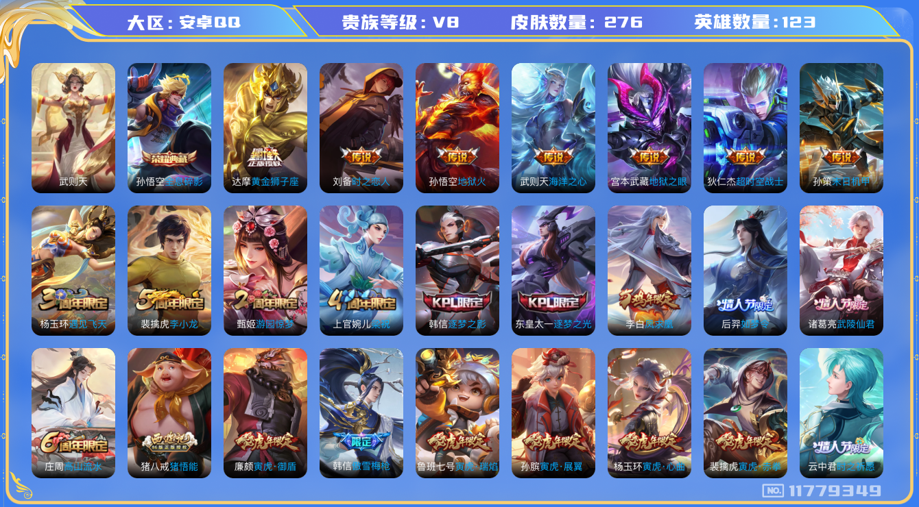 [11779349]【商品标题】:安卓Q-V8-尊贵铂金IV段位-123英雄-276皮肤-1典藏-0珍品无双-0无双-0珍品传说-15传说-64史诗