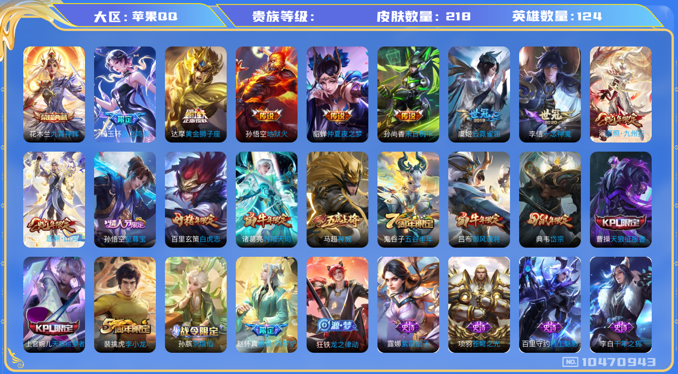 - PX_2077598-实名: 可修改 贵族等级: V7 英雄数: 121 皮肤数: 250 荣耀水晶: 杀手不太冷 珍品传说: 器灵·落星盏 传说皮: 云鹰飞将,音你闪耀,霜月吟,乘龙·问璇玑,幻光神枪 限定皮: 遇见飞天,李小龙,梁祝,异界灵契,白晶晶,朱雀志,寅虎·瑞焰,高山流水,孙行者,五谷丰年,鸣野蒿,逐霄战戟,愿照·岁时盈