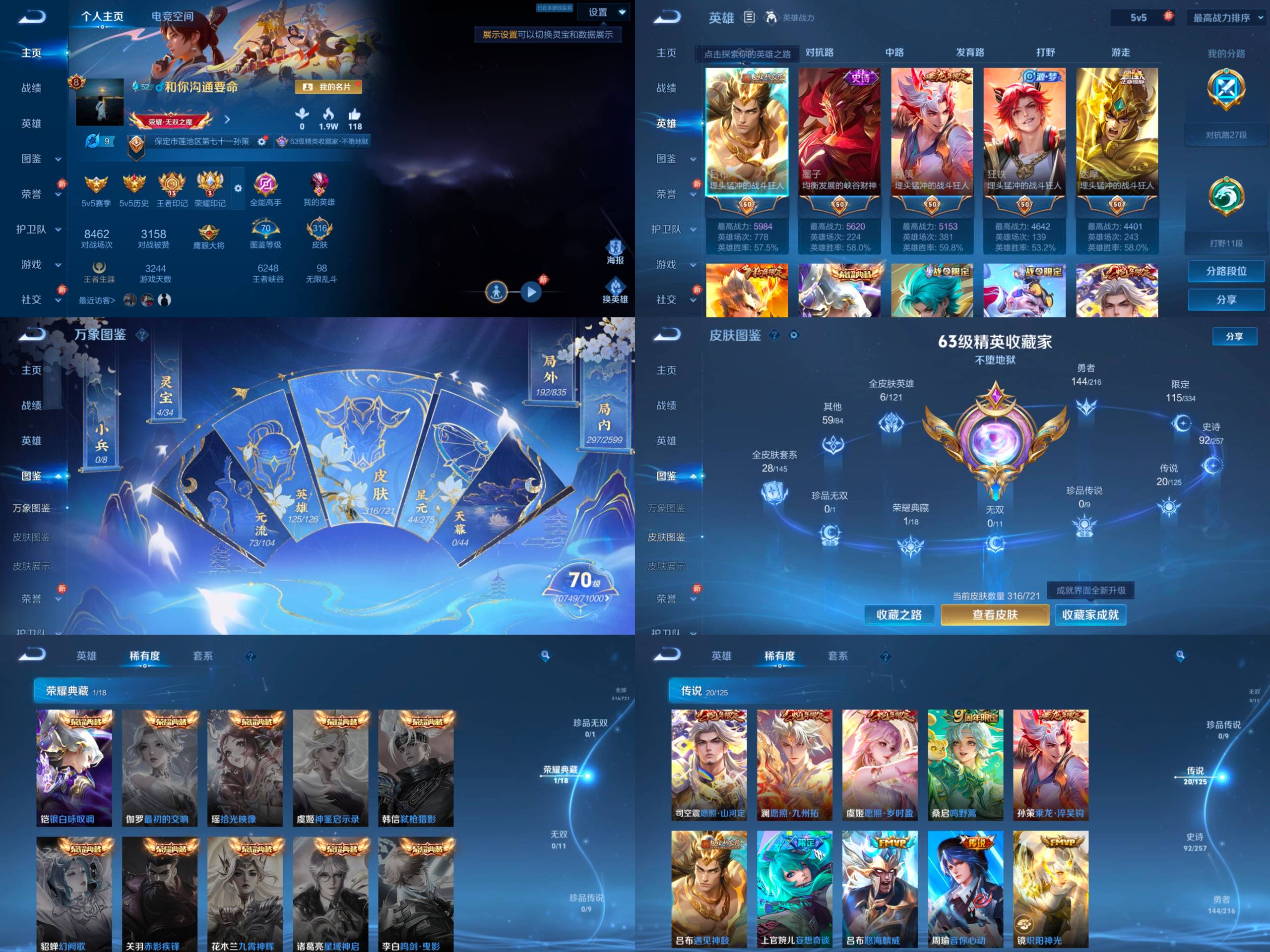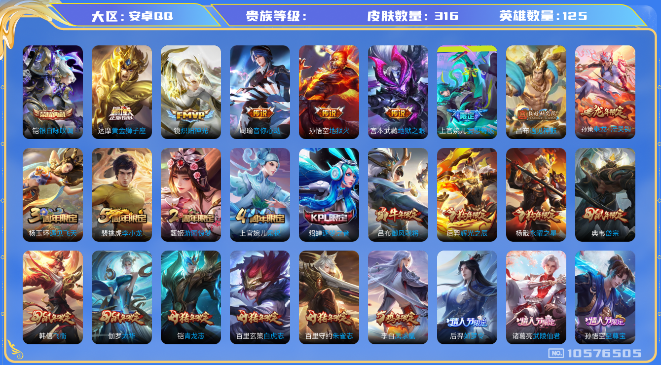 - [10106667]王者荣耀-安卓QQ 贵6 星元皮肤1 传说皮肤6 史诗皮肤30 皮肤数量124 皮肤价值:85516 英雄124 永恒钻石III 总场次2846 【内测皮肤】1 姬小满_妄想食味【星元皮肤】1 未来机甲 【传说皮肤】6 云缨_幻光神枪 妲己_愿照众生和 司空震_愿照山河定 澜_愿照九州拓 桑启_鸣野蒿 李信_一念神魔 【史诗皮肤】30 后羿_石田雨龙 孙膑_茶境仙 阿轲_化蝶舞 狂铁_龙之律动 狄仁杰_魔术师 赵云_皇家上将 铠_曙光守护者 花木兰_水晶猎龙者 阿古朵_江河有灵 上官婉儿_梁祝 钟馗_乐园奇幻夜 不知火舞_魅语 白起_星夜王子 程咬金_功夫厨神 安琪拉_心灵骇客 兰陵王_暗隐猎兽者 夏侯惇_乘风破浪 刘邦_德古拉伯爵 貂蝉_圣诞恋歌 宫本武藏_鬼剑武藏 廉颇_地狱岩魂 露娜_紫霞仙子 吕布_圣诞狂欢 墨子_金属风暴 孙尚香_水果甜心 王昭君_偶像歌手 元歌_无心 嫦娥_拒霜思 狄仁杰_鹰眼统帅 【其他皮肤】88 白起_死霸装 姬小满_小满鸭 戈娅_玫蓝誓约 马超_访茗客 明世隐_景韶洛都 少司缘_灵卦秘语 西施_雪境奇遇 太乙真人_谧流熔炉 典韦_铁骨偃魂 影_魅影绮裳 苍_苍林狼骑 干将莫邪_雾都夜雨 苍_维京掠夺者 东皇太一_噬灭天穹 盘古_敬我三分 姜子牙_天穹之誓 周瑜_熔金海岸 杨戬_破阵退雄兵 刘邦_剑破天穹 貂蝉_长夏之忆 扁鹊_无尽旅途 铠_龙域领主 露娜_命运加冕 钟馗_虚灵犬护 张良_灵野札记 苏烈_春野闲踪 阿古朵_布丁狗之约 项羽_海滩派对 鬼谷子_天穹祈灯 张良_古海寻踪 鲁班大师_探海日志 裴擒虎_擒涛扼浪 桑启_海盐诗旅 沈梦溪_大漠名商 兰陵王_金庭之子 李元芳_云中旅人 达摩_沙漠行僧 苏烈_千军破阵 程咬金_演武夺筹 太乙真人_劲辣红锅 鲁班大师_乓乓大师 狂铁_特工战影 姜子牙_炽热元素使 甄姬_花好人间 张飞_五福同心 廉颇_功夫炙烤 嫦娥_漠中幻影 亚连_破局者 刘禅_秘密基地 哪吒_次元突破 吕布_野性能量 明世隐_虹云星官 老夫子_功夫老勺 钟无艳_海滩丽影 花木兰_兔女郎 达摩_拳王 安琪拉_玩偶对对碰 达摩_大发明家 典韦_黄金武士 韩信_教廷特使 赵云_忍炎影 赵云_白执事 妲己_少女阿狸 露娜_哥特玫瑰 亚瑟_死亡骑士 李白_敏锐之力 狄仁杰_阴阳师 暃_碧珀绯影 云缨_赤焰之缨 澜_孤猎 蒙恬_秩序猎龙将 镜_冰刃幻境 西施_归虚梦演 马超_幸存者 曜_归虚梦演 猪八戒_年年有余 李信_灼热之刃 元歌_午夜歌剧院 公孙离_花间舞 女娲_尼罗河女神 干将莫邪_第七人偶 马可波罗_激情绿茵 曹操_超能战警 貂蝉_异域舞娘 后羿_精灵王 露娜_绯红之刃 鲁班七号_福禄兄弟 张良_一千零一夜