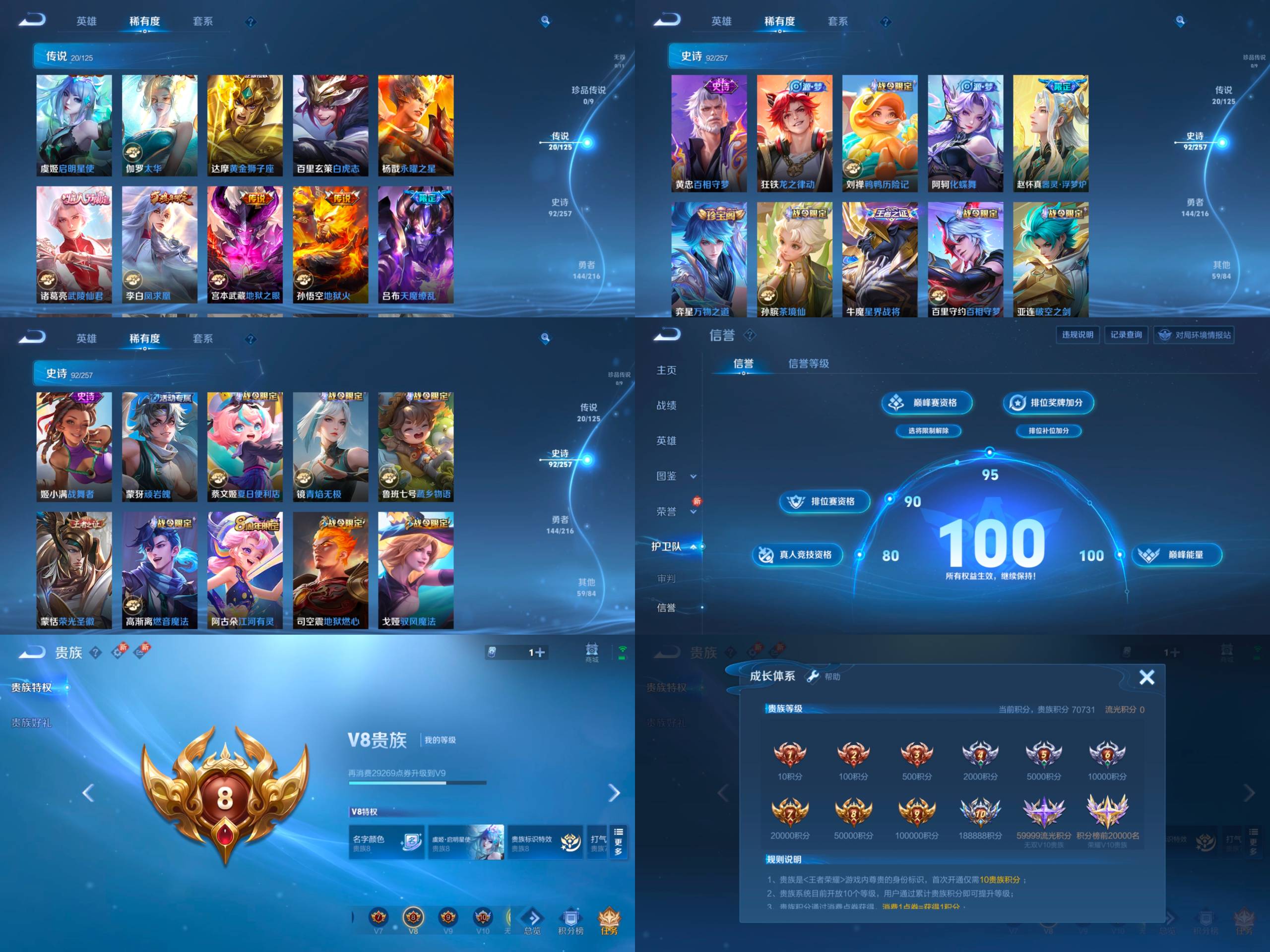 - [11657750]V6 6传说 124英雄 177皮肤 可修改实名 优质装备:地狱火,超时空战士-狄仁杰,诡秘之主 传说皮:九山相柳,幻光神枪 珍宝阁皮:蔷薇恋人,玩趣恶龙 限定皮:鸣野蒿,至尊宝,五谷丰年,李小龙 史诗皮:化蝶舞,星界战将,龙之律动,蒙犽顽岩魄,百相守梦-黄忠,织梦人,千年之狐,偶像歌手,末日机甲-吕布,猫狗日记-孙策,节奏热浪,摇滚巨星,水果甜心,心灵骇客,功夫厨神,鬼剑武藏,纤云弄巧,缤纷独角兽,乘风破浪,圣诞狂欢,鹰眼统帅,无心