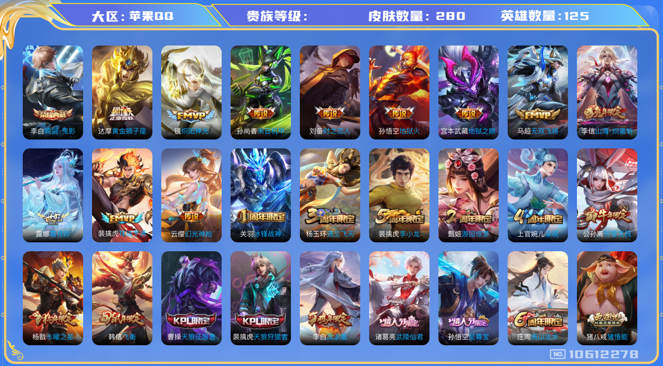 - PX_2023152-贵族等级: V7 英雄数: 122 皮肤数: 163 传说皮: 云鹰飞将,绛天战甲,地狱火,续相思 限定皮: 时雨天司,飞衡,凤求凰,大圣娶亲,默契交锋-花木兰,傲雪梅枪,五谷丰年,鸣野蒿