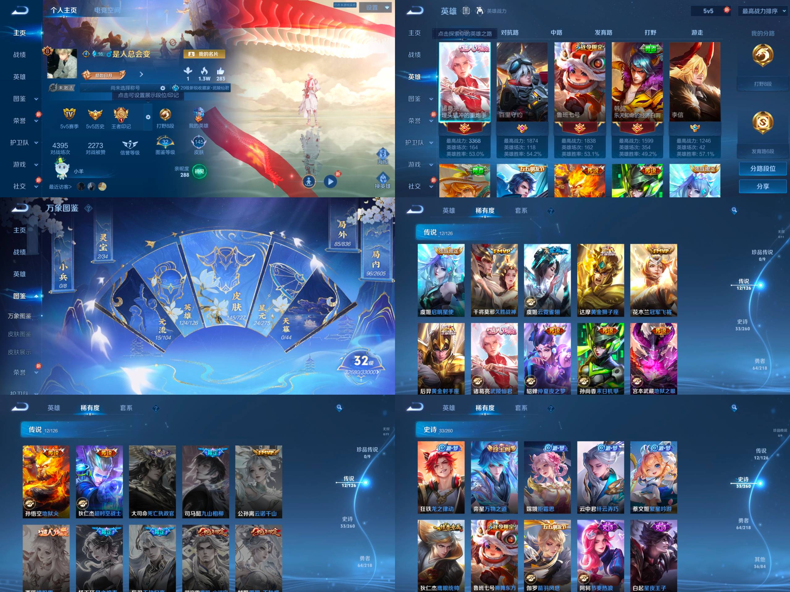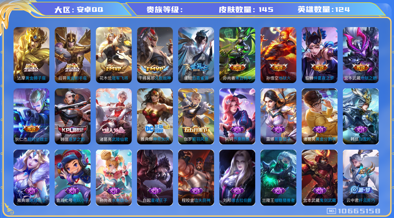 - [11784232]V7 1典藏 1珍品传说 12传说 124英雄 294皮肤 可修改实名 优质装备:弑枪猎影(韩信典藏),怪盗基德,黄金狮子座,冠军飞将,久胜战神,炽阳神光,地狱之眼,炽翼辉光(娃娃菜牛角包),澜逐花归海 珍宝阁皮:妄想食味,蔷薇恋人,玩趣恶龙 限定皮:愿照·岁时盈(虞姬年限),愿照·山河定(司空震年限),愿照·千秋盛(女娲年限),逐霄战戟,鸣野蒿,寅虎·展翼(孙膑年限),玄嵩(庄周年限),高山流水,怒海麟威,五谷丰年,天狼运算者,游园惊梦,梁祝,虎魄,李小龙,猪悟能,美猴王,匿光启智者 史诗皮:器灵·浮梦炉,灵蛊蚀心,星界战将,谪仙醉月,龙之律动,藏狐·褐绒,石田雨龙,破空之剑,战舞者,东方月初,芈月浮光幕影,琥珀纪元伽罗,蔬乡物语(鲁班七号),遇见神鹿,白龙吟,特工魅影,千年之狐,江河有灵,百解令(蒙犽),高渐离燃音魔法,蒙恬荣光圣徽,偶像歌手,电玩·爆裂旋风,龙骑士(小龙虾),末日机甲-吕布,猫狗日记-孙策,猫狗日记-大乔,时之恋人-孙尚香,乱世虎臣,节奏热浪,修罗,女仆咖啡,摇滚巨星,水果甜心,天才门将,星夜王子,心灵骇客,功夫厨神,德古拉伯爵,暗隐猎兽者,幽灵船长,鬼剑武藏,暗渊魔法,心灵战警,地狱岩魂,纤云弄巧,繁星吟游(呼啦呼啦),乘风破浪,逐浪之夏,月团寄思,水晶猎龙者,曙光守护者,金属风暴,原初追逐者,圣诞狂欢,圣诞恋歌,鹰眼统帅,黎明之约,未来纪元-赵云1