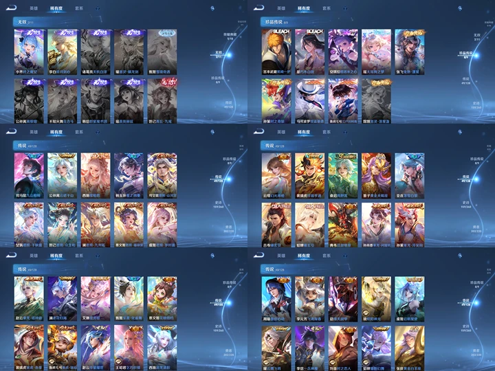 虞姬凯尔特女王,白起狰,太乙真人饕餮,曹操烛龙,芈月重明,典韦穷奇,狂铁御狮,米莱狄御霄,牛魔御旌,夏侯惇朔风刀,明世隐疑决卦,老夫子醍醐杖,鬼谷子原初探秘者,狄仁杰万华元夜,程咬金演武夺筹,钟馗驱傩正仪,苏烈千军破阵,吕布猎兽之王,嬴政白昼王子,女娲朔望之晖,典韦蓝屏警告,钟馗神迹守卫,鲁班七号狮舞东方,沈梦溪星空之诺,李元芳银河之约,刘邦夺宝奇兵,马可波罗暗影游猎,蒙犽狂想玩偶喵,元歌云间偶戏,弈星混沌棋,达摩沙漠行僧,兰陵王金庭之子,沈梦溪大漠名商,李元芳云中旅人,桑启海盐诗旅,裴擒虎擒涛扼浪,鲁班大师探海日志,张良古海寻踪,项羽苍威无极,镜青焰无极