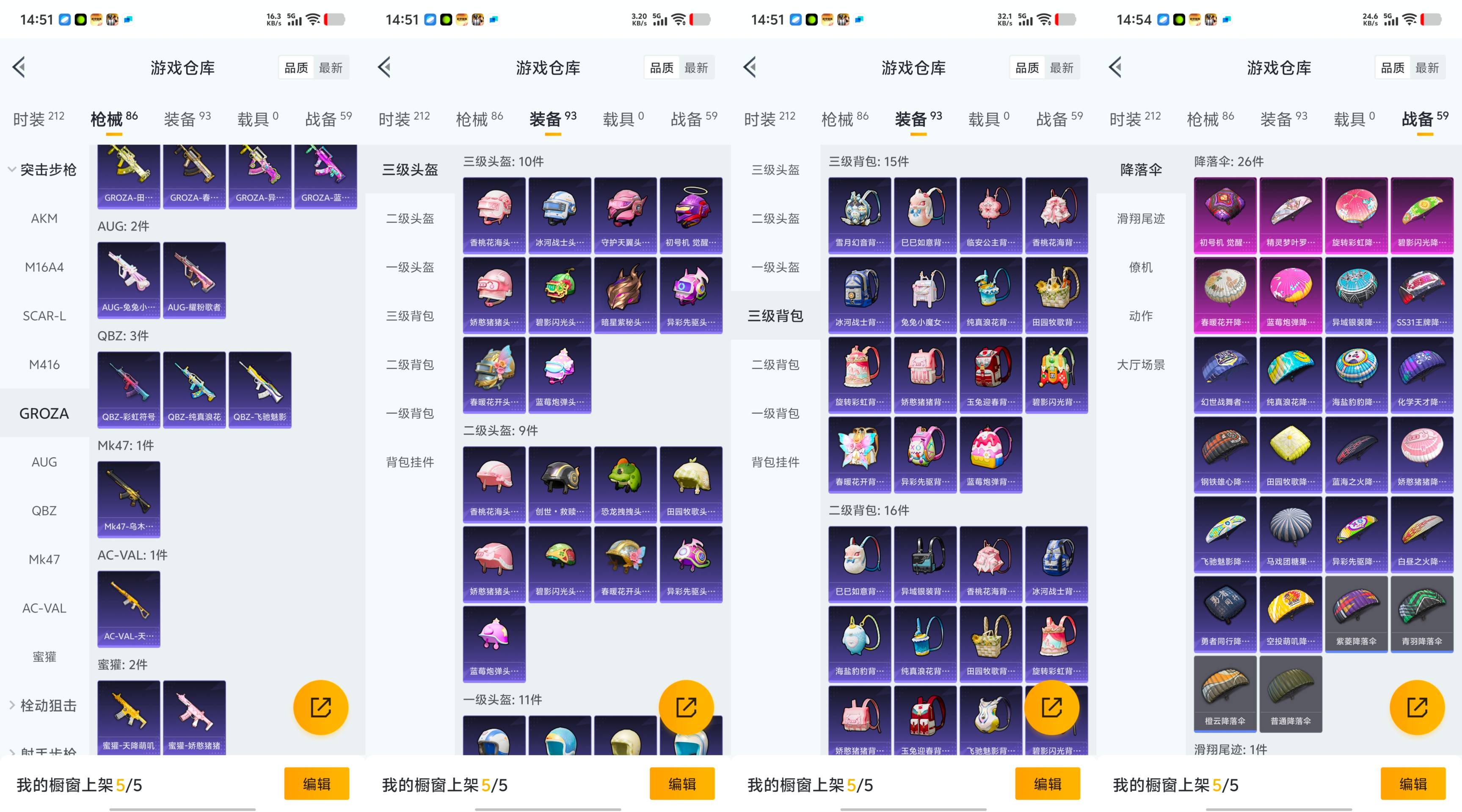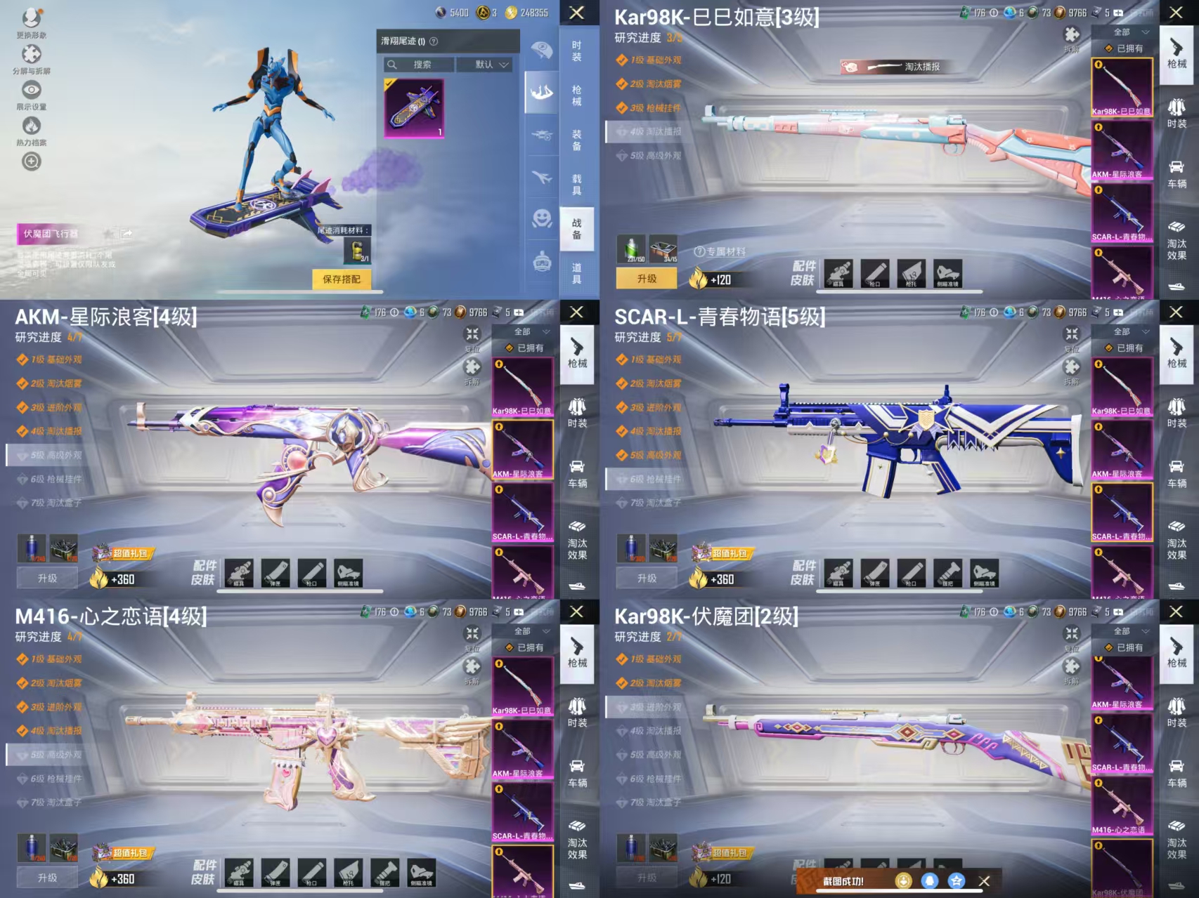 Kar98K-巳巳如意,M416-心之恋语,Kar98K-伏魔团,SCAR-L-青春物语,AKM-星际浪客