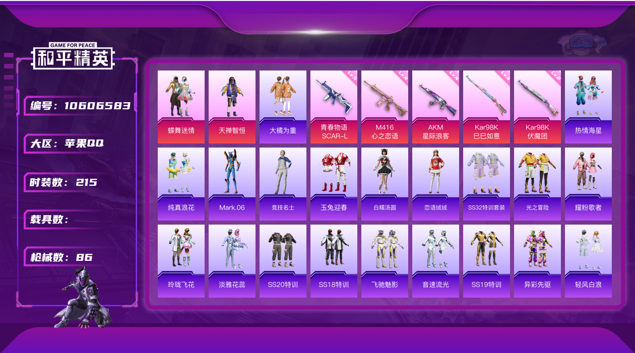 - PX_2114356-实名: 可修改 时装数: 344 载具数: 3 枪械数: 100 战备数: 79 热门装扮: 蝶舞迷情,深海曼妙,浪漫波比,万圣娃娃,爱崽白熊,PEL轰鸣竞梦者,冰霜白皇,暗星紫秘,紫电风暴,赤焰黑爵,冷魅冰骑,大橘为重,罗小黑,暗夜魅影 载具: 特斯拉Model 3(冷光银),阿斯顿·马丁DBX(橙),路特斯ELETRE(冰川蓝) 稀有枪皮: M24暗星紫秘,M762冷魅冰