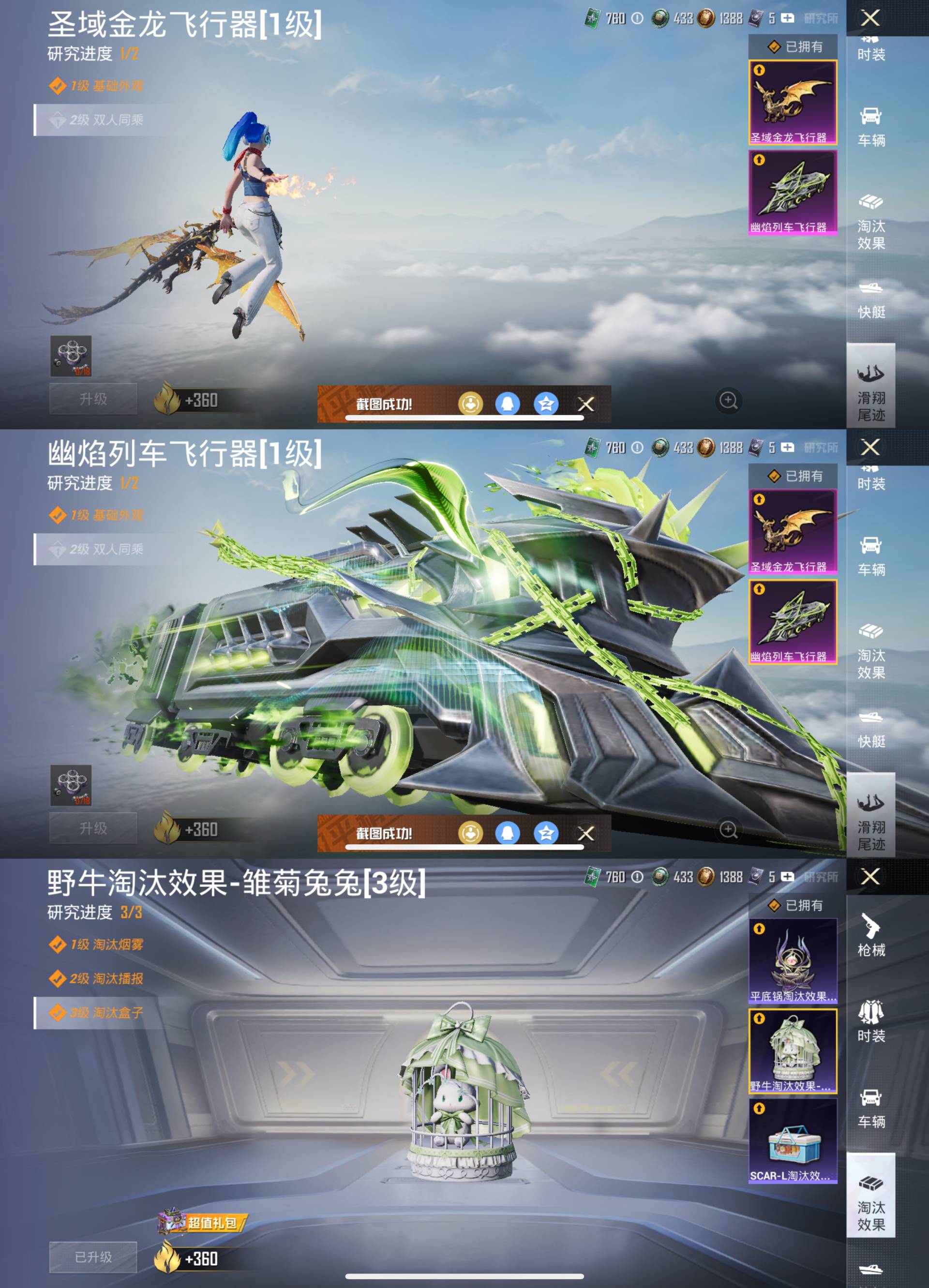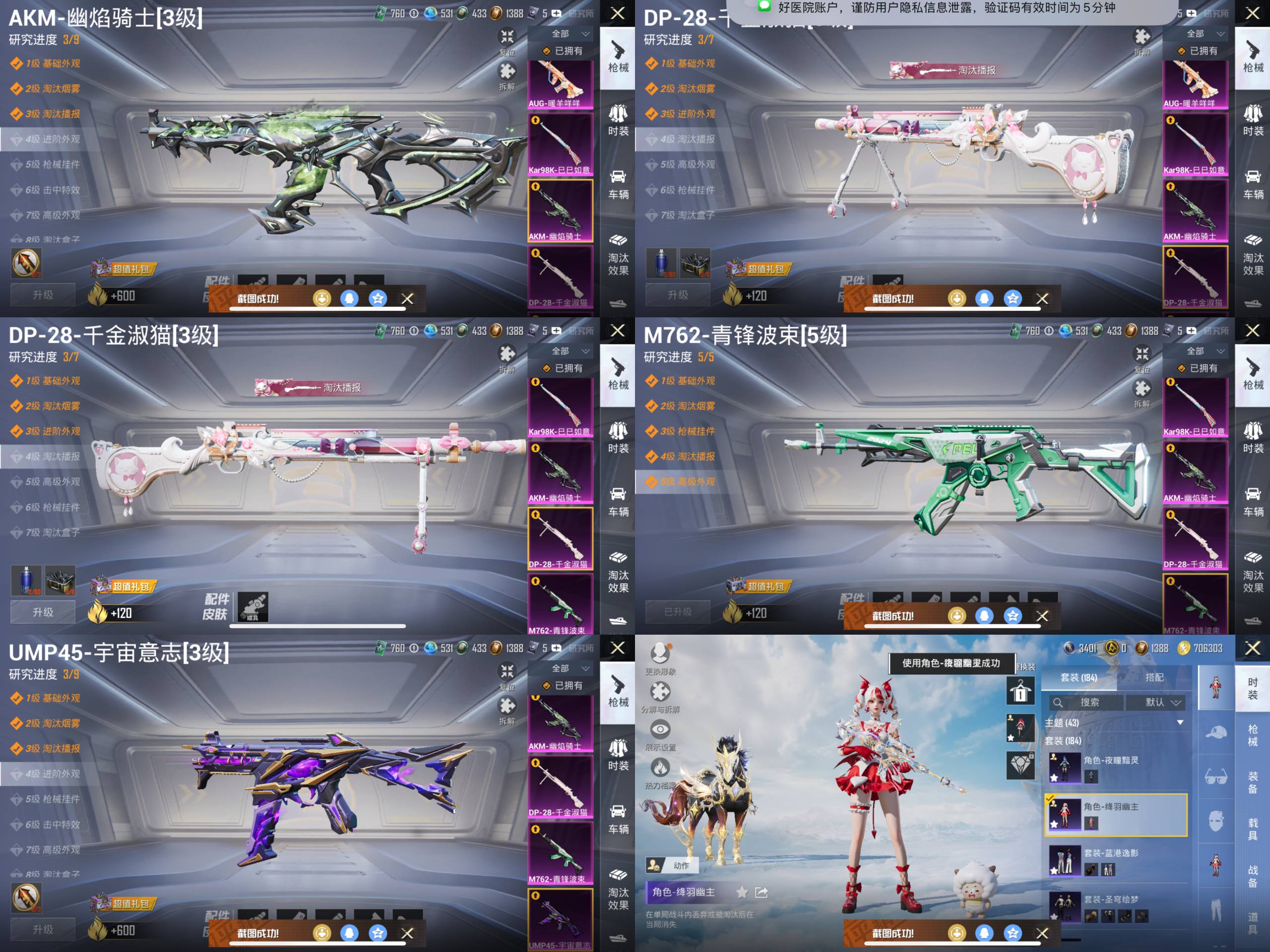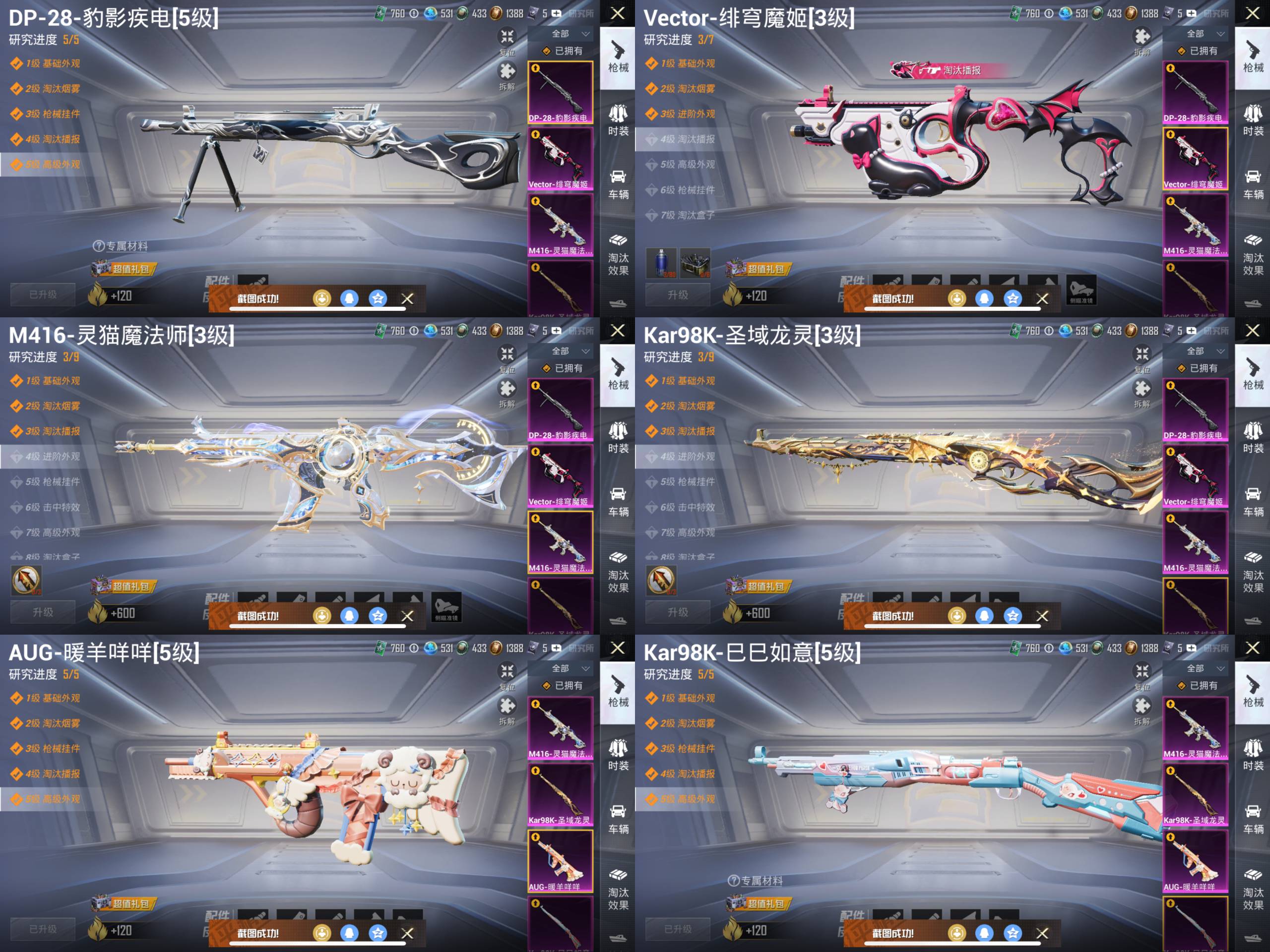UMP45-宇宙意志,M762-青锋波束,AKM-幽焰骑士,DP-28-千金淑猫,Kar98K-巳巳如意,AUG-暖羊咩咩,Kar98K-圣域龙灵