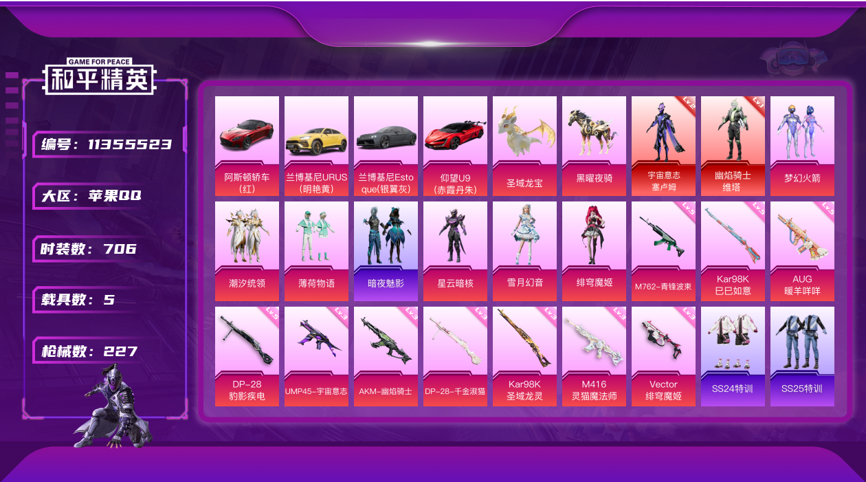 [11355523]WBDS0062 苹果Q 184套装 227枪皮 2神装7粉装9特效枪6载具 幽焰骑士-维塔 (1级) 宇宙意志-塞卢姆 (2级) 仰望U9(赤霞丹朱) 兰博轿车灰色 兰博SUV黄色 阿斯顿马丁S红色 黑曜夜骑 圣域龙宝僚机梦幻火箭 奇迹舞步美琪 绯穹魔姬 雪月幻音 星云暗核 潮汐统领 薄荷物语 M416-灵猫魔法师 (3级) AKM-幽焰骑士 (3级) UMP45-宇宙意志 (3级) Kar98K-圣域龙灵 (3级) Kar98K-巳巳如意 (5级) M762-青锋波束 (5级) DP-28-千金淑猫 (3级) DP-28-豹影疾电 (5级) AUG-暖羊咩咩 (5级) 深渊漩涡飞行器 龟仙人 雪山精英 青龙圣者 静谧青瓷 破蛋小黄鸡 极速红龙 英勇保护者 AKM-奇异狩猎者 M762-奇异狩猎者 M24-奇异狩猎者 梦幻火箭头盔 深海小丑鱼头盔 金羽特工头盔 梦幻火箭背包 古堡领主背包 心之恋语背包 马卡龙背包