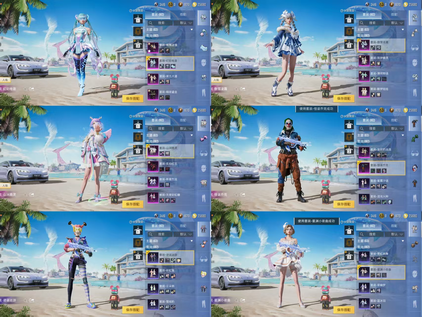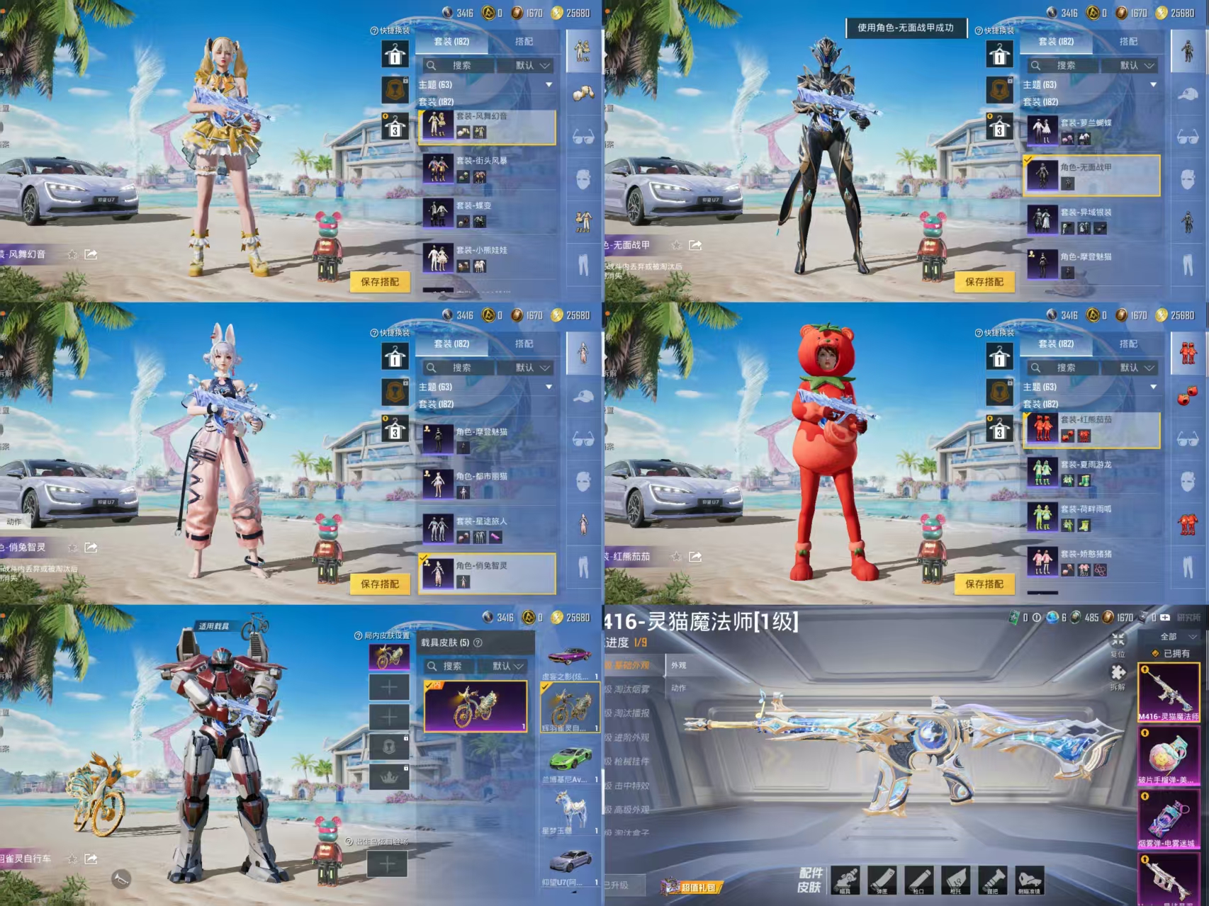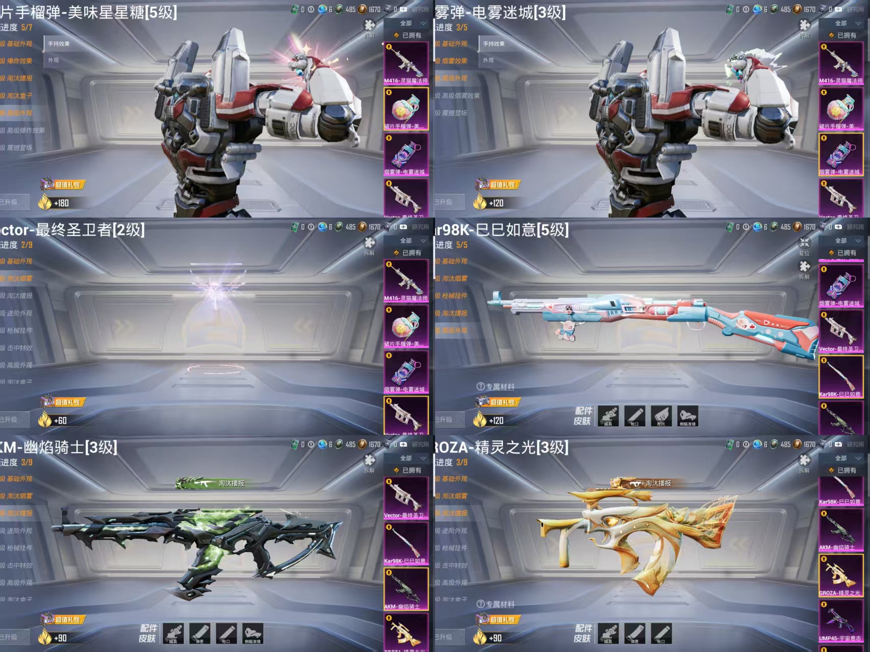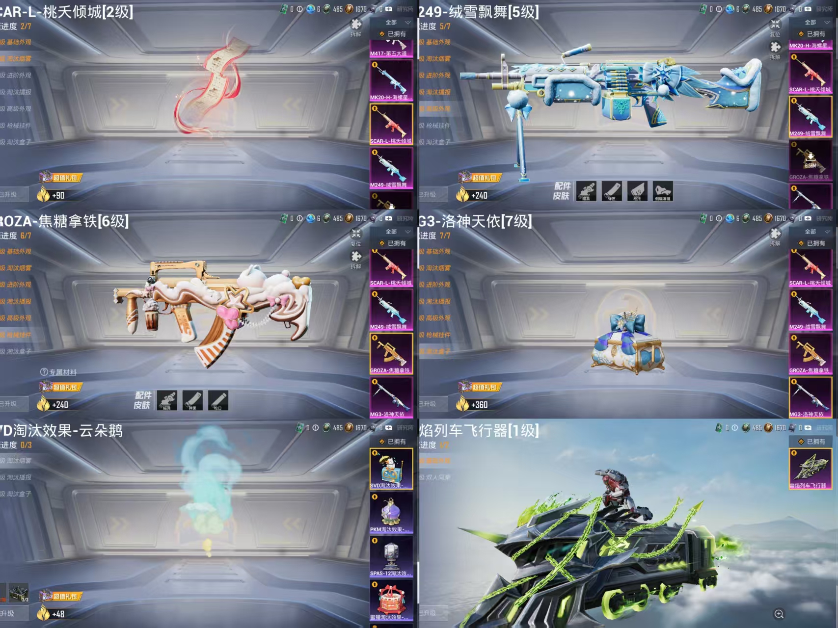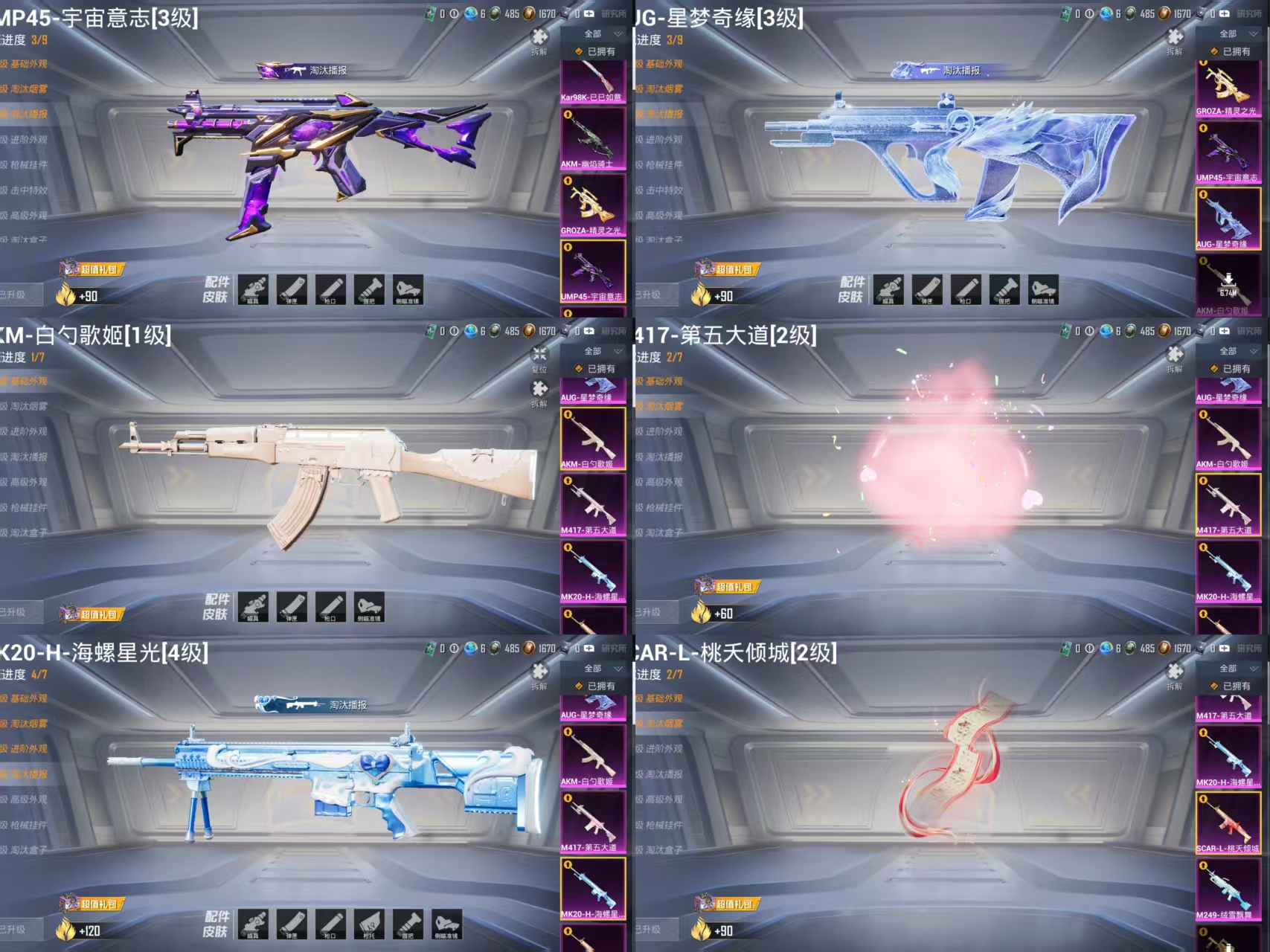 GROZA-精灵之光,Kar98K-巳巳如意,AUG-星梦奇缘,UMP45-宇宙意志,AKM-幽焰骑士,MG3-洛神天依,GROZA-焦糖拿铁,AKM-白勺歌姬,M249-绒雪飘舞,SCAR-L-桃夭倾城,MK20-H-海螺星光,M417-第五大道