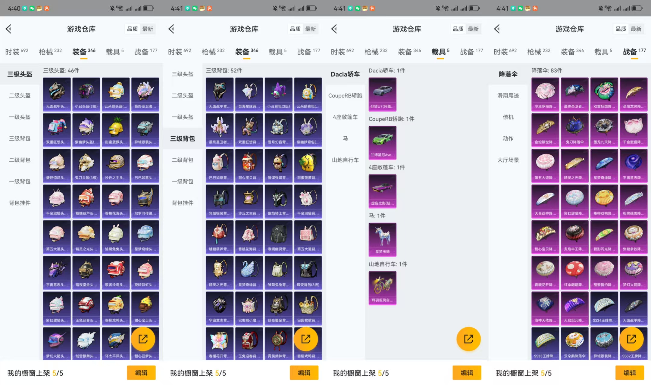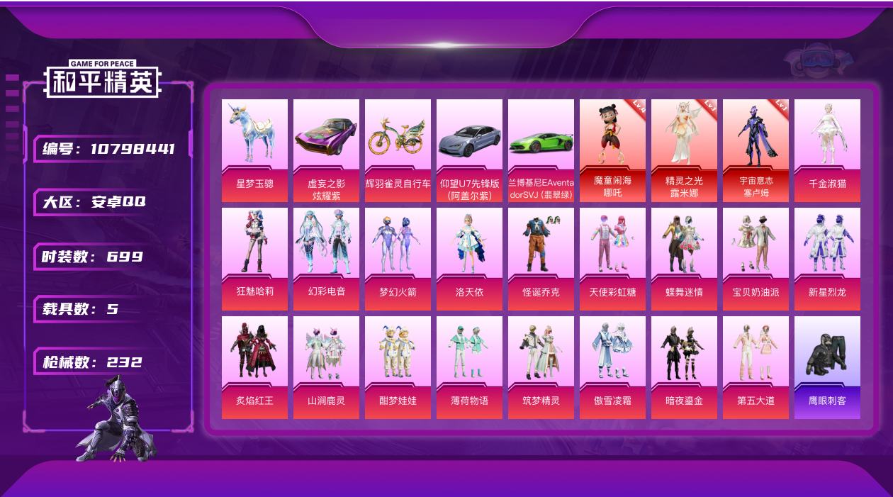 [10798441]WBDS0033 安卓Q【3神装15特效枪18粉装5载具】182套装 232枪皮 魔童闹海-哪吒 (1级) 精灵之光-露米娜 (4级) 宇宙意志-塞卢姆 (1级) 寒蝎幽灵 都市猎人 浪漫天命 派对舞王仰望U7先锋版(阿盖尔紫) 虚妄之影(炫耀紫) 兰博SVJ绿色 星梦玉骢 辉羽雀灵自行车 狂魅哈莉 梦幻火箭 蝶舞迷情 宝贝奶油派 天使彩虹糖 千金淑猫 洛天依 怪诞乔克 酣梦娃娃 幻彩电音 筑梦精灵 第五大道 新星烈龙 暗夜鎏金 炙焰红王 傲雪凌霜 薄荷物语 山涧鹿灵 M416-灵猫魔法师 (1级) AKM-幽焰骑士 (3级) AKM-白勺歌姬 (1级) UMP45-宇宙意志 (3级) Kar98K-巳巳如意 (5级) Vector-最终圣卫者 (2级) AUG-星梦奇缘 (3级) GROZA-精灵之光 (3级) SCAR-L-桃夭倾城 (2级) M417-第五大道 (2级) MG3-洛神天依 (7级) M249-绒雪飘舞 (5级) MK20-H-海螺星光 (4级) GROZA-焦糖拿铁 (6级) 烟雾弹-电雾迷城 (3级) 深渊漩涡飞行器 天之羽翼飞行器红熊茄茄 雪山精英 鹰眼刺客 暗影哥特 团圆交子 瑞龙福将 粉红小猪 狂沙舞者 漫步者 破蛋小黄鸡 英勇保护者 M762-奇异狩猎者 M762-瑞龙福将 S686-奇异狩猎者 Mini14-林间仙鹿 梦幻火箭头盔 甜心宝贝头盔 梦幻火箭背包 折纸暴龙背包 甜心宝贝背包 神秘黑猫背包 古堡领主背包