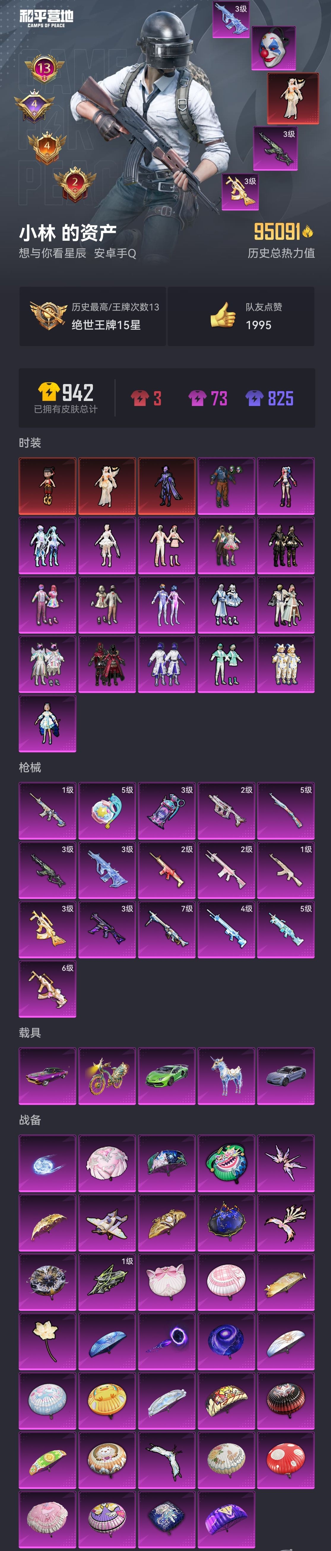 - [8892549]实名: 可修改 时装数: 604 载具数: 4 枪械数: 161 战备数: 100 热门装扮: 梦幻火箭(新101),深海小丑鱼,浪漫波比,梦魇先生,迅捷狂鲨,好奇恐龙,烈焰拳霸,蝶舞蔷薇,葫芦兄弟,暗夜玫瑰,洛天依,紫电风暴,赤焰黑爵,暗夜魅影 载具: 特斯拉Roadster(水滴蓝),特斯拉Roadster(沁心粉),空客H135-蔚蓝之翼,海龙奔腾,兰博基尼Aventador SVJ(翡翠绿) 稀有枪皮: MG3洛神天依,M416五爪金龙,VSS烈焰拳霸,M16A4葫芦兄弟 亮点: 8粉装-4特效-4载具-热力值60320-总套装604-总枪皮161-王牌印记10-历史最高超级王牌17星-粉套-烈焰拳霸,粉套-蝶舞蔷薇,粉套-葫芦兄弟,粉套-暗夜玫瑰,粉套-赤焰黑爵,粉套-紫电风暴-M16A4-葫芦兄弟(4级),M416-五爪金龙(5级),VSS-烈焰拳霸(4级),MG3-洛神天依(4级)-特斯拉Roadster(沁心粉),特斯拉Roadster(水滴蓝),海龙奔腾,兰博基尼Aventador SVJ(翡翠绿)-套装-特训学院,套装-猎鹰,套装-青年教官,套装-橘黑制服,套装-红色运动,套装-黄色运动,套装-蓝色运动,套装-黄色伏地魔,套装-白色伏地魔,套装-黑色伏地魔,套装-冰川格斗者,套装-竞技名士,套装-深蓝色名流,套装-酒红色名流,套装-湖蓝色名流,套装-黄色名流,套装-猛禽,套装-长空猛禽,套装-竞技勇士朋克,套装-蓝色守护者,套装-冷焰舞者,套装-水银刺客,套装-特战装甲,套装-浪漫假日,套装-贵族骑装,套装-甜蜜告白,套装-滨海假日,套装-完美偶像,套装-人气偶像,套装-幻影武者,套装-街头潮人,套装-蓝彩潮人,套装-酷萌兔限定,套装-千禧之恋,套装-怒火燎原,套装-魅力单车,套装-绮丽涂鸦,套装-雪山征服者,套装-坚韧舞者,套装-竞技达人朋克,套装-金羽特工,套装-狂沙舞者,套装-破晓战魂,套装-都市魅力,套装-潮流炫酷,套装-丛林猎人,套装-传奇侦探,套装-极地朋克,套装-摩艾涂鸦,套装-幻世战舞者,套装-金耀舞者,套装-蓝调潮人,套装-暗影哥特