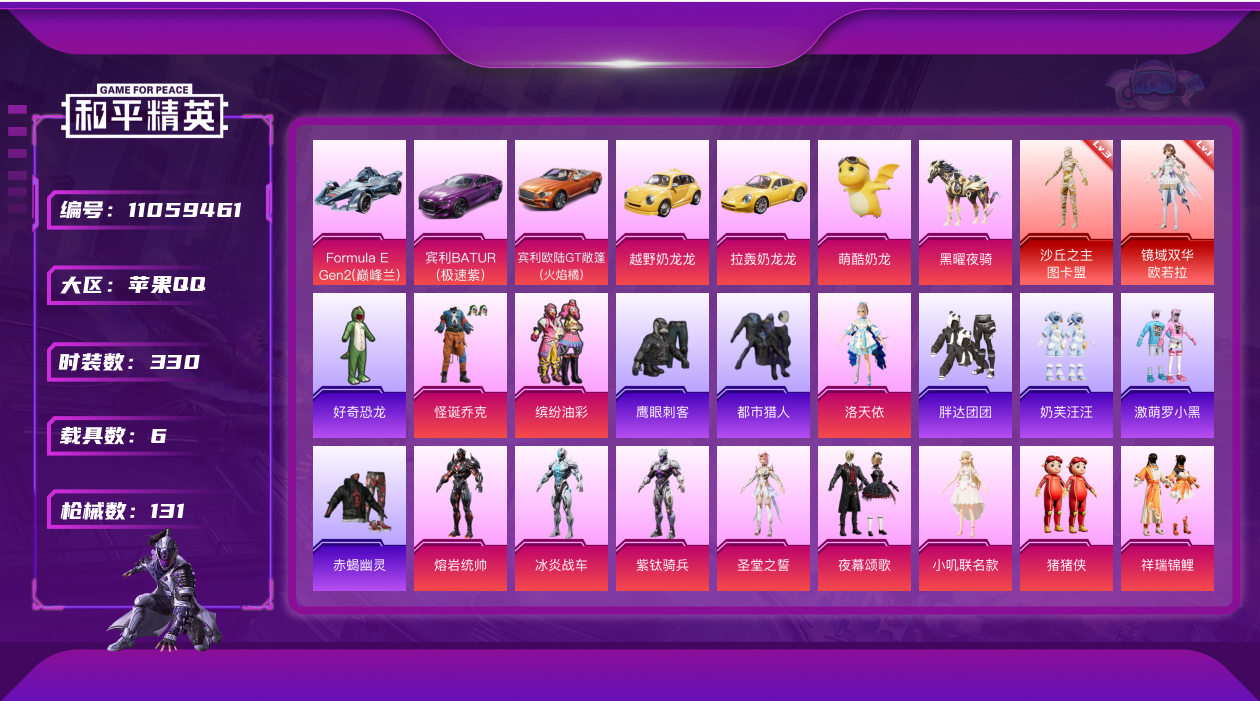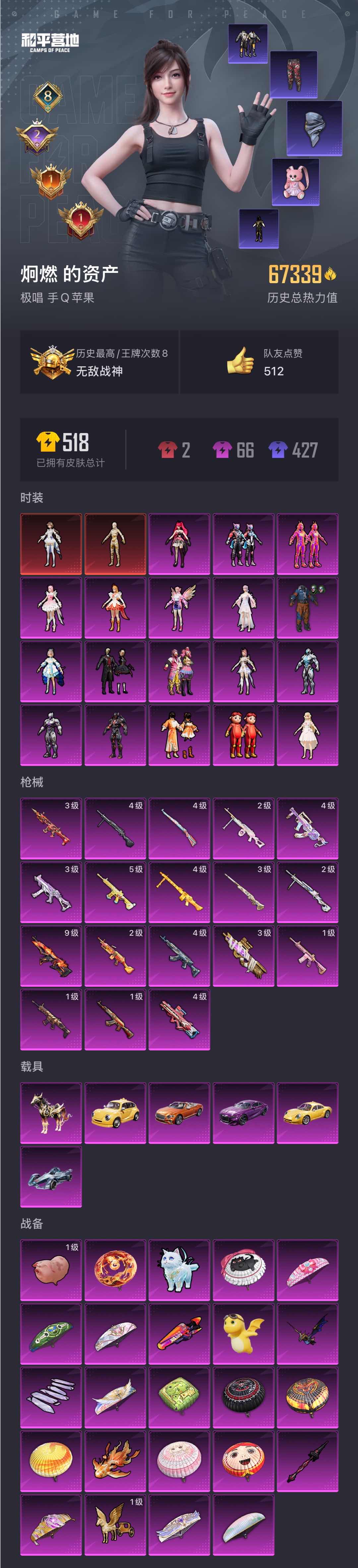 [11059461]WBDS0044 苹果Q 历史无敌战神 94套装 131枪皮 2神装18特效枪7车 镜域双华-欧若拉 (1级) 沙丘之主-图卡盟 (3级) AKM-熔岩统帅 (9级) 宾利BATUR(极速紫) 宾利欧陆GT火焰橘 越野奶龙龙 拉轰奶龙龙 Formula(巅峰兰) 黑曜夜骑 萌酷奶龙僚机 赤蝎幽灵 都市猎人 浪漫天命 圣堂之誓 小蓝 美雪 猪猪侠 绯穹魔姬 脉冲星 洛天依 夜幕颂歌 烟云彩露 小叽联名款 怪诞乔克 冰炎战车 祥瑞锦鲤 霓虹漫游 熔岩统帅 紫钛骑兵 幻影飞狐 缤纷油彩 M416-心之恋语 (1级) SCAR-L-魔童闹海哪吒 (3级) P90-沙丘之主 (3级) Kar98K-巳巳如意 (4级) M249-猪猪侠 (2级) MG3-酷泡奶龙 (4级) DP-28-豹影疾电 (4级) P90-能量风暴 (4级) PKM-江南烟雨 (2级) SCAR-L-天蓬元帅 (1级) M24-镜域双华 (3级) GROZA-巴啦啦小魔仙 (4级) M762-激战未来 (4级) DP-28-圣堂之誓 (2级) M416-暖熊萌萌 (5级) UMP45-玉魂晶魄 (3级) AKM-盖世英雄 (1级) 繁龙极客飞行器 祥瑞锦鲤飞行器 夜幕颂歌飞行器 龟仙人 雪山精英 鹰眼刺客 好奇恐龙 奶芙汪汪 激萌罗小黑 胖达团团 狼队追光队服 狼队战队服 暗影哥特 漫步者 破蛋小黄鸡 萌熊伴侣背包