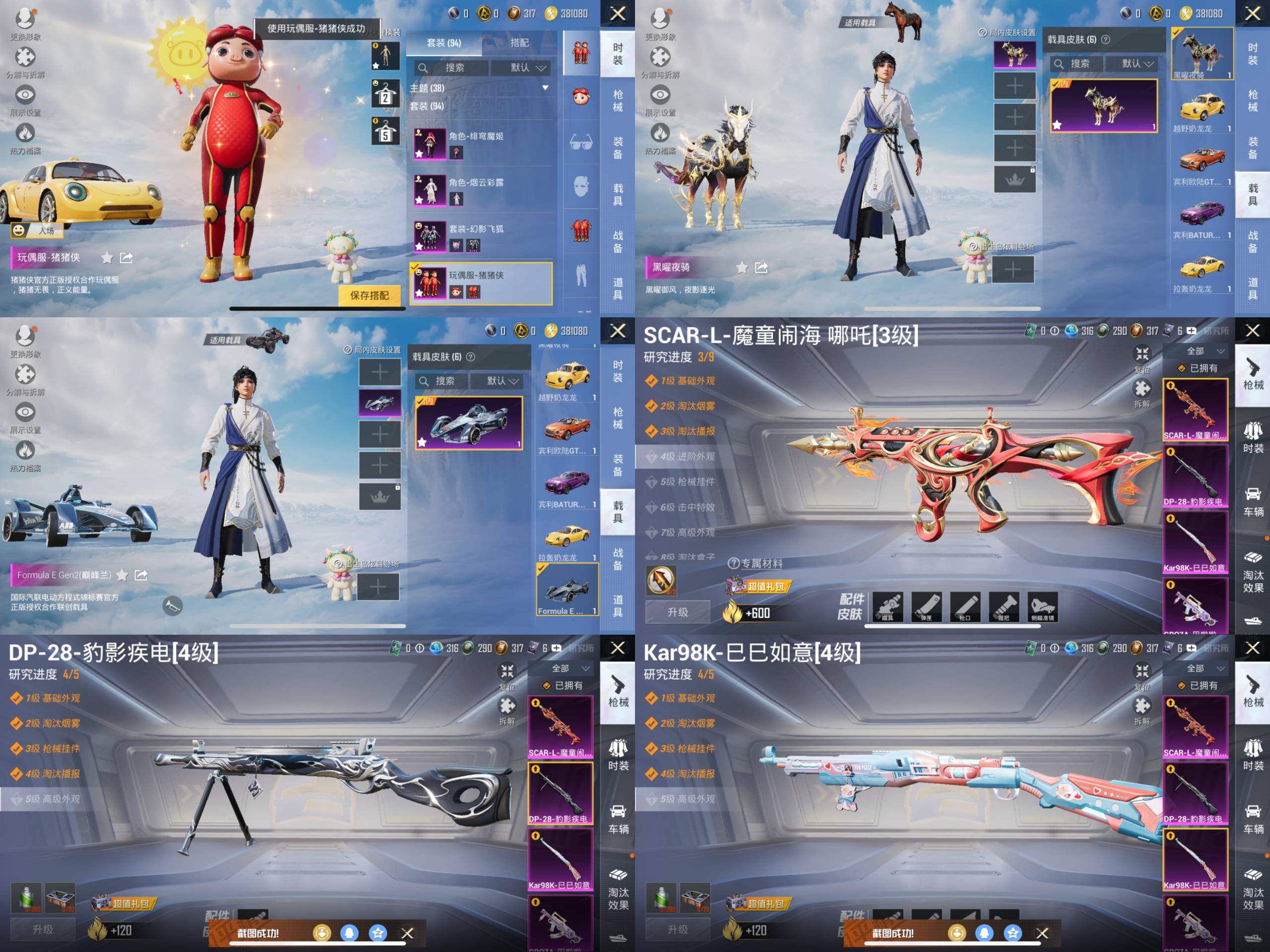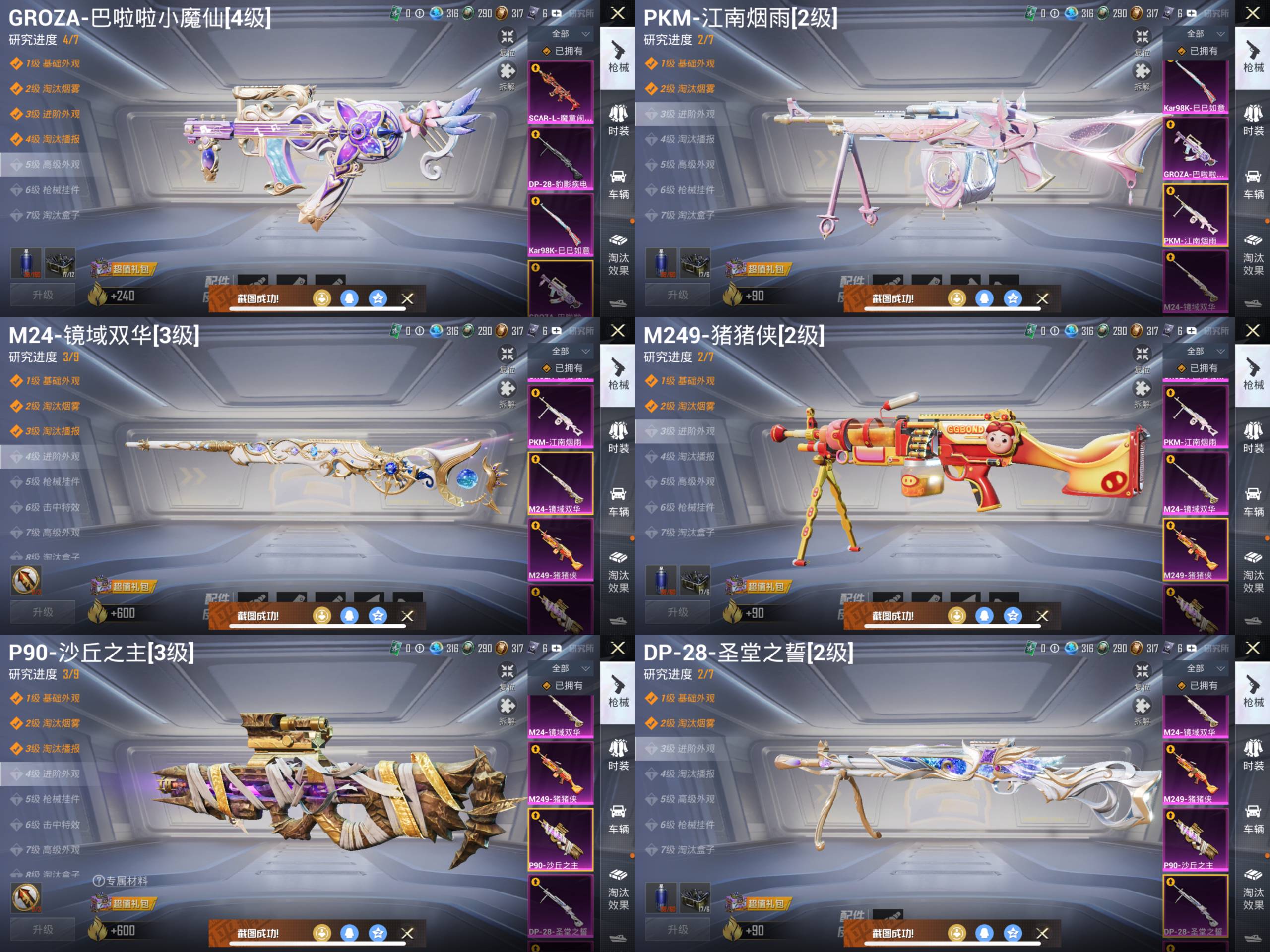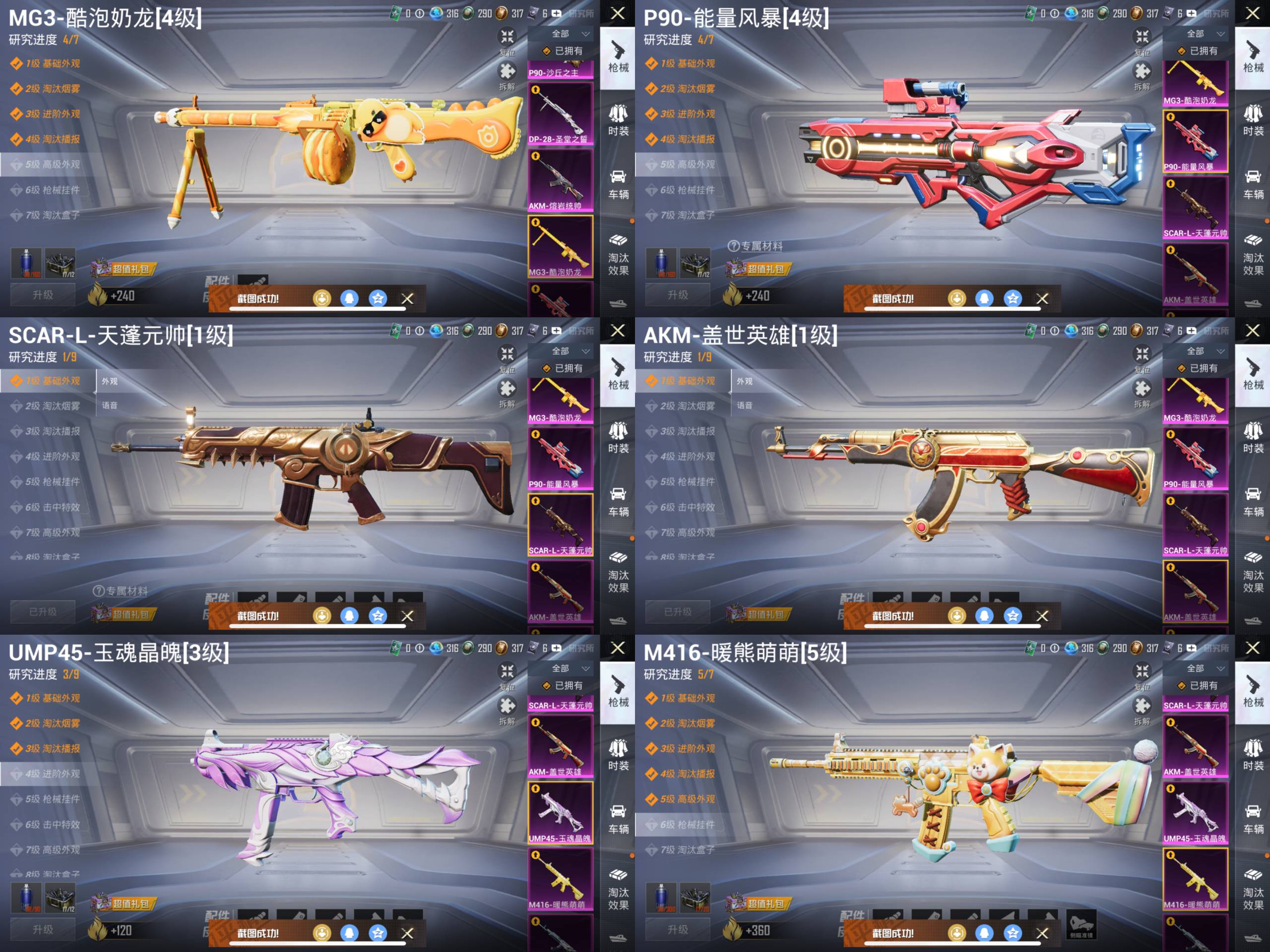 M416-心之恋语,M762-激战未来,M416-暖熊萌萌,UMP45-玉魂晶魄,AKM-盖世英雄,SCAR-L-天蓬元帅,P90-能量风暴,MG3-酷泡奶龙,AKM-熔岩统帅,DP-28-圣堂之誓,P90-沙丘之主,M249-猪猪侠,M24-镜域双华,PKM-江南烟雨,Kar98K-巳巳如意