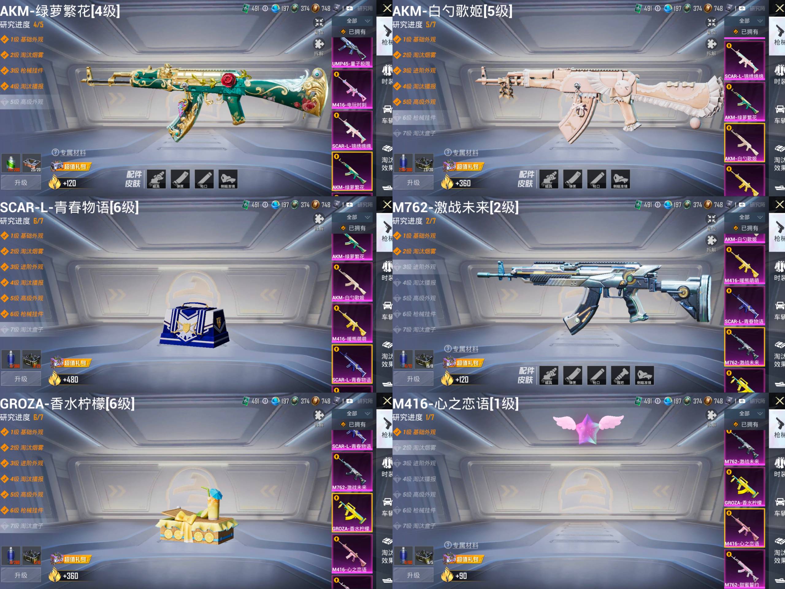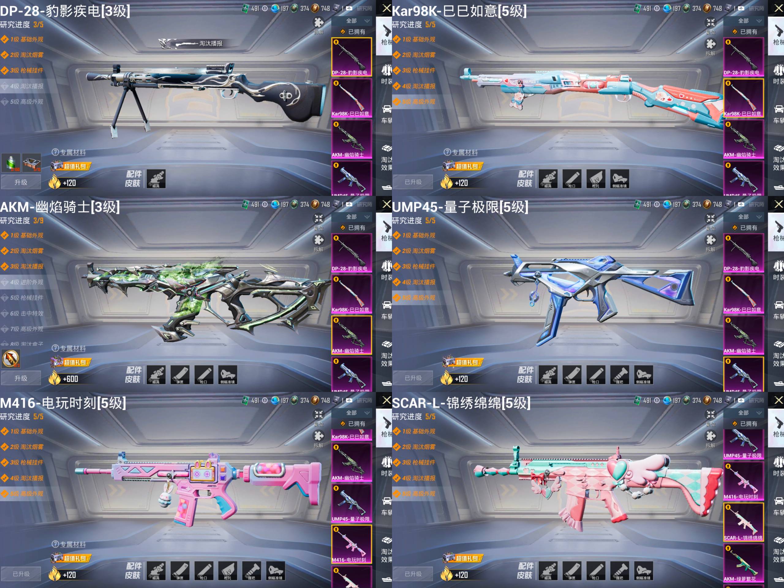 M416-心之恋语,GROZA-香水柠檬,M762-甜蜜誓约,M762-激战未来,SCAR-L-青春物语,AKM-白勺歌姬,M416-暖熊萌萌,AKM-绿萝繁花,SCAR-L-锦绣绵绵,M416-电玩时刻,UMP45-量子极限,AKM-幽焰骑士,Kar98K-巳巳如意