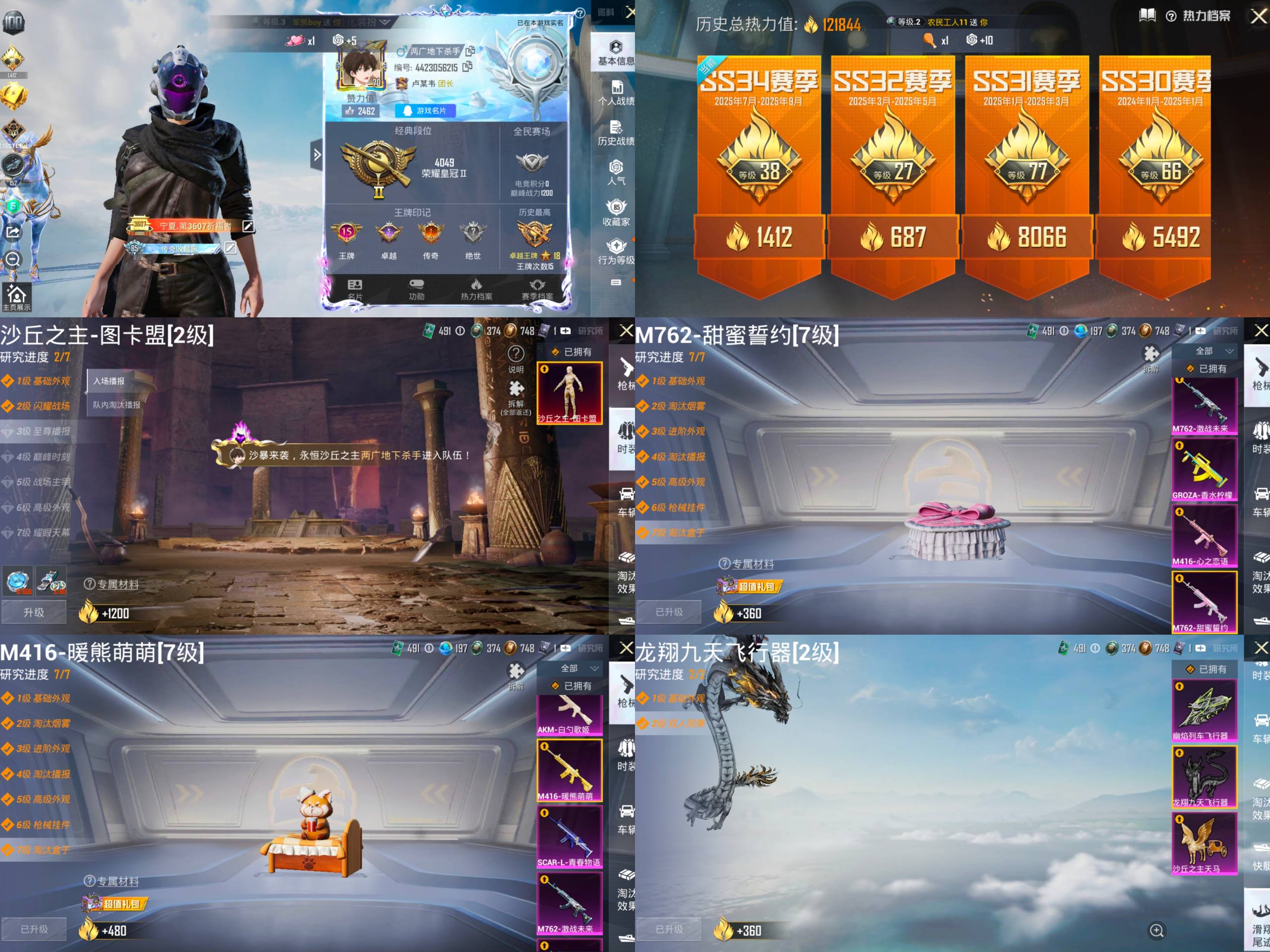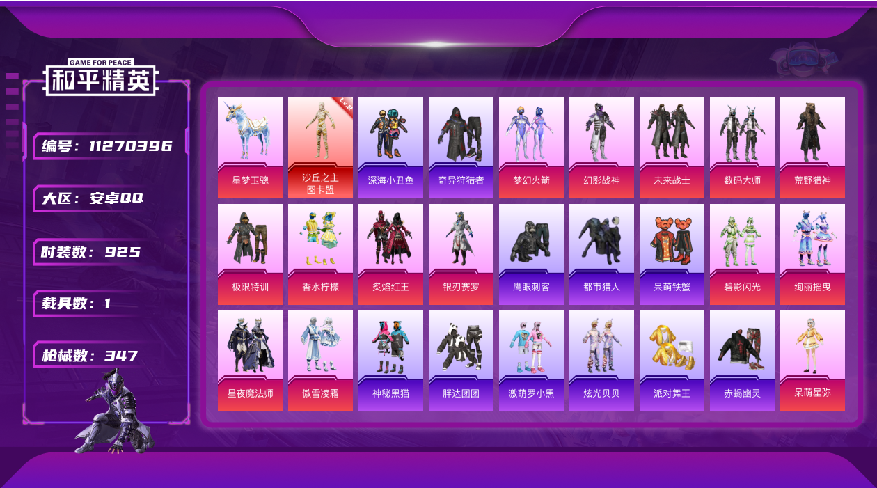 - [10596909]实名: 可修改 时装数: 387 载具数: 1 枪械数: 139 战备数: 106 热门装扮: 锦绣火鲤,猩猩队长,蔷薇星,猪猪侠,守护天翼,未来领航者 载具: 星河领航(磐石银) 稀有枪皮: M416心之恋语,AMR炫光之旅,P90-金丰海韵,Kar98K-巳巳如意