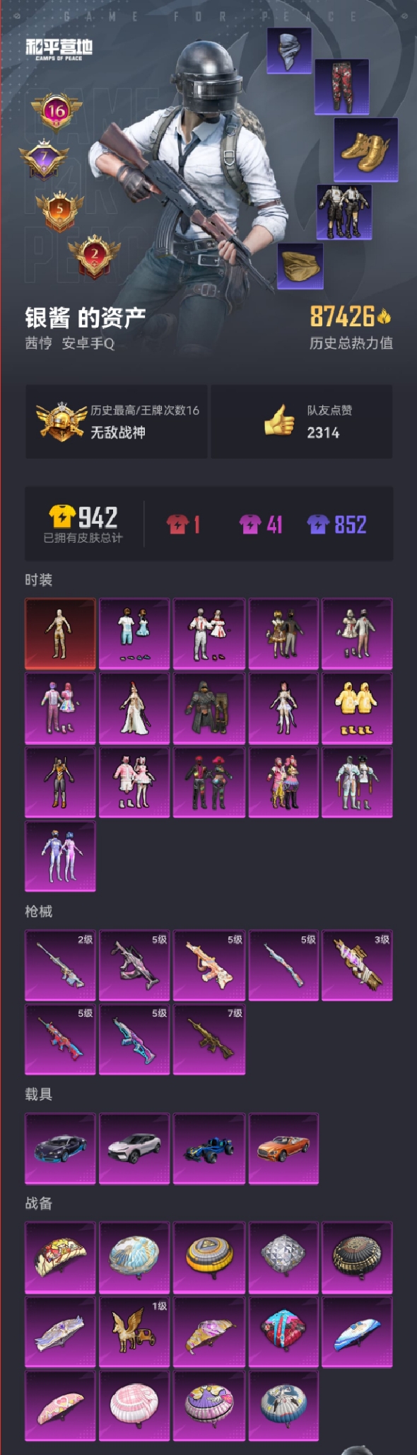 - PX_2056736- 安卓手Q-4王牌印记-10粉装-9特效枪-2载具-77160热力值-152套装-194枪皮-1卓越印记-1传奇印记 【10粉装】,放客神游,新星烈龙,古堡领主,金属狂野,智能音符,彗云及圣,天启纪元,星空之魅,萨利娅,金风玉露 【9特效枪】AKM-炫紫旋律-5级 M416-心之恋语-7级 M416-墨龙九天-1级 GROZA-镜光银凌-5级 AUG-暖羊咩咩-5级 Kar9