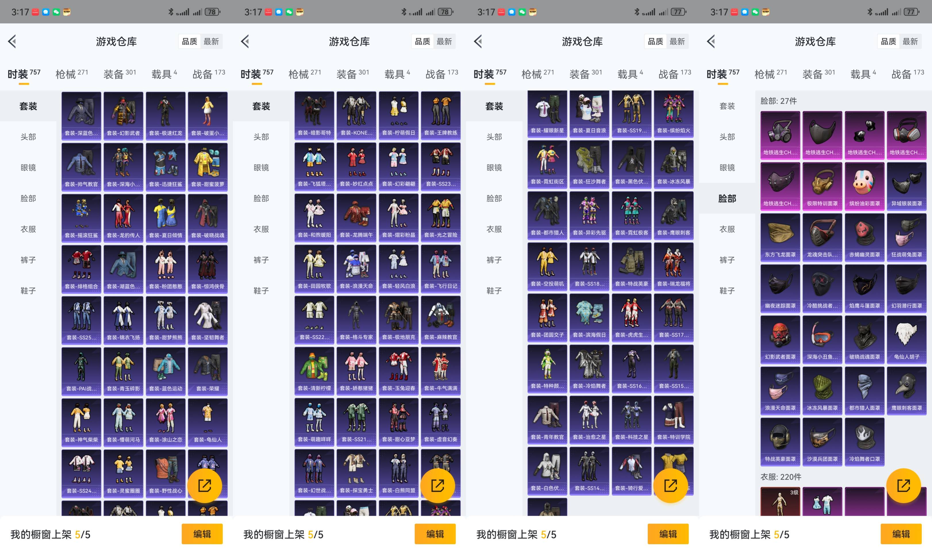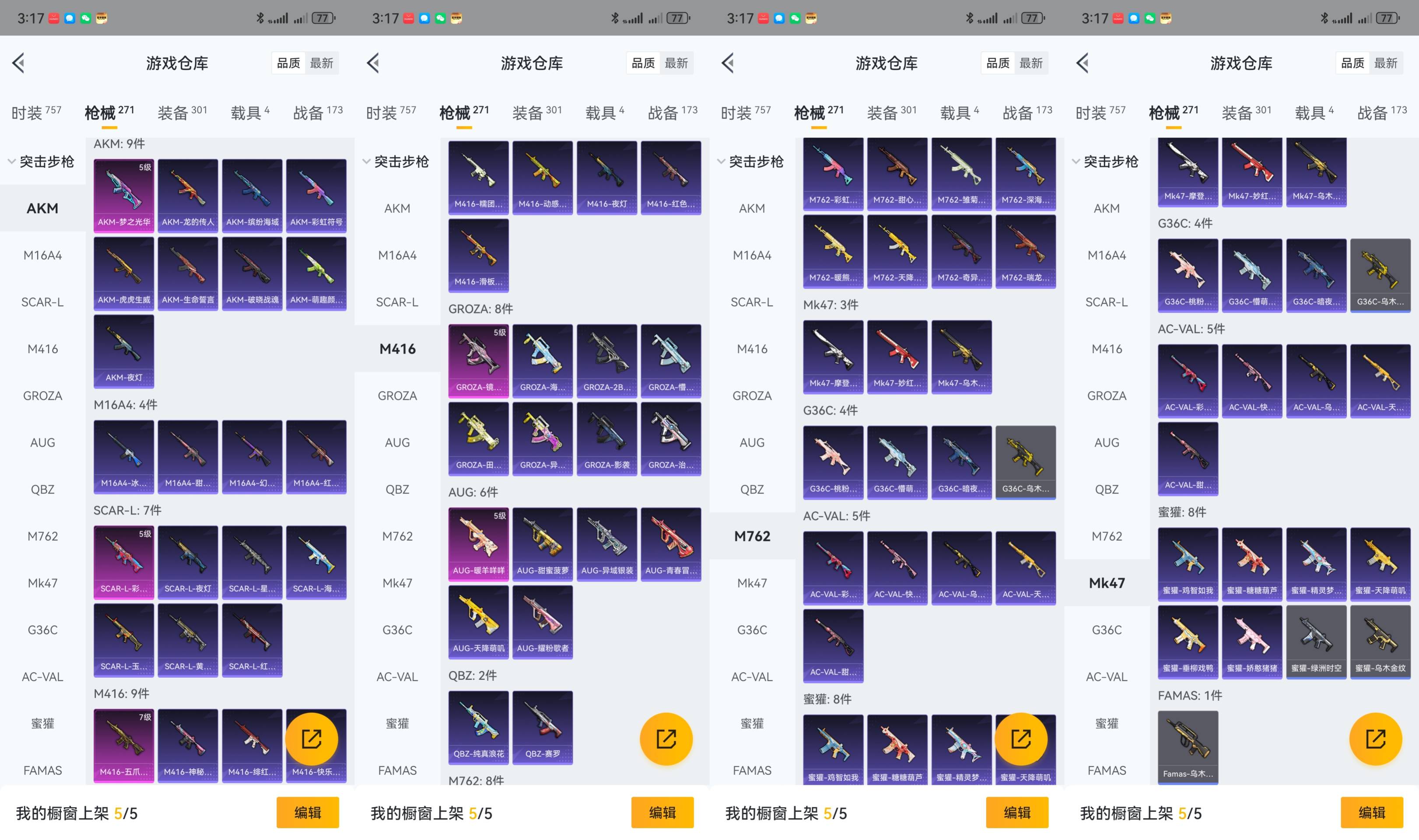 M249-金丰海韵,M762-瑞龙福将,M762-奇异狩猎者,M416-快乐主宰,AKM-缤纷海域