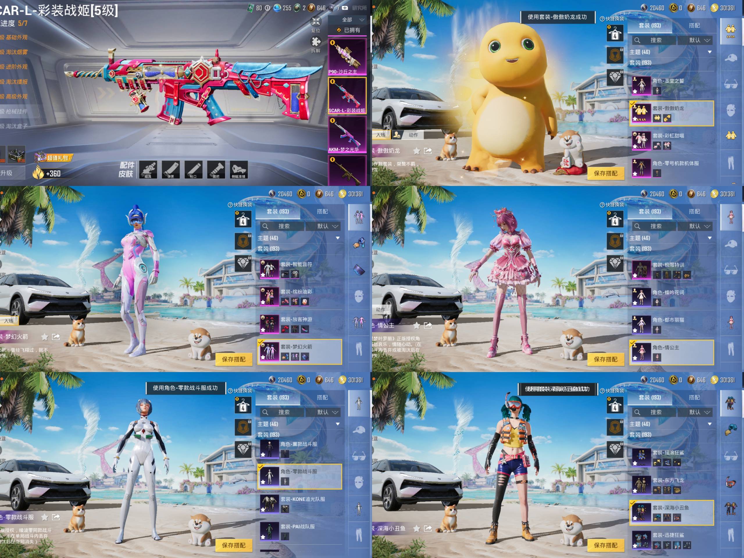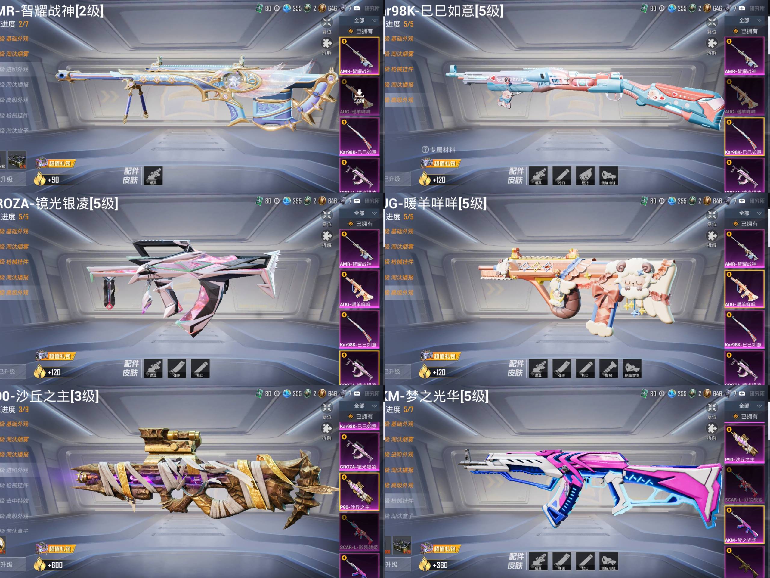 M416-五爪金龙,AKM-梦之光华,SCAR-L-彩装战姬,P90-沙丘之主,GROZA-镜光银凌,Kar98K-巳巳如意,AUG-暖羊咩咩