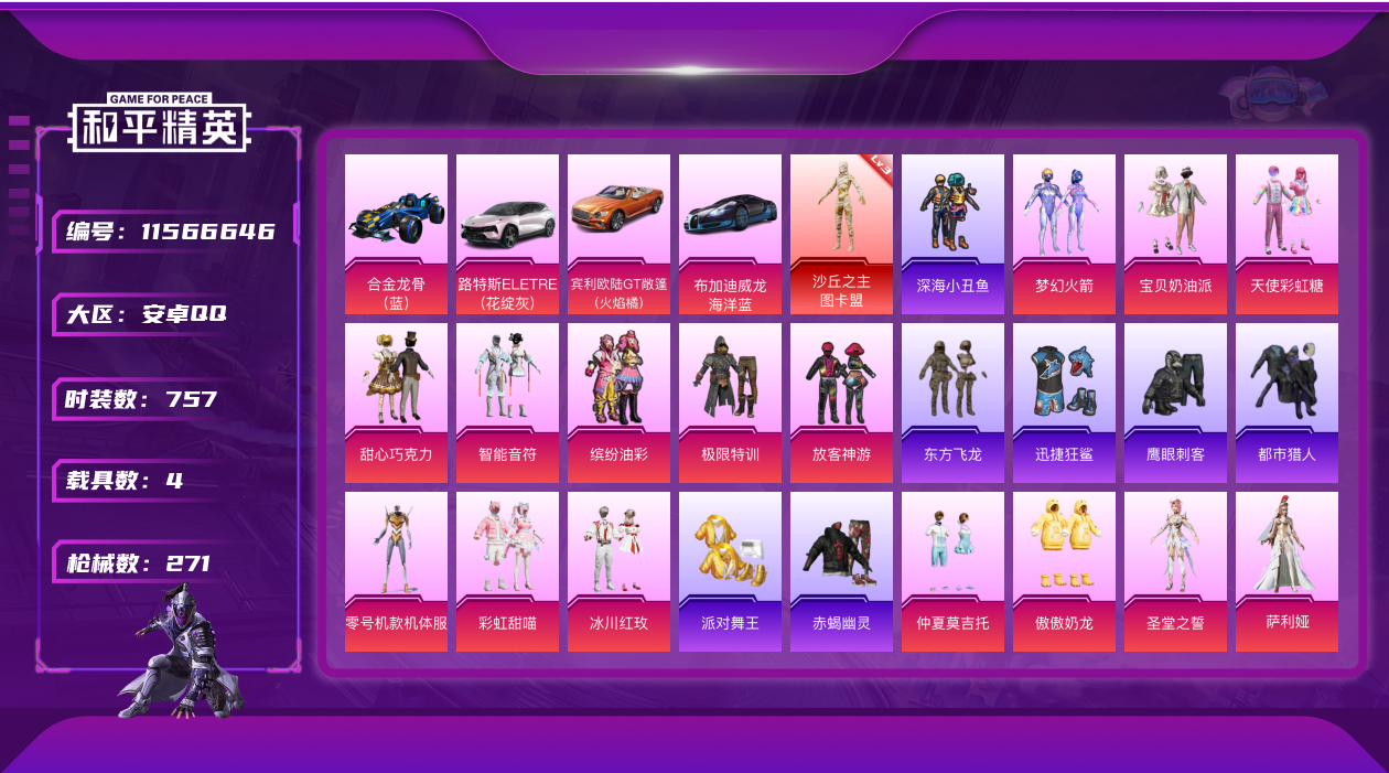 [11566646]HP0003 安卓Q 历史无敌战神 193套装 271枪皮 1神装15粉装8特效枪4载具 沙丘之主-图卡盟 (3级) 布加迪威龙(海洋蓝) 路特斯EL灰色 宾利欧陆GT火焰橘 合金龙骨蓝色 赤蝎幽灵 AKM-缤纷海域 都市猎人 浪漫天命 派对舞王 派对舞王(金靴子) 黄螳螂 圣堂之誓 梦幻火箭 萨利娅 傲傲奶龙 宝贝奶油派 天使彩虹糖 甜心巧克力 智能音符 缤纷油彩 放客神游 仲夏莫吉托 极限特训 彩虹甜喵 冰川红玫 M416-五爪金龙 (7级) P90-沙丘之主 (3级) Kar98K-巳巳如意 (5级) AUG-暖羊咩咩 (5级) AMR-智耀战神 (2级) GROZA-镜光银凌 (5级) AKM-梦之光华 (5级) SCAR-L-彩装战姬 (5级) 龟仙人 红熊茄茄 东方飞龙 鹰眼刺客 迅捷狂鲨 深海小丑鱼 KONE追光队服 PAI战队服 暗影哥特 团圆交子 瑞龙福将 水银刺客 狂沙舞者 破蛋小黄鸡 极速红龙 M416-快乐主宰 M762-奇异狩猎者 M762-瑞龙福将 梦幻火箭头盔 甜心宝贝头盔 甜心宝贝背包 百万伏特背包 萌熊伴侣背包