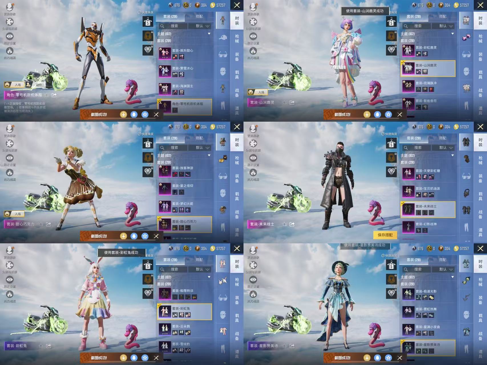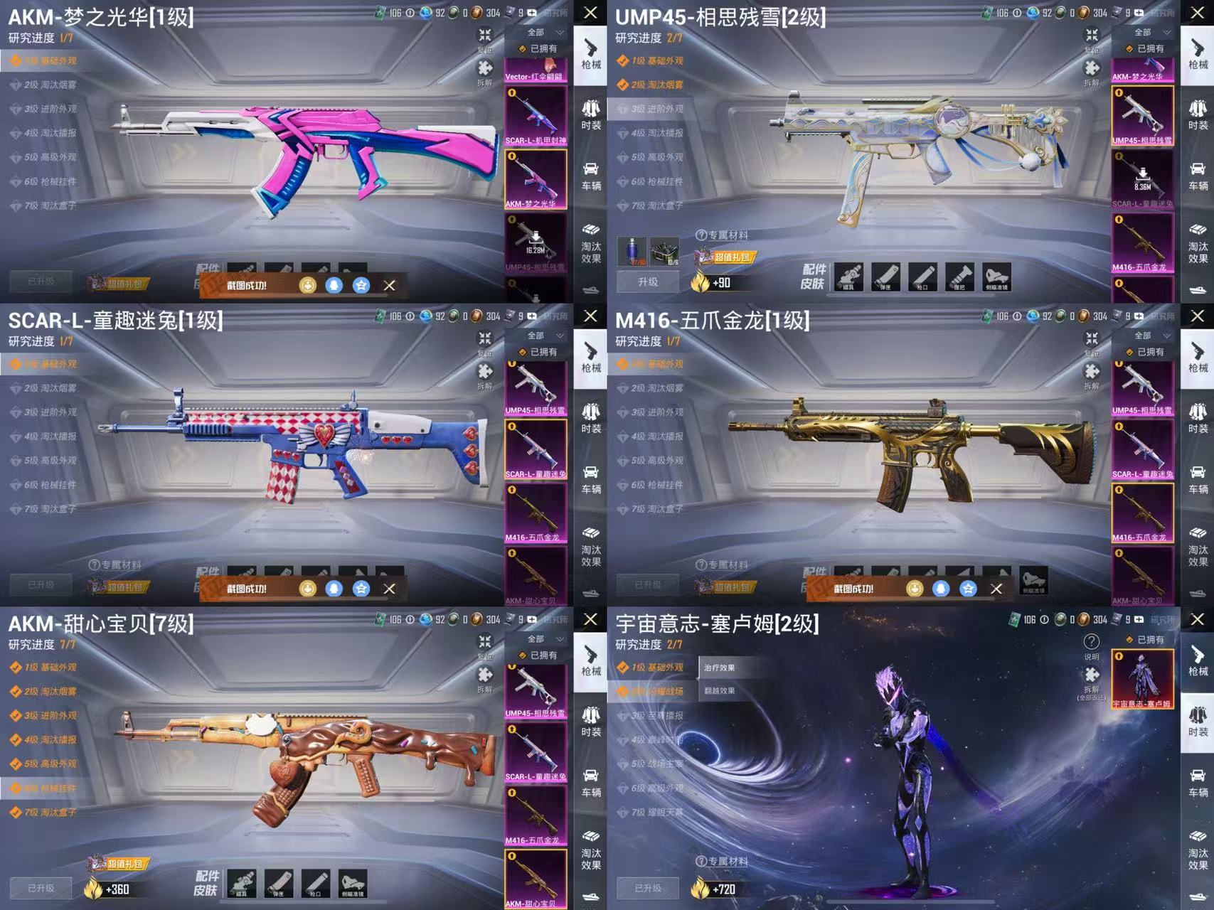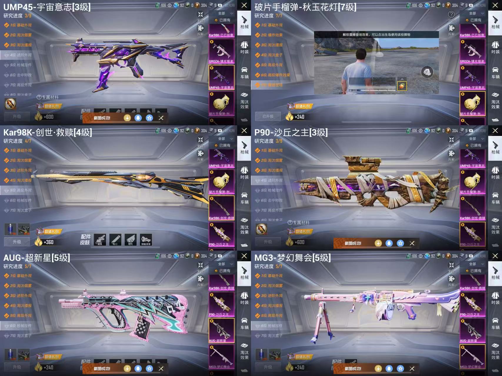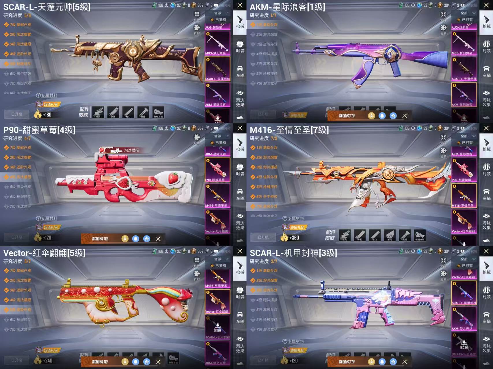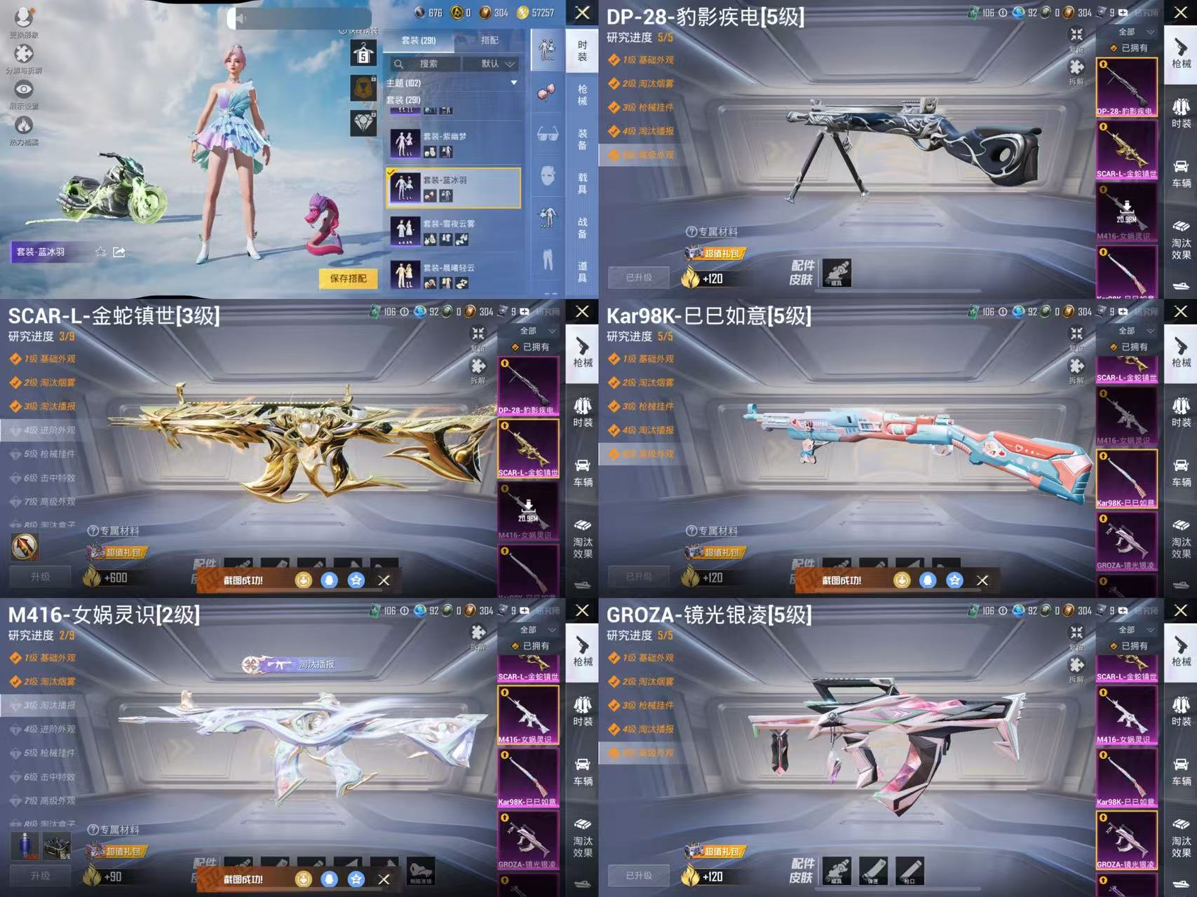 M416-心之恋语,AKM-梦之光华,SCAR-L-童趣迷兔,M762-激战未来,Kar98K-伏魔团,GROZA-焦糖拿铁,MG3-炙焰牛王,M416-暖熊萌萌,M24-翩跹演武,汤姆逊-冰川粉黛,AKM-星际浪客,SCAR-L-纯梦嫁纱,AUG-南国舞曲,平底锅-林间仙鹿