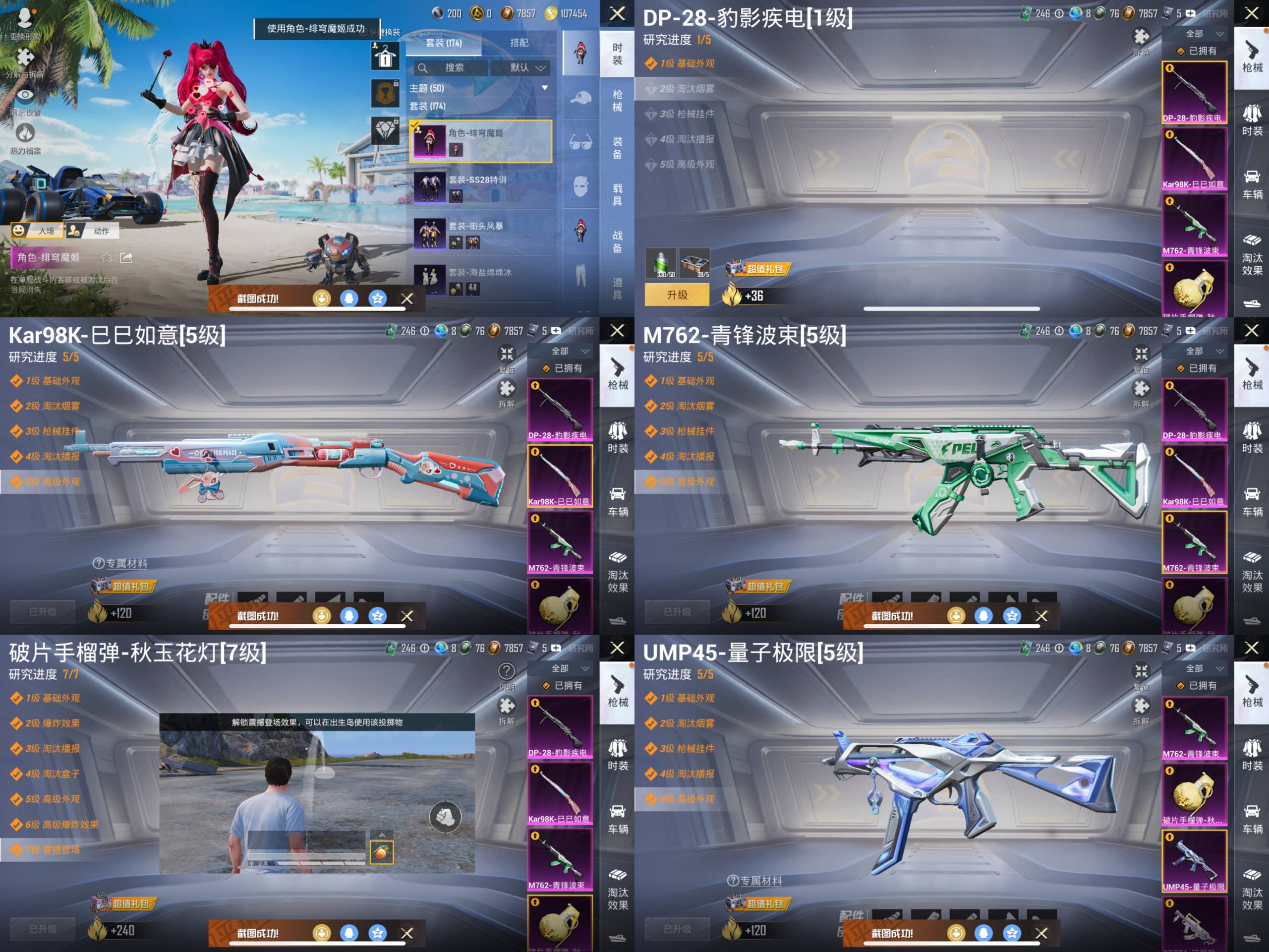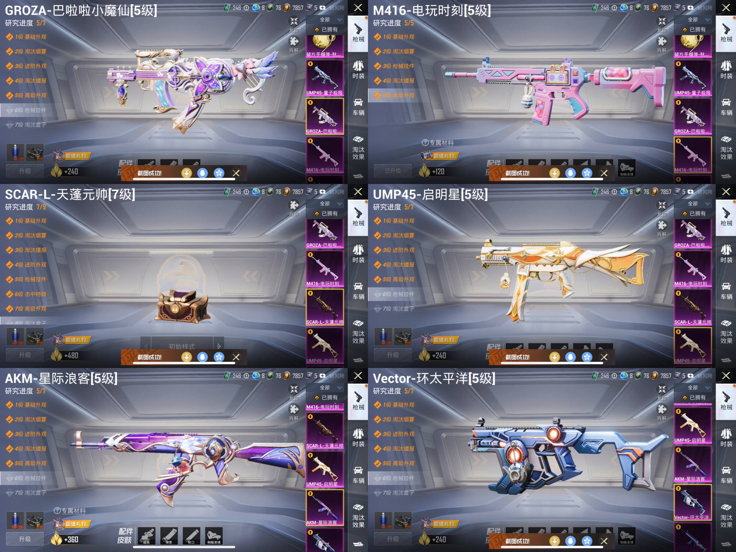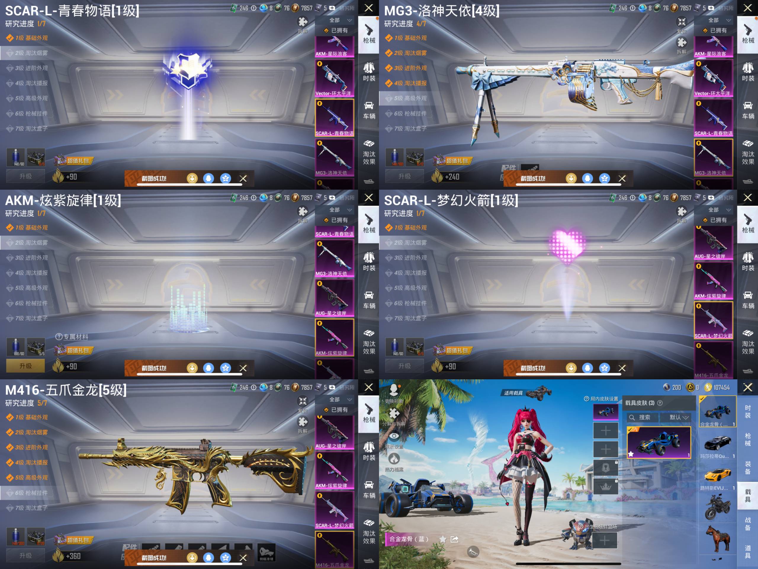 M416-五爪金龙,AKM-炫紫旋律,SCAR-L-梦幻火箭,AUG-星之彼岸,MG3-洛神天依,SCAR-L-青春物语,Vector-环太平洋,AKM-星际浪客,UMP45-启明星,SCAR-L-天蓬元帅,M416-电玩时刻,UMP45-量子极限,破片手榴弹-秋玉花灯,M762-青锋波束,Kar98K-巳巳如意