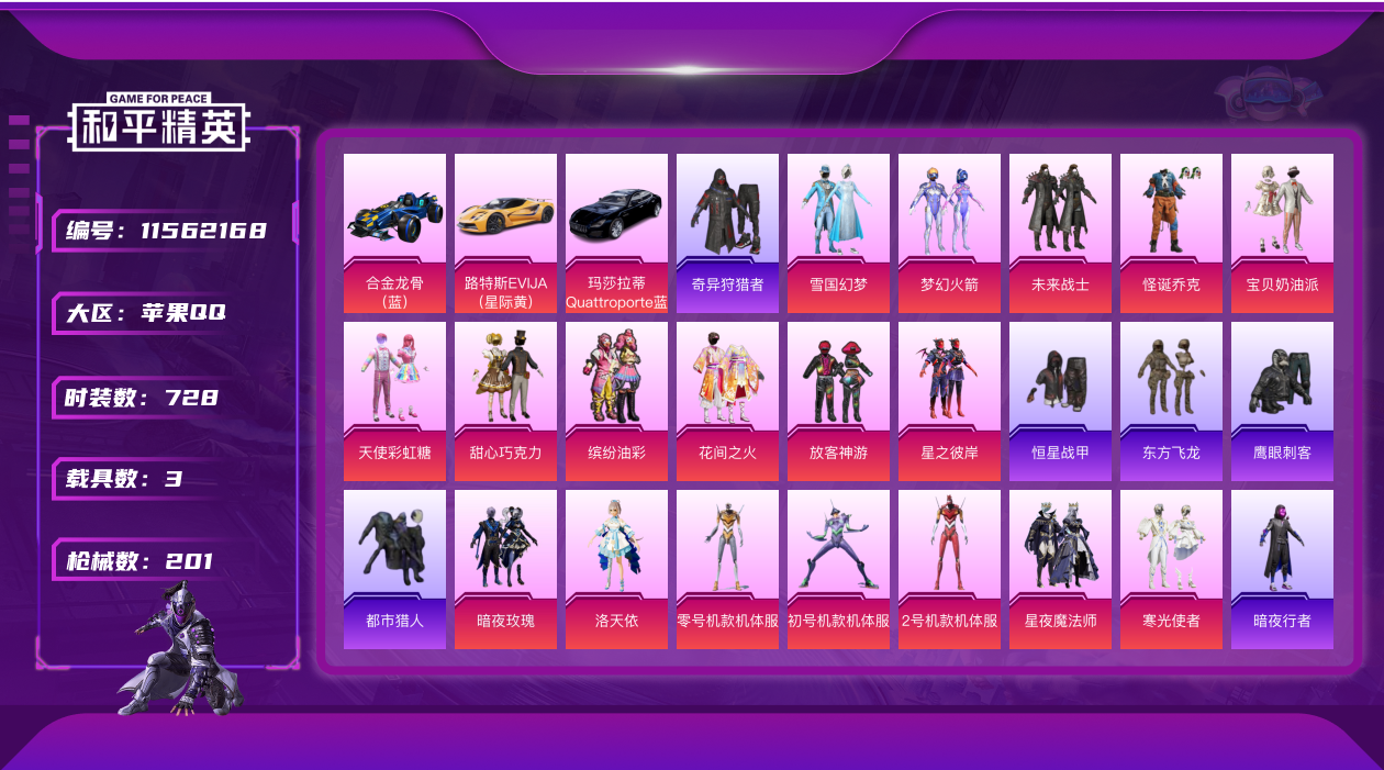 [11562168]HP0004 苹果Q 174套装 201枪皮 22粉装17特效枪3载具 奇异狩猎者 赤蝎幽灵 都市猎人 浪漫天命 天网终结者 路特斯EV黄色 玛莎拉蒂Q蓝色 合金龙骨蓝色 觉醒初号机 红螳螂 黄螳螂 紫螳螂 梦幻火箭 美琪 雪国幻梦 绯穹魔姬 宝贝奶油派 天使彩虹糖 甜心巧克力 洛天依 怪诞乔克 缤纷油彩 放客神游 未来战士 花间之火 星夜魔法师 星之彼岸 音爆索尼克 暗夜玫瑰 寒光使者 SCAR-L-梦幻火箭 (1级) M416-五爪金龙 (5级) M416-电玩时刻 (5级) AKM-炫紫旋律 (1级) Kar98K-巳巳如意 (5级) M762-青锋波束 (5级) DP-28-豹影疾电 (1级) UMP45-量子极限 (5级) SCAR-L-天蓬元帅 (7级) GROZA-巴啦啦小魔仙 (5级) AKM-星际浪客 (5级) AUG-星之彼岸 (4级) UMP45-启明星 (5级) MG3-洛神天依 (4级) Vector-环太平洋 (5级) SCAR-L-青春物语 (1级) 破片手榴弹-秋玉花灯 (7级) 星之彼岸飞行器 圣光天使飞行器 星夜魔法师飞行翼 8号机 Mark.06 萌神柯基 青涩年华 雪山精英 东方飞龙 动感兔斯基 鹰眼刺客 暗夜行者 金羽特工 胖达圆圆 LGD追光队服 NV战队服 粉红小猪 漫步者 破蛋小黄鸡 极速红龙 军刀雅典娜 英勇保护者 AKM-奇异狩猎者 M762-奇异狩猎者 M24-奇异狩猎者 梦幻火箭头盔 雪国精灵头盔 甜心宝贝头盔 深海小丑鱼头盔 梦幻火箭背包 雪国精灵背包 甜心宝贝背包 花间之火背包