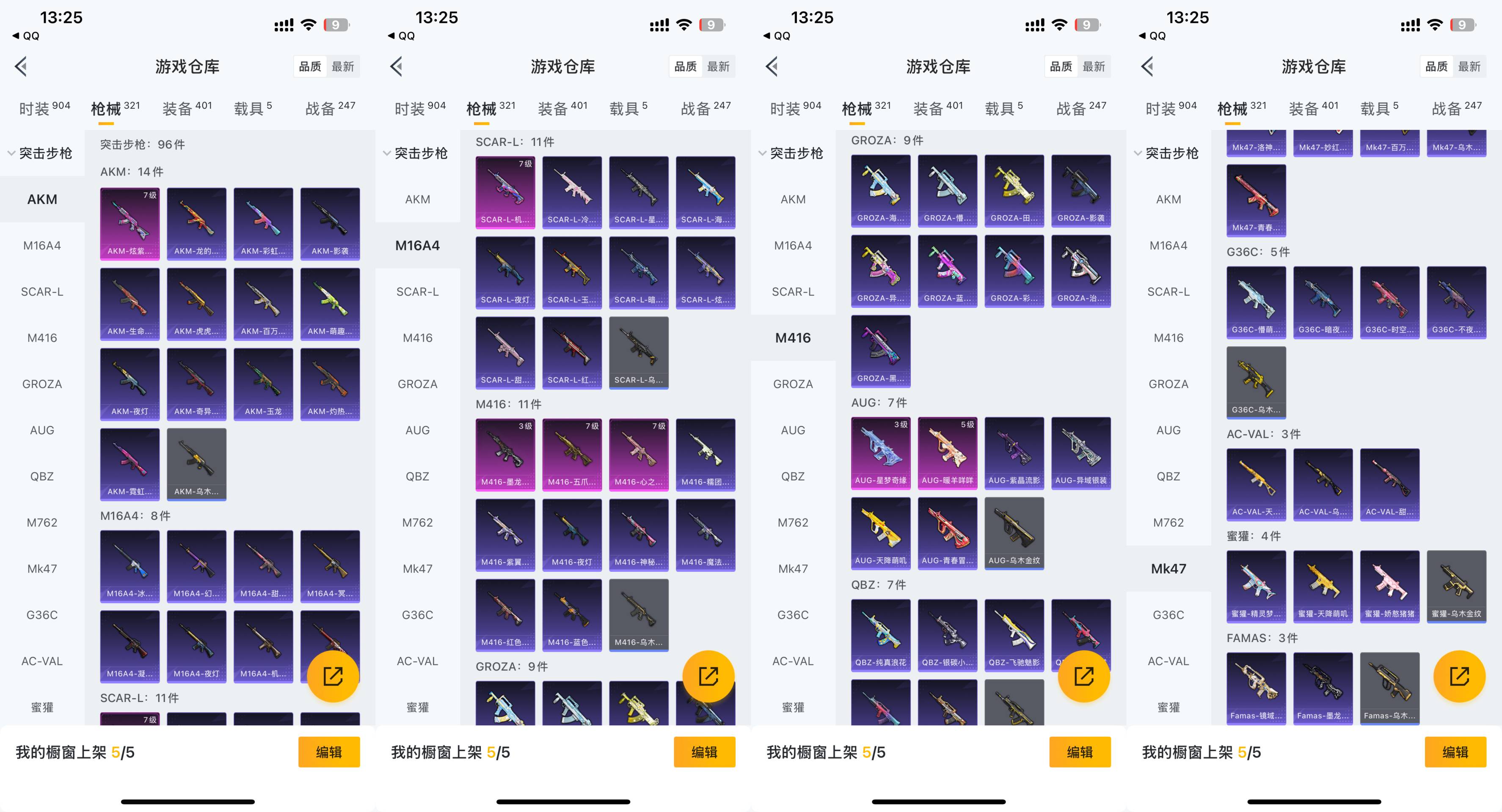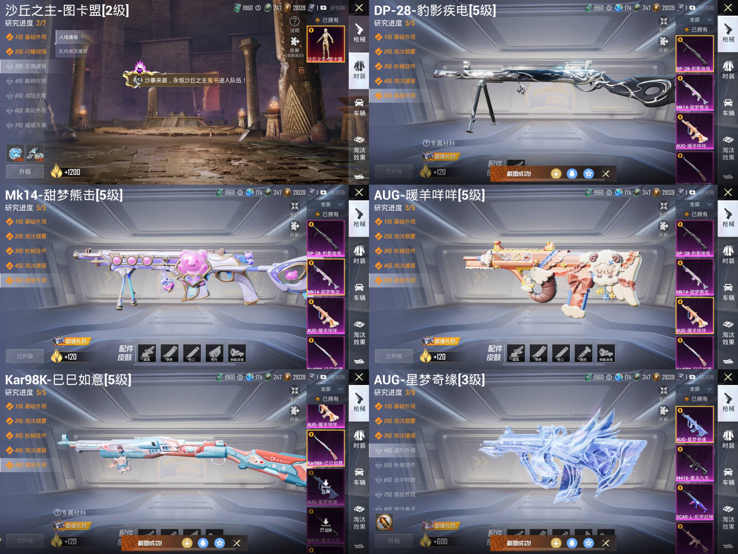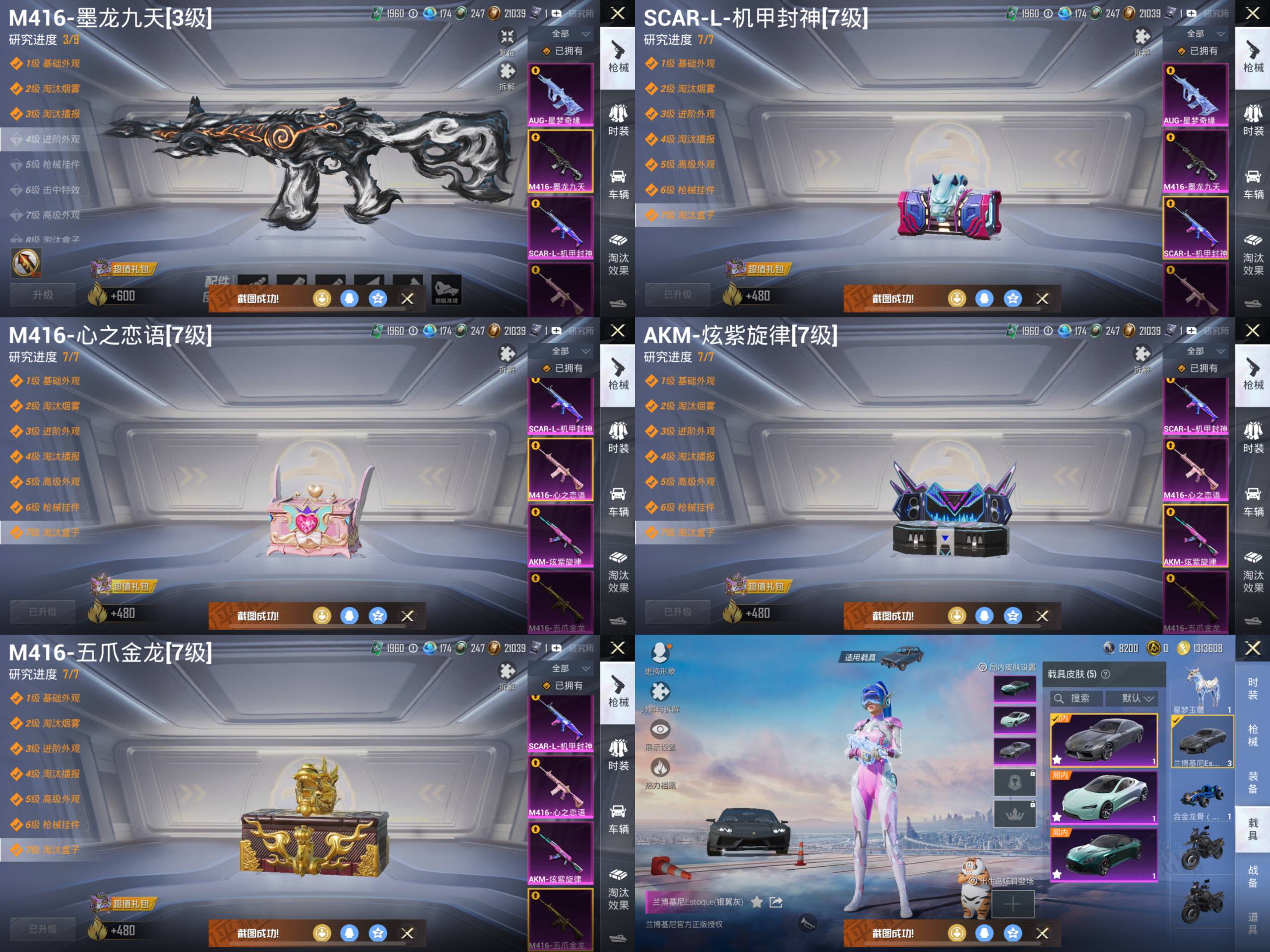 M416-心之恋语,M416-五爪金龙,AKM-炫紫旋律,SCAR-L-机甲封神,M416-墨龙九天,AUG-星梦奇缘,Kar98K-巳巳如意,AUG-暖羊咩咩