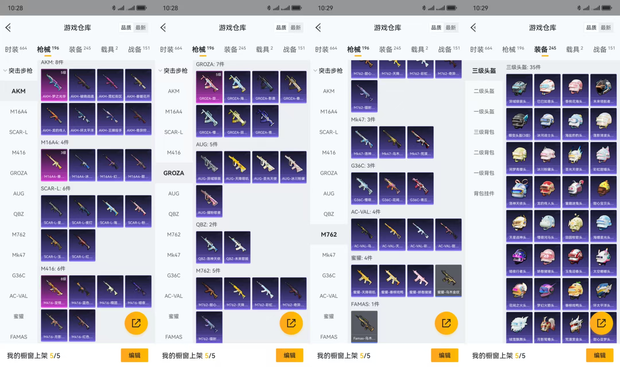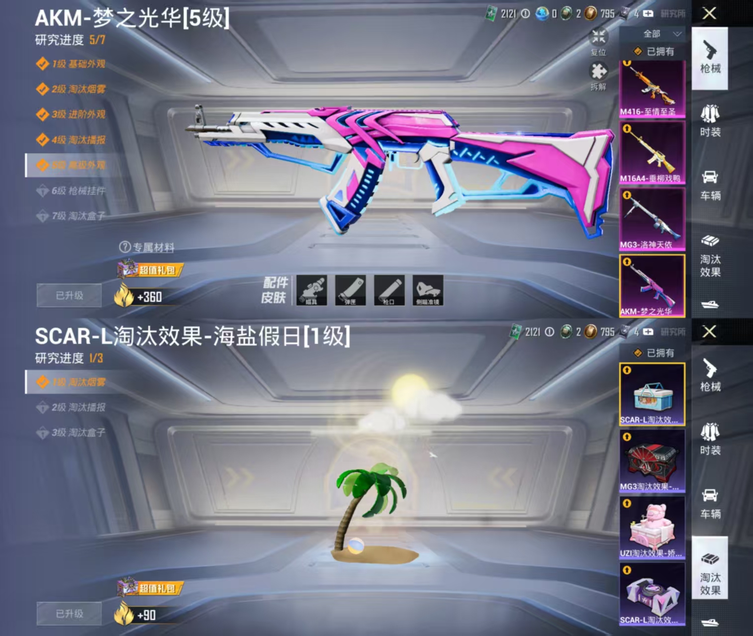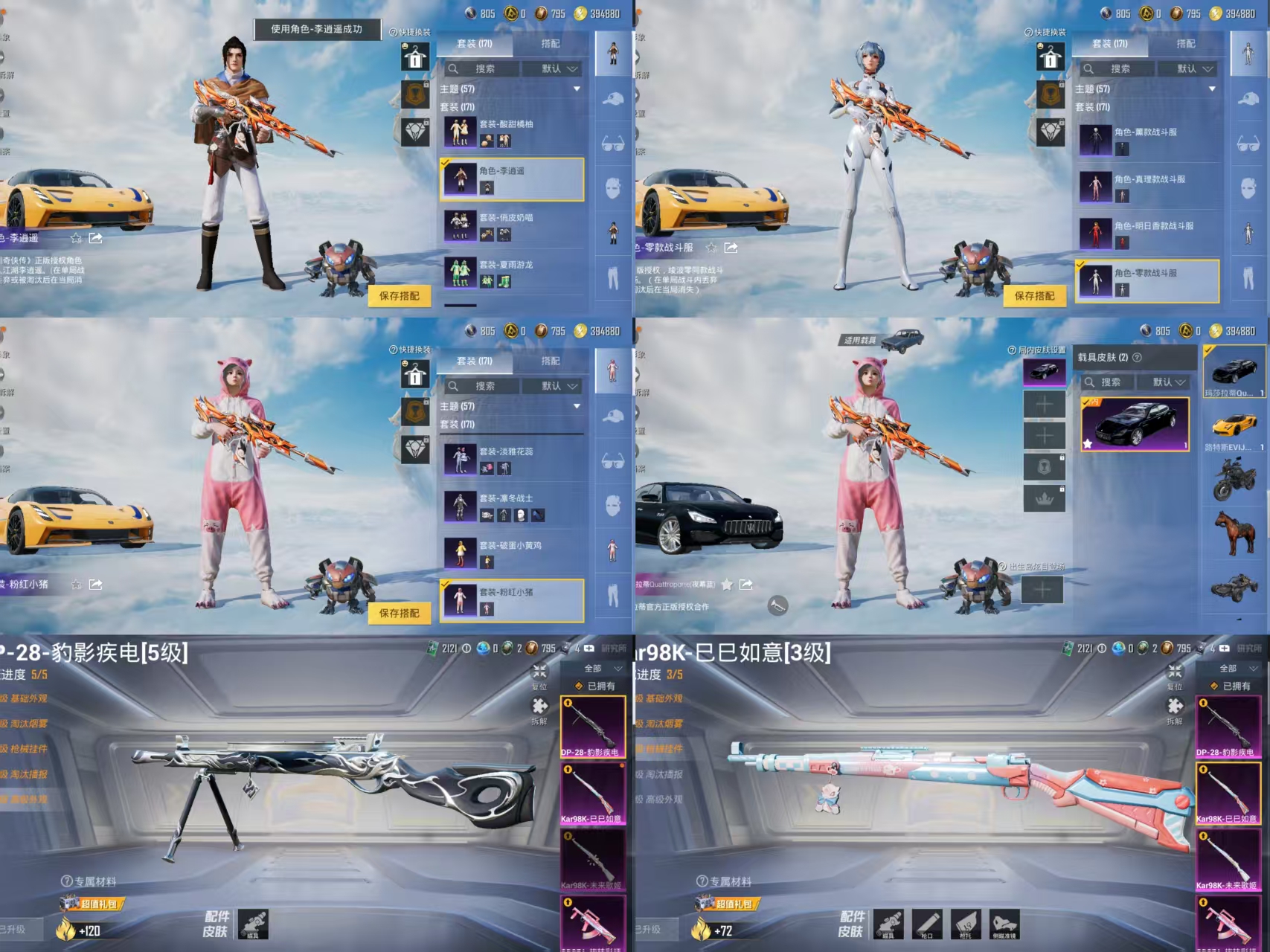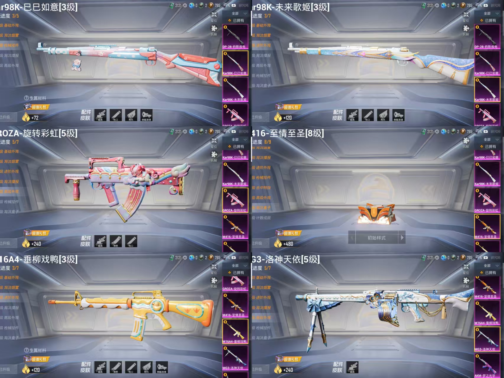 AKM-梦之光华,MG3-洛神天依,M16A4-垂柳戏鸭,M416-至情至圣,GROZA-旋转彩虹,Kar98K-未来歌姬,Kar98K-巳巳如意