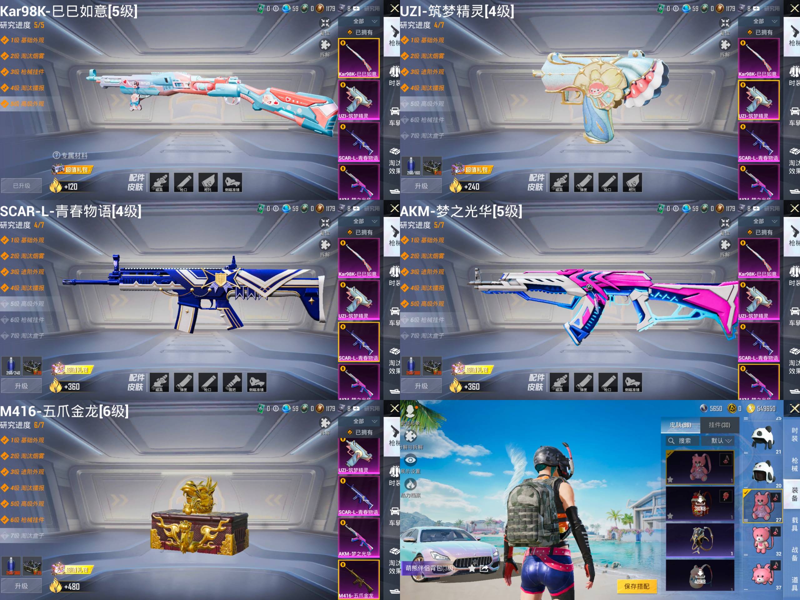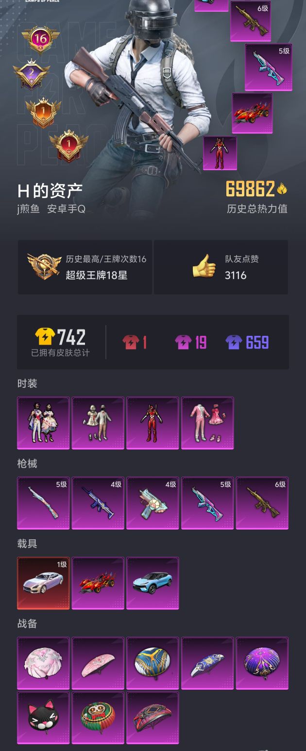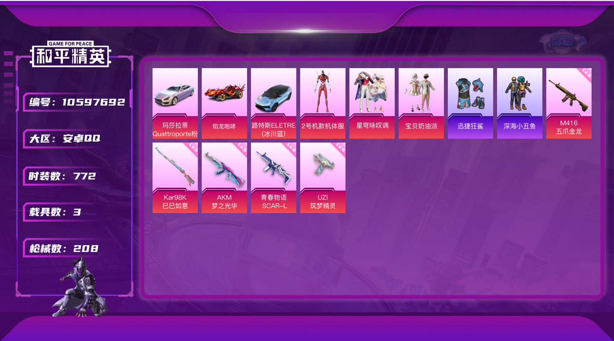 - PX_2069666- 安卓手Q-16王牌印记-有战神框-14粉装-13特效枪-3载具-88073热力值-209套装-261枪皮-4卓越印记-2传奇印记 【14粉装】,梦幻火箭,天使彩虹糖,智耀战神,精灵娃娃,酣梦娃娃,橘柚倾心,海盐物语,天禅智恒,甜梦冰蝶,炙焰红王,彩虹鹿灵,山涧鹿灵,吟月归客,蜜桃特工 【13特效枪】AKM-绿萝繁花-4级 AKM-炫紫旋律-5级 SCAR-L-青春物语-4级