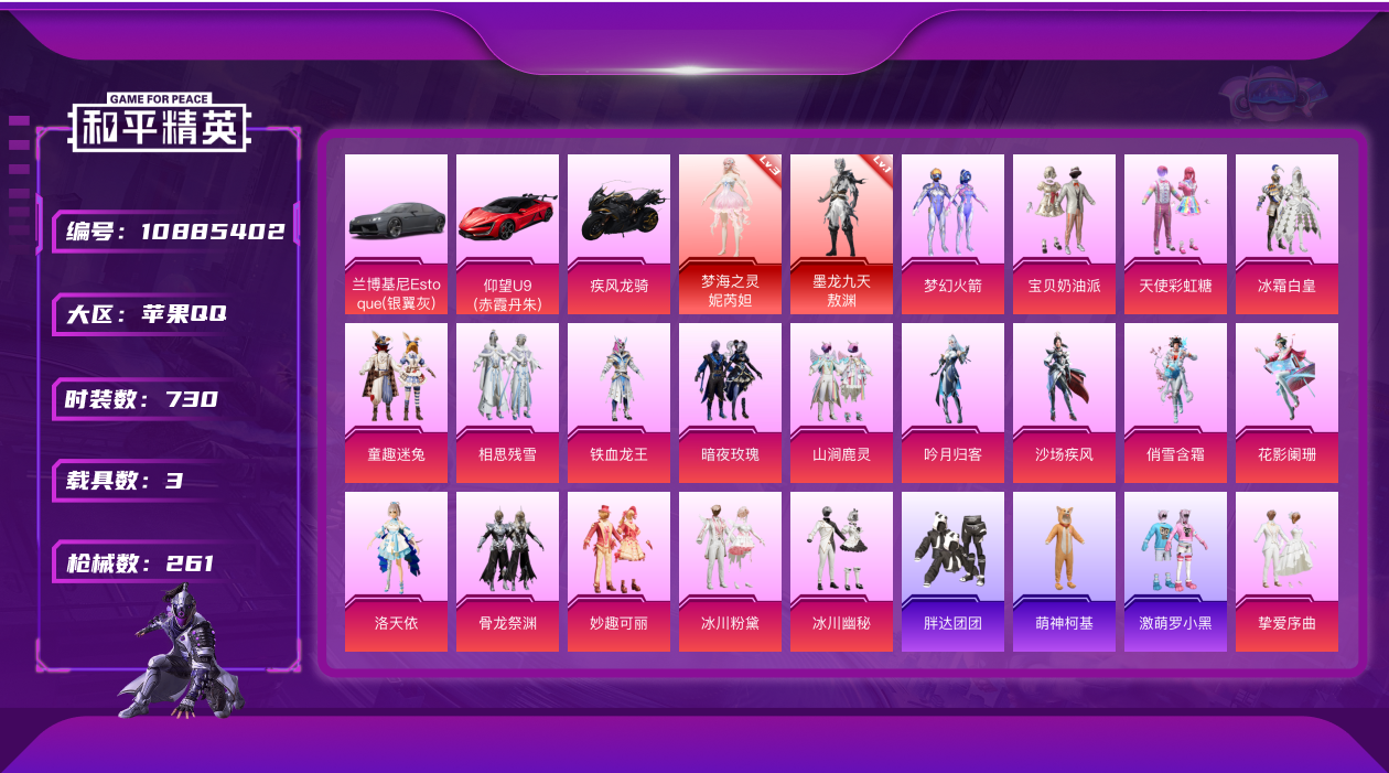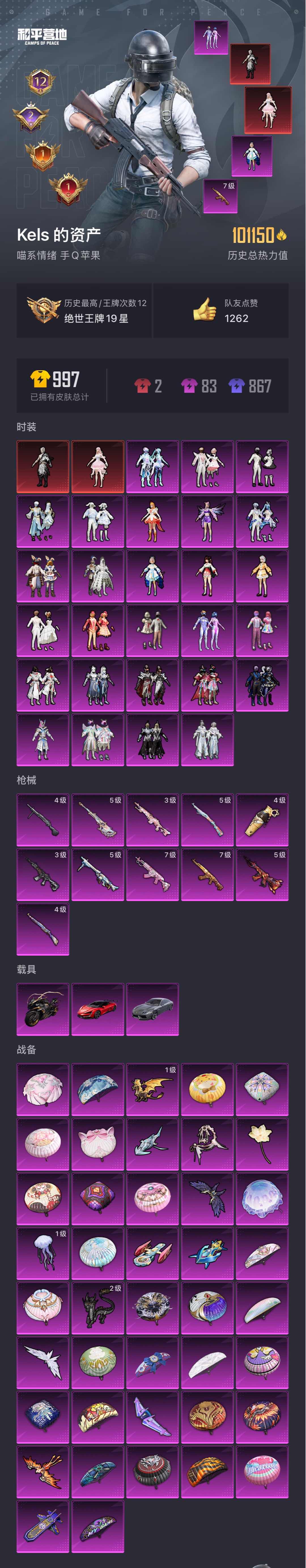 - PX_2071586-苹果QQ 历史总热力值:66936 红装数量:1 粉装数量:5 特效枪数量:7 载具数量:3 王牌印记:7 历史最高段位:绝世王牌11星 套装数量:131 时装数量:544 枪械数量:162 战备数量:144 装备数量:212 载具:盛世惊鸿摩托车,快艇-自由的鲸(1级),辉羽雀灵自行车 时装:梦海之灵-妮芮妲(5级),套装-缤纷油彩,套装-金风玉露,角色-彩虹独角兽,角色-