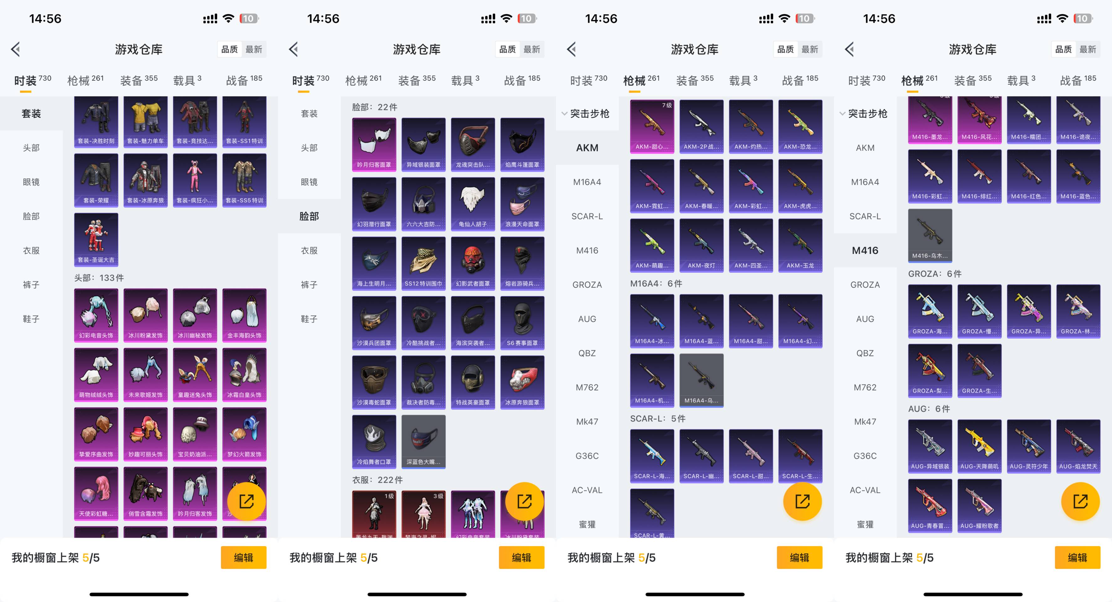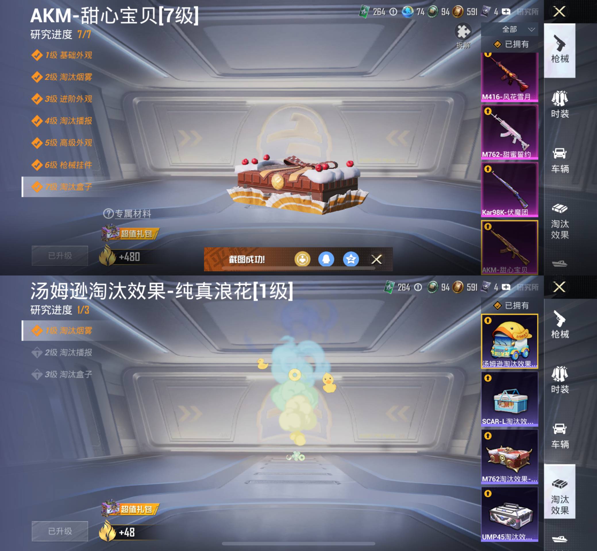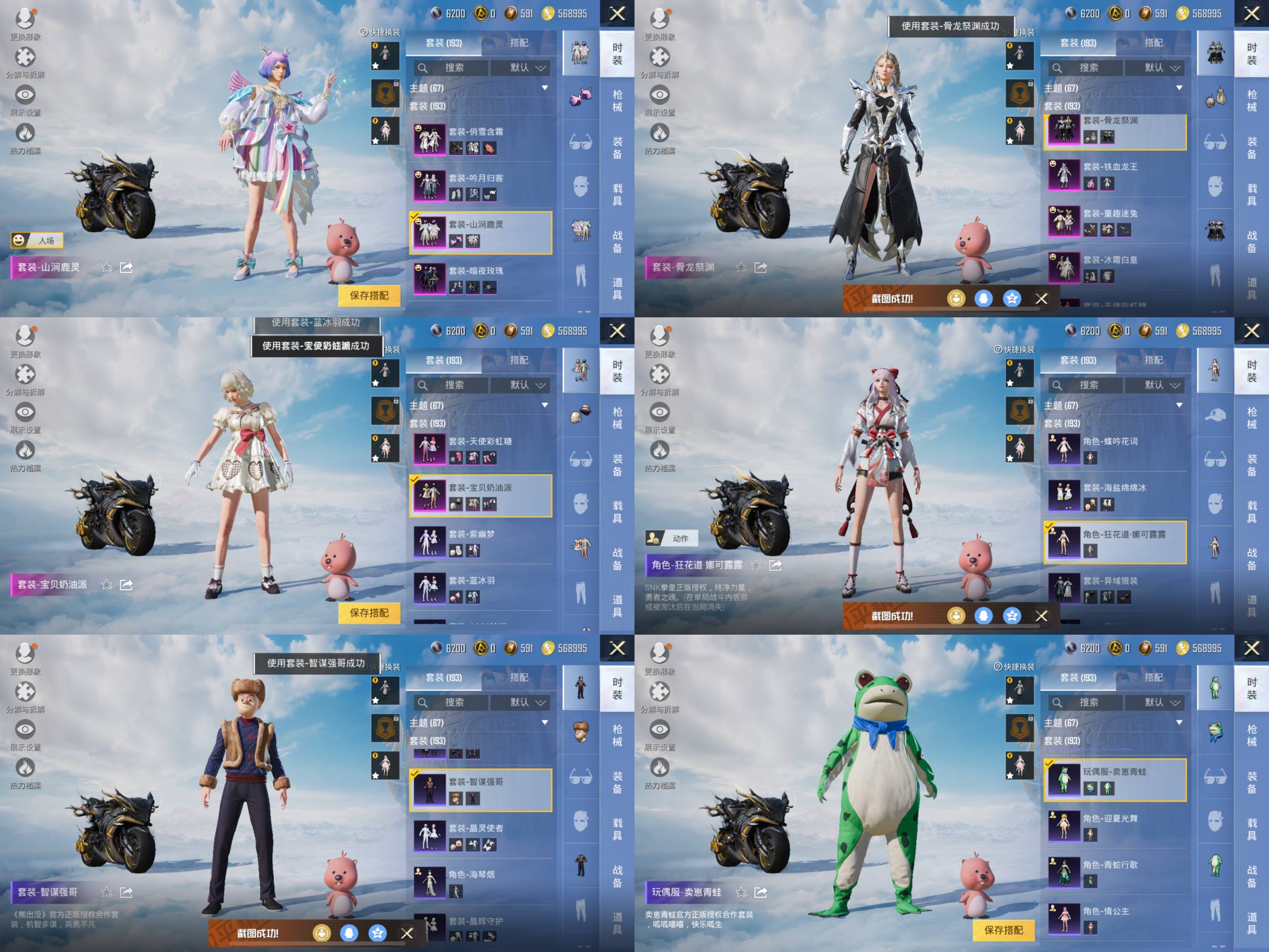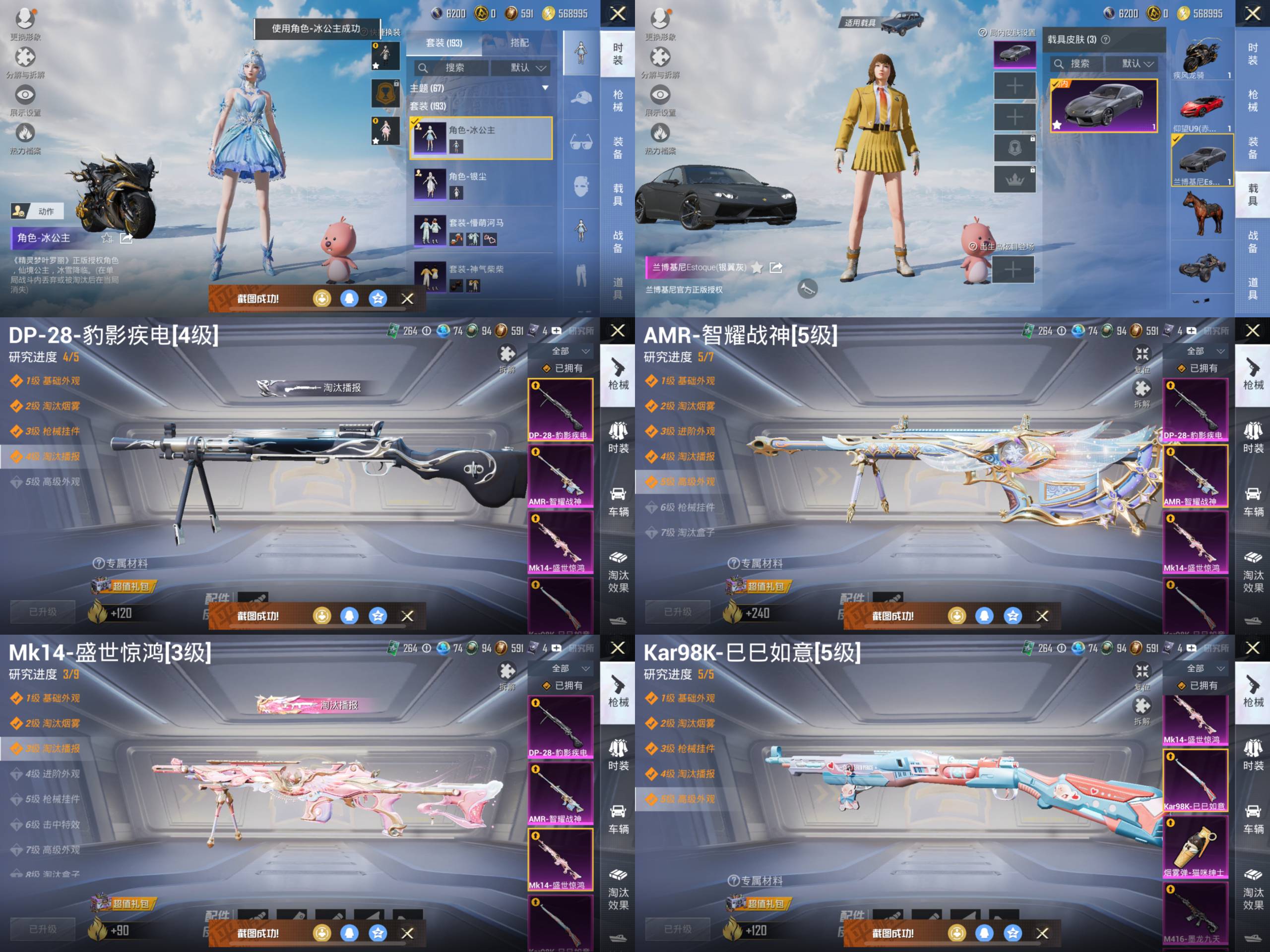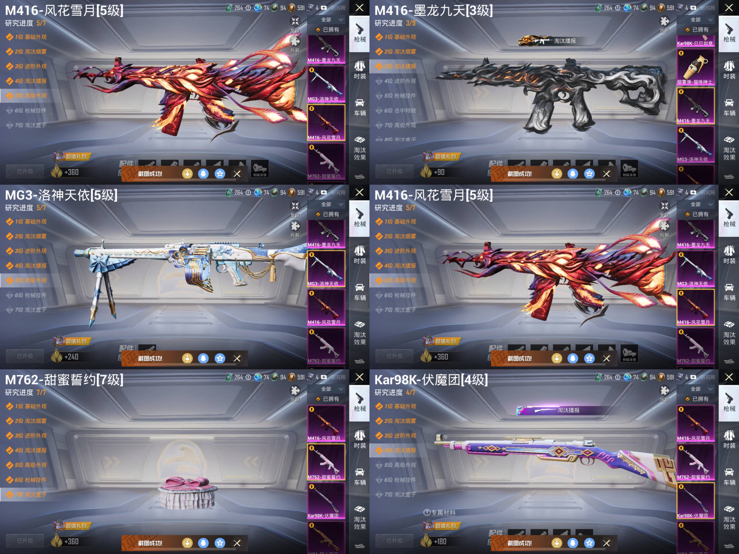 AKM-甜心宝贝,M762-甜蜜誓约,Kar98K-伏魔团,M416-风花雪月,MG3-洛神天依,M416-墨龙九天,烟雾弹-猫咪绅士,Kar98K-巳巳如意,Mk14-盛世惊鸿
