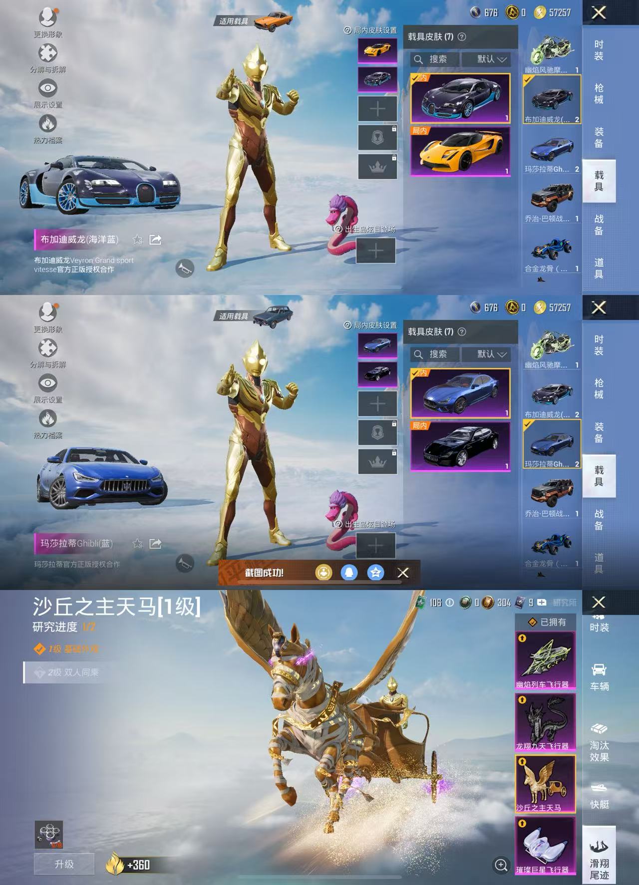 幽焰风驰摩托车,乔治·巴顿战车(鎏金黑),玛莎拉蒂Quattroporte(夜幕蓝),玛莎拉蒂Ghibli(蓝),合金龙骨(蓝),路特斯EVIJA(星际黄),布加迪威龙(海洋蓝)