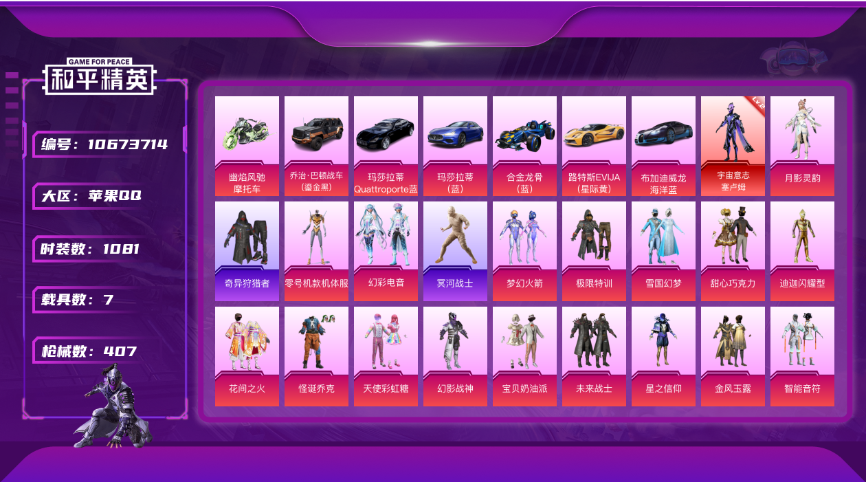 - [12042788]素材身法号/绝世印记1/地铁满天赋【特价急出/详情看图】:苹果 手Q-7粉装-8特效枪-7载具-3粉色飞行器-7.1w热力值-7王牌印记-147套装-207枪皮【热门品类】:粉装-梦幻火箭,套装-浪漫天命,套装-都市猎人,套装-暗夜之虎,套装-龟仙人,套装-暗影哥特【粉色载具】:兰博基尼Aventador SVJ(翡翠绿),兰博基尼Estoque(银翼灰),兰博基尼URUS(明艳黄),玛莎拉蒂Ghibli(蓝),宝马M4(圣保罗黄),永恒黄蜂,Formula E Gen2(幽光蓝)【粉色套装】:粉装-梦幻火箭,粉装-花影阑珊,粉装-俏雪含霜,粉装-炙焰牛王,粉装-旋转彩虹,角色-千金淑猫,角色-绯穹魔姬【粉色枪皮等级】:AKM-星际浪客(七级),M416-风花雪月(一级),M416-灵猫魔法师(三级),GROZA-旋转彩虹(六级),AUG-暖羊咩咩(五级),Kar98K-巳巳如意(五级),Mk14-精灵梦叶罗丽(五级),DP-28-豹影疾电(五级)【粉色飞行器】:齐天大圣飞行器,星夜魔法师飞行翼,灵猫魔法师飞行器