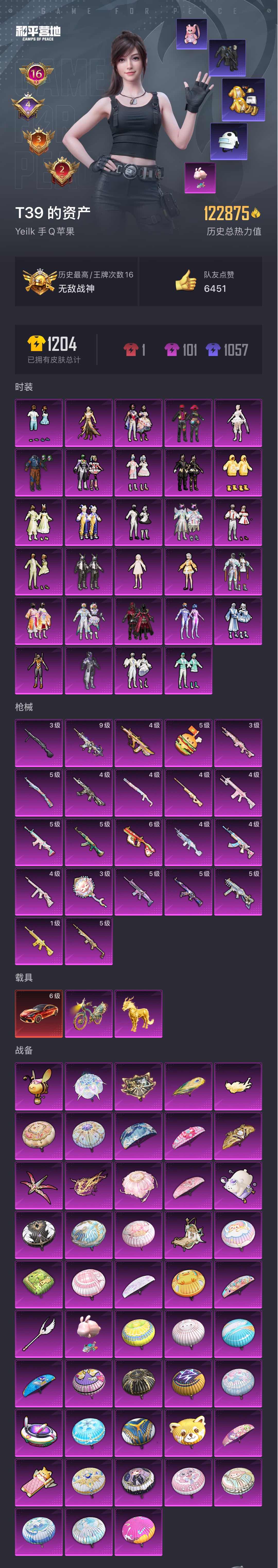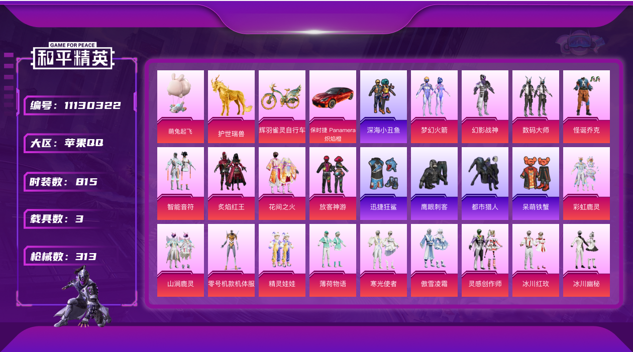 - [11228405]实名: 可修改 时装数: 319 枪械数: 119 战备数: 65 热门装扮: 洛天依,憨憨奶龙,光极星 稀有枪皮: M416风花雪月,SCAR-L-锦绣绵绵,M416墨龙九天,Kar98K-巳巳如意