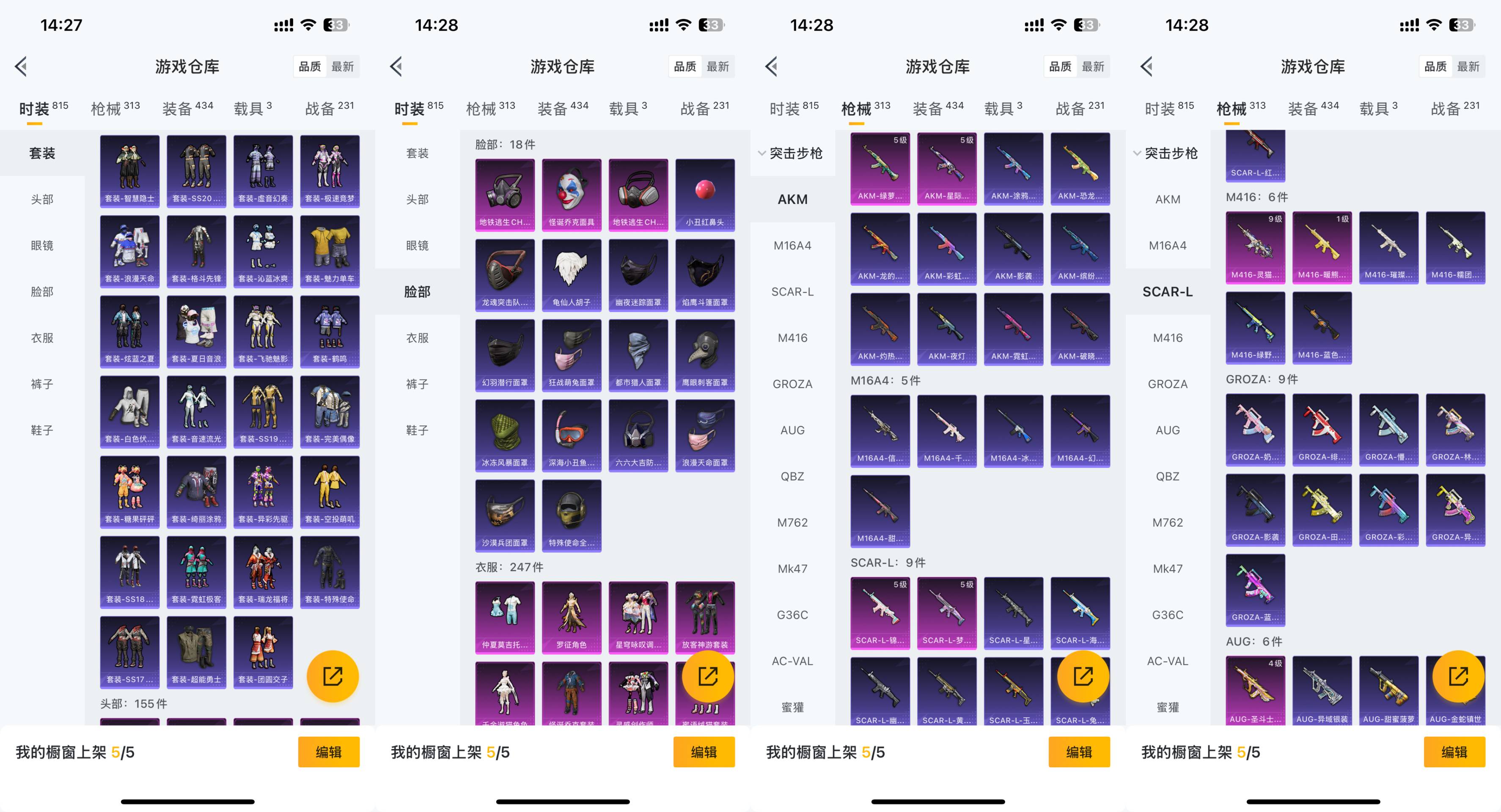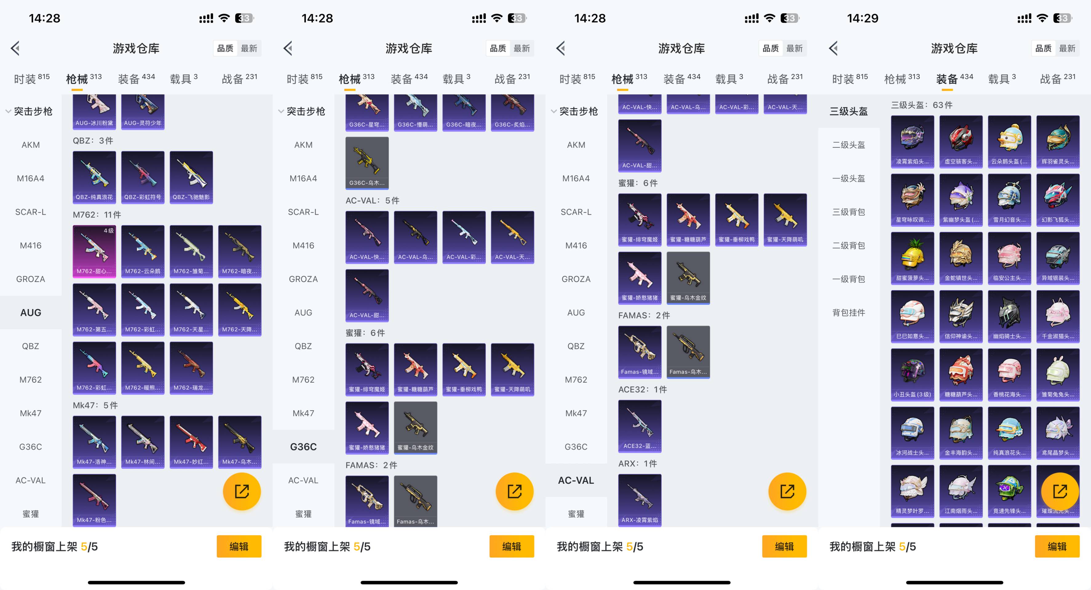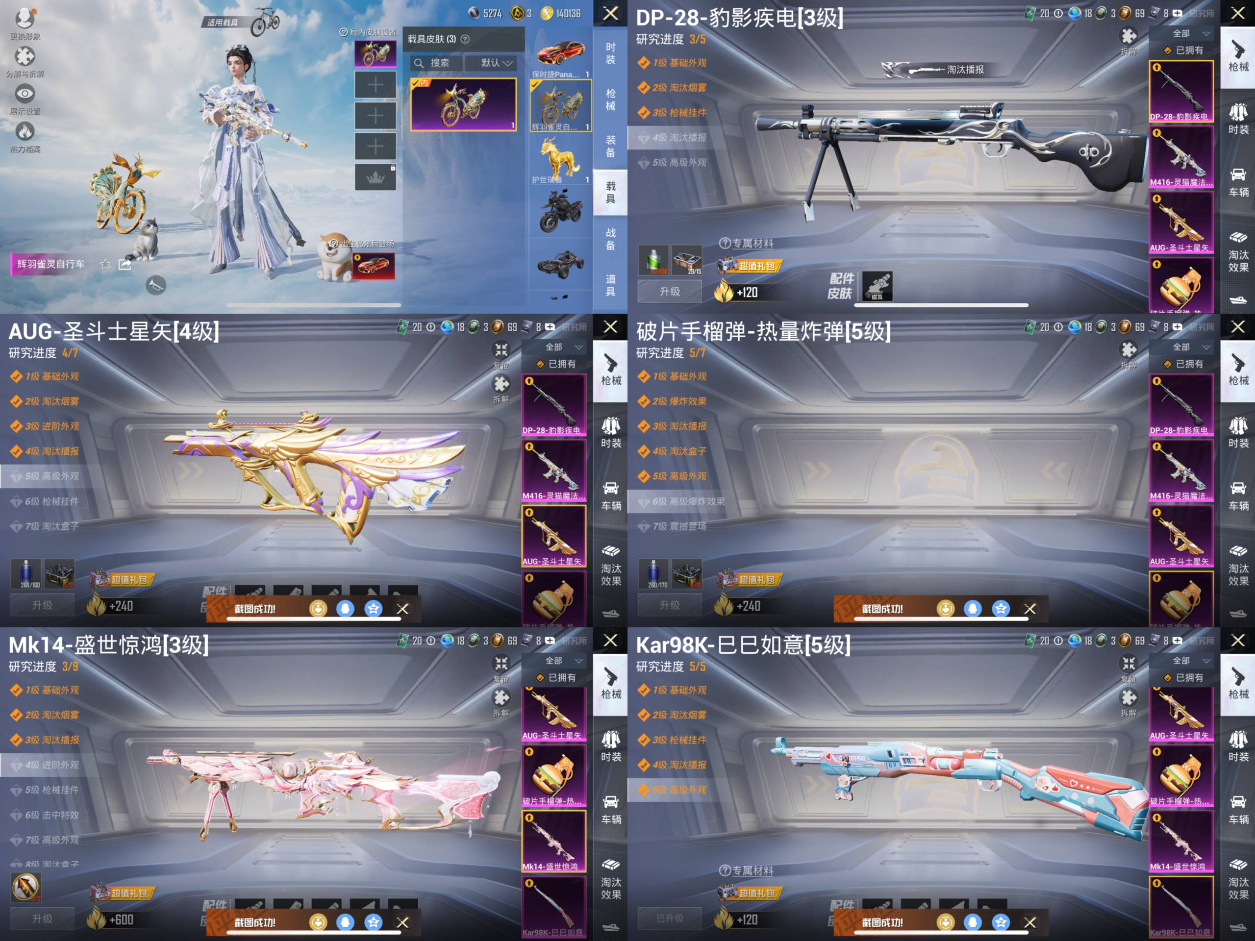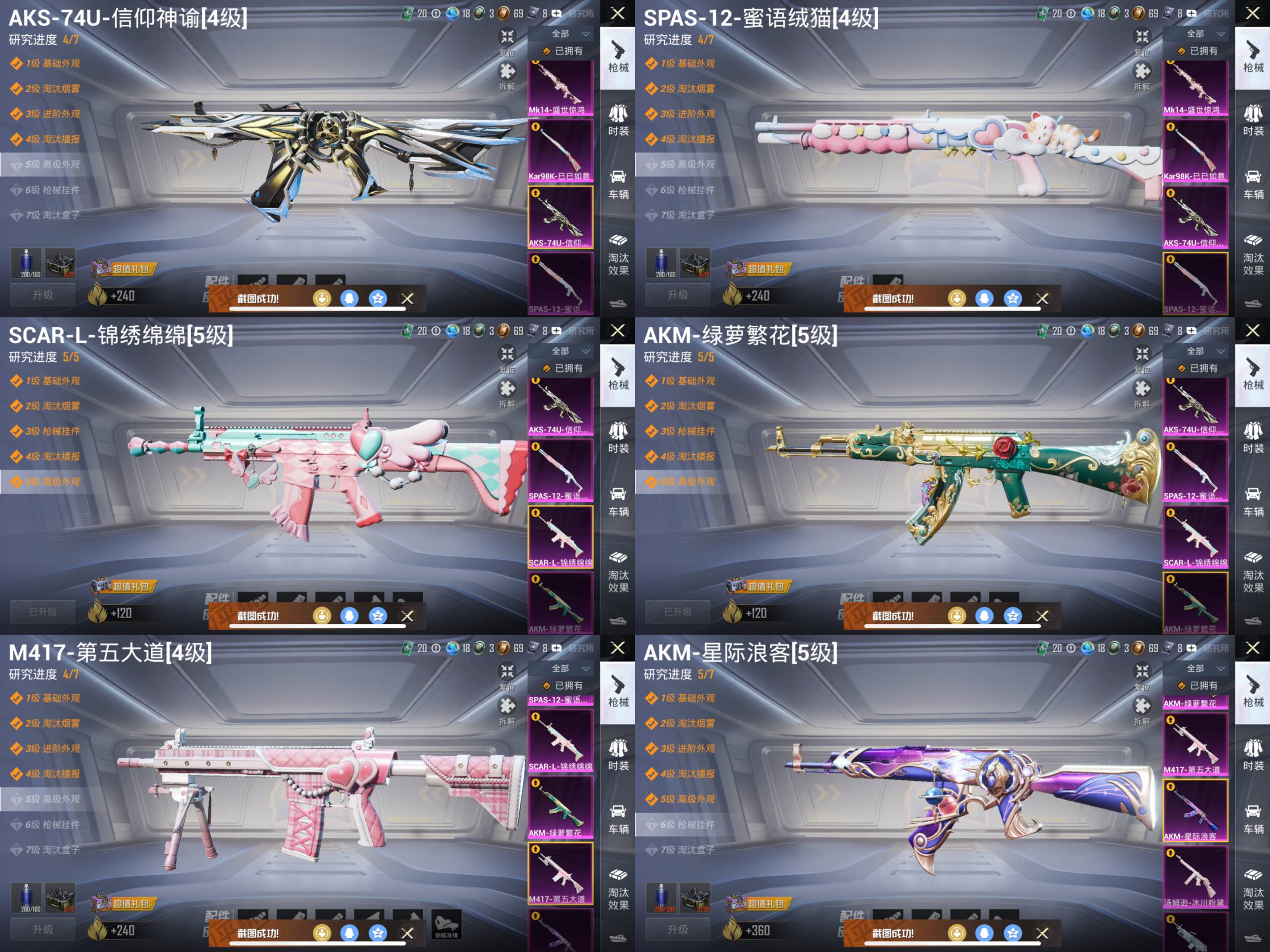 Mini14-林间仙鹿,GROZA-林间仙鹿,M762-瑞龙福将,Mk47-林间仙鹿,AKM-缤纷海域,S686-奇异狩猎者