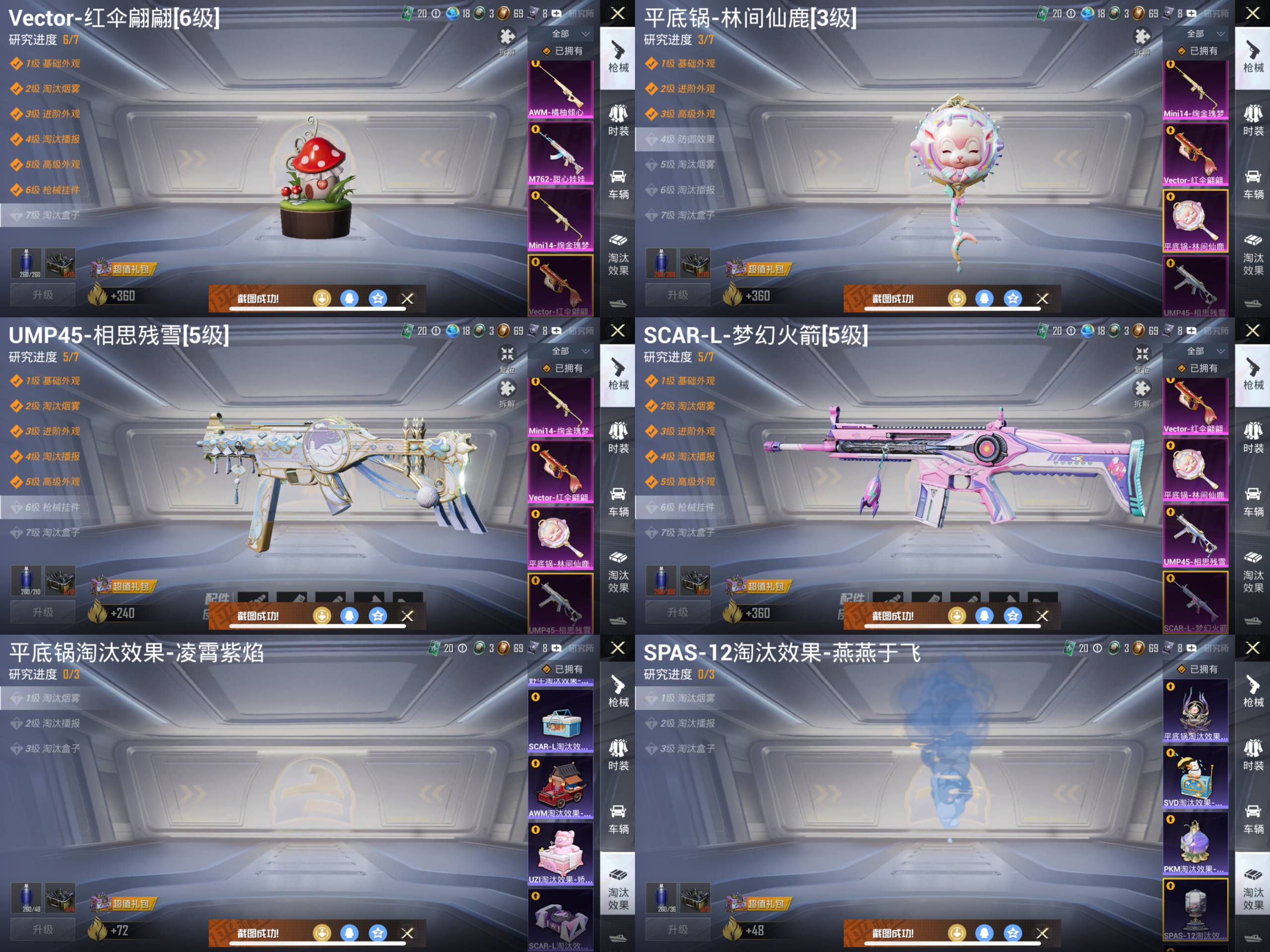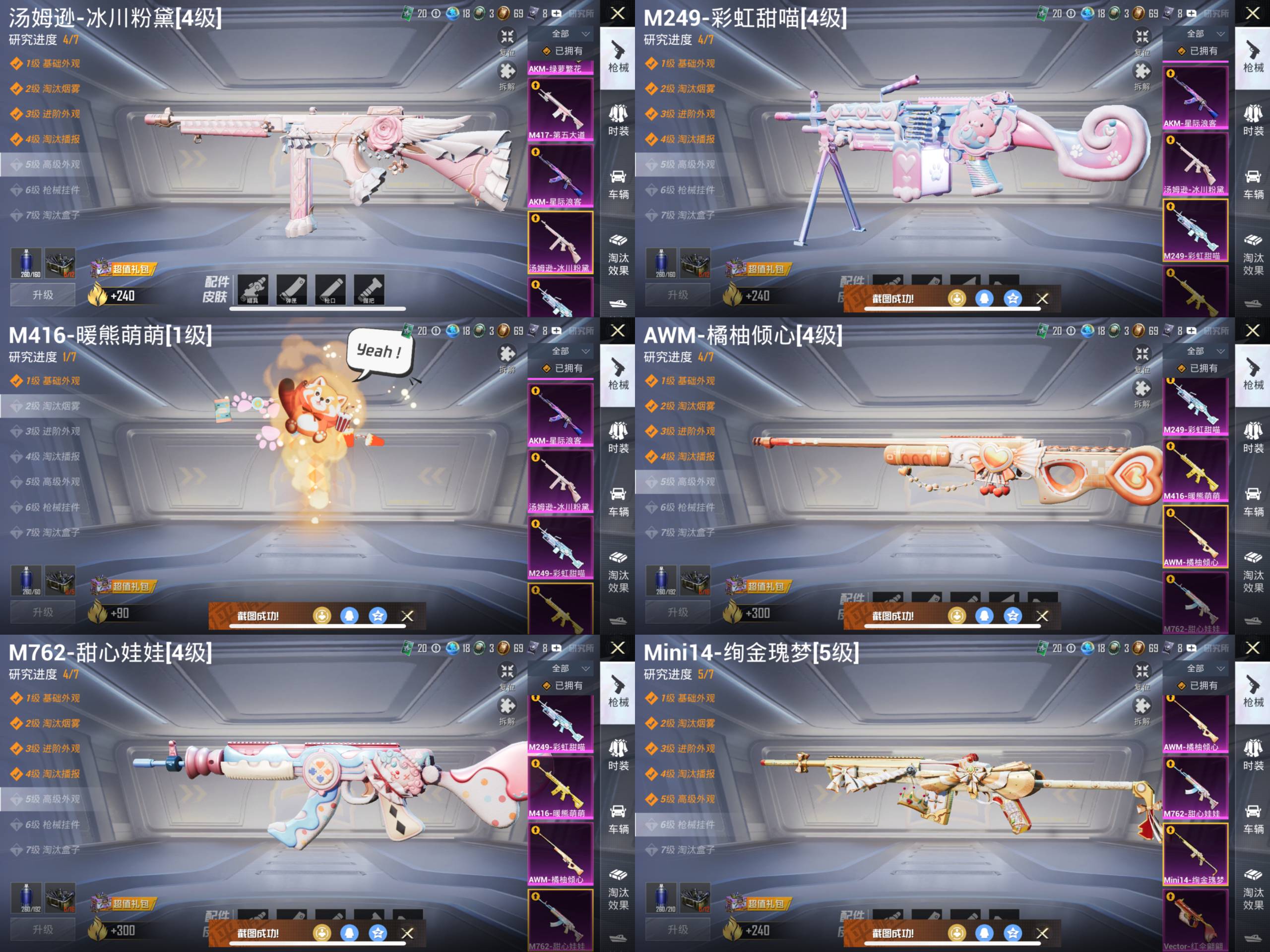 SCAR-L-梦幻火箭,UMP45-相思残雪,Vector-红伞翩翩,Mini14-绚金瑰梦,M762-甜心娃娃,AWM-橘柚倾心,M416-暖熊萌萌,M249-彩虹甜喵,汤姆逊-冰川粉黛,AKM-星际浪客,M417-第五大道,平底锅-林间仙鹿,AKM-绿萝繁花,SCAR-L-锦绣绵绵,SPAS-12-蜜语绒猫,AKS-74U-信仰神谕,Kar98K-巳巳如意,Mk14-盛世惊鸿,破片手榴弹-热量炸弹