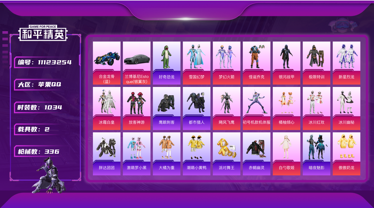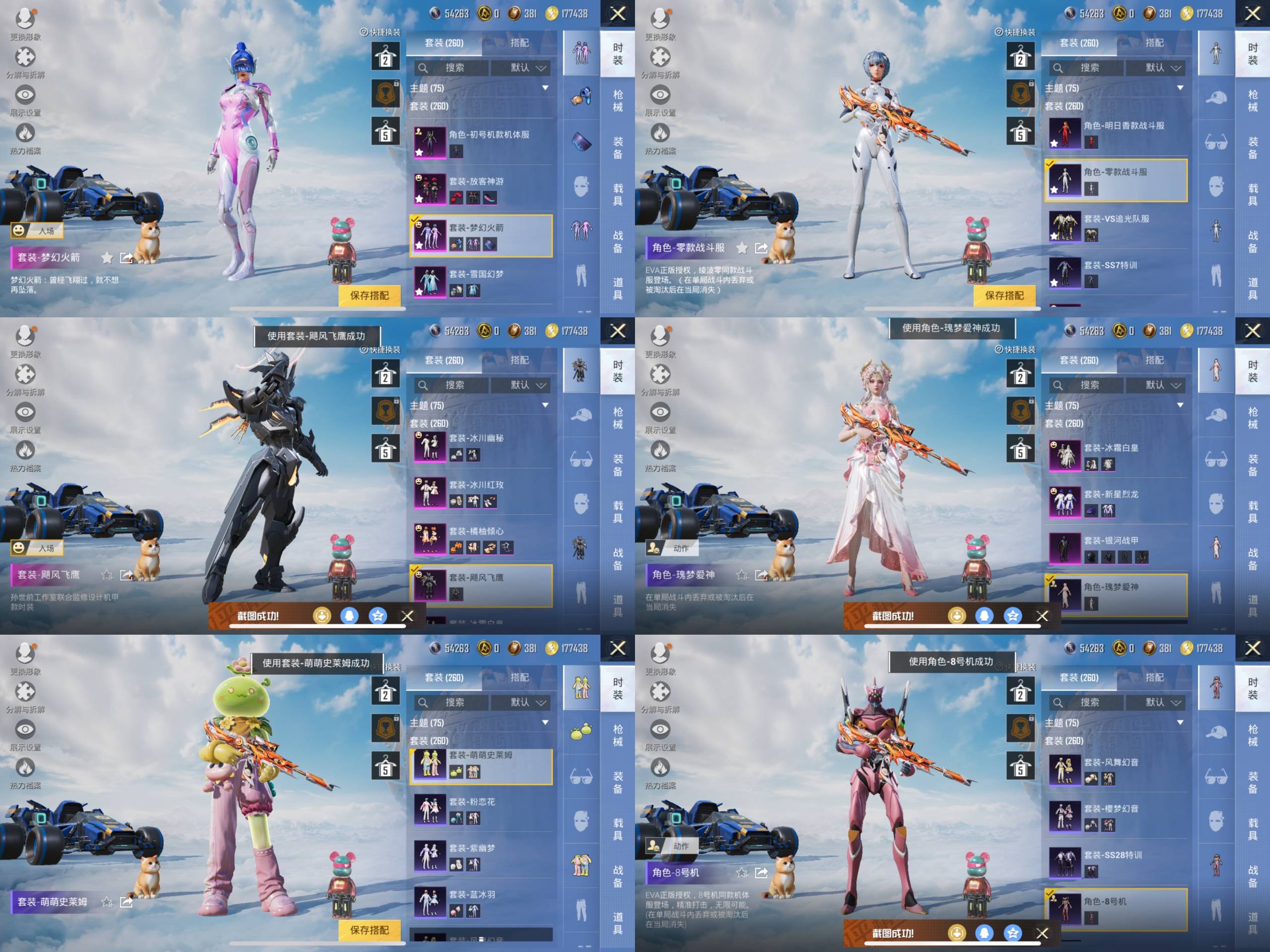 好奇恐龙套装,套装-雪国幻梦,套装-梦幻火箭,套装-怪诞乔克,套装-银河战甲,套装-极限特训,套装-新星烈龙,套装-放客神游,套装-鹰眼刺客,套装-都市猎人,套装-飓风飞鹰,角色-初号机款机体服,套装-橘柚倾心,套装-冰川红玫,套装-冰川幽秘,套装-胖达团团,套装-大橘为重,套装-潮萌小黄鸭,套装-派对舞王,套装-赤蝎幽灵,角色-白勺歌姬,套装-傲傲奶龙,角色-觉醒初号机,角色-樱桃泡泡