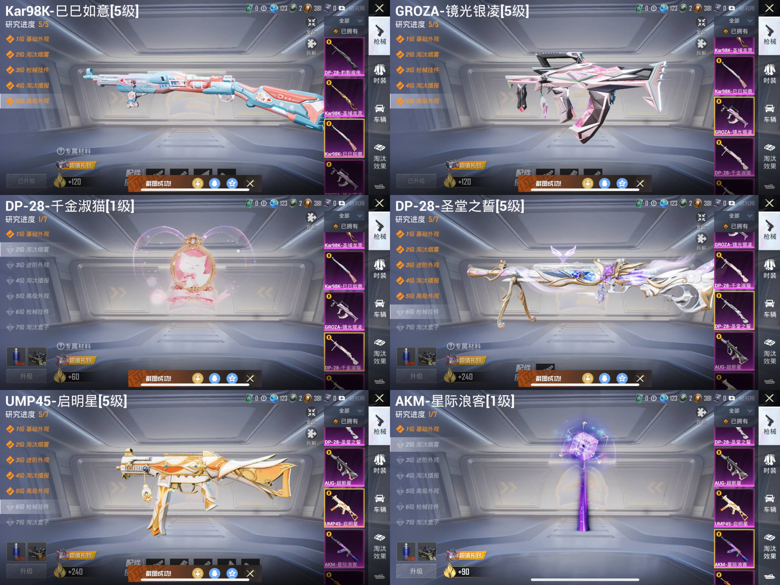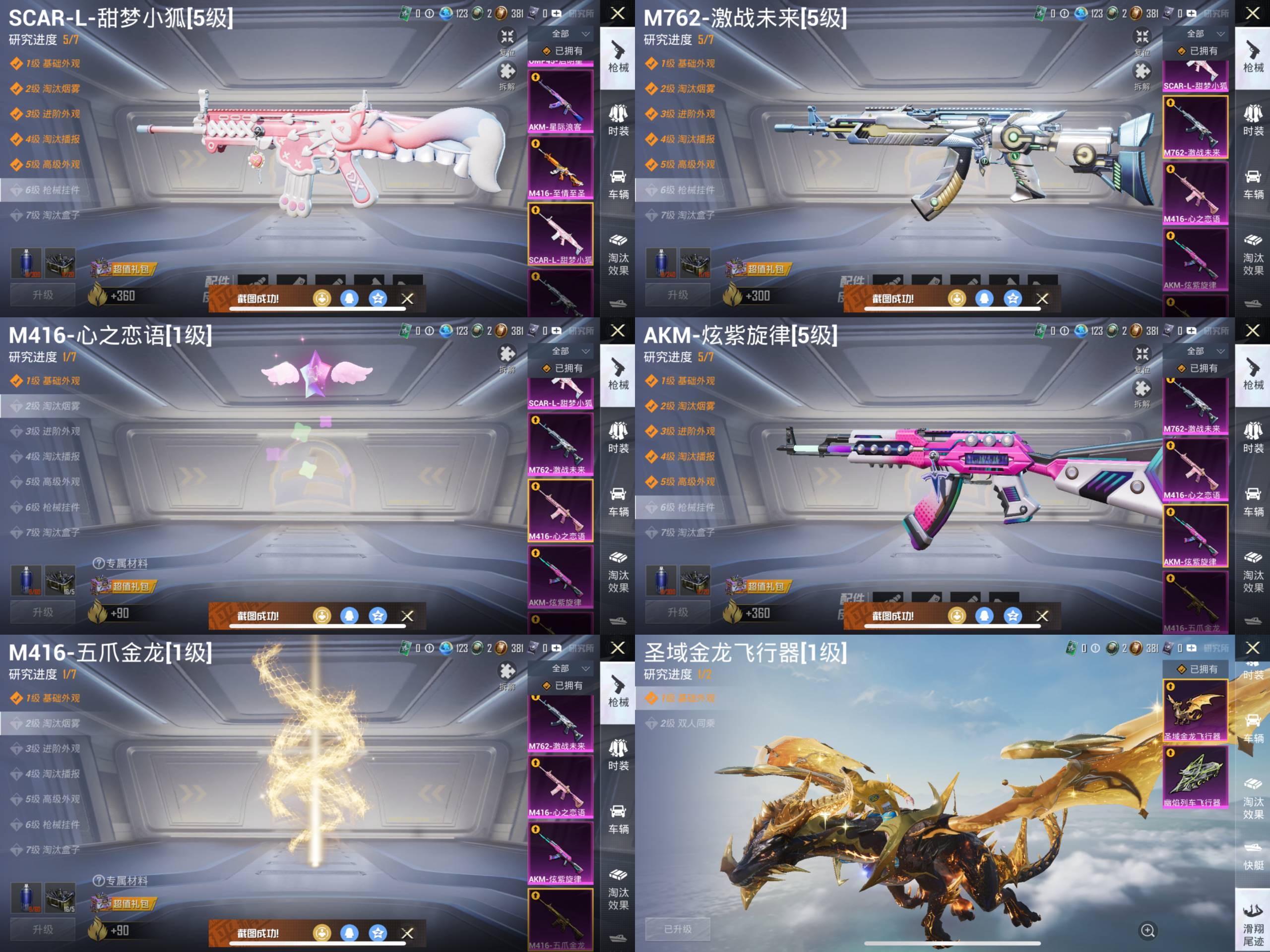 M416-心之恋语,M416-五爪金龙,AKM-炫紫旋律,M762-激战未来,SCAR-L-甜梦小狐,M416-至情至圣,AKM-星际浪客,UMP45-启明星,AUG-超新星,DP-28-圣堂之誓,DP-28-千金淑猫,GROZA-镜光银凌,Kar98K-巳巳如意,Kar98K-圣域龙灵