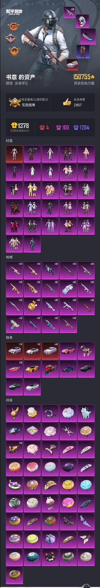 - [11432650]8粉装 9特效枪 13印记 可二次 可修改实名 女号 身法装备:暗影哥特(红眼罩),TC追光队服,Mark.06(新蓝螳螂) 优质装备:M416心之恋语,天使彩虹糖,AKM梦之光华,Kar98K未来歌姬,SCAR-L-锦绣绵绵,UMP45量子极限,AUG-暖羊咩咩,MK14-甜梦熊击,冷漠罗丽,Kar98K-巳巳如意 热门装扮:碧影闪光,仲夏莫吉托,未来歌姬,莲影清波,冠军兔兔,金丰海韵,呆萌铁蟹,梦魇先生,浪漫波比,好奇恐龙,花面小丑,暗夜魅影 六级特效枪:六级M416-心之恋语,六级AKM-梦之光华 五级特效枪:五级UMP45-量子极限,五级Kar98K-巳巳如意,五级DP-28-豹影疾电,五级MK14-甜梦熊击,五级AUG-暖羊咩咩,五级SCAR-L-锦绣绵绵 四级特效枪:四级Kar98K-未来歌姬 紫色装扮:田园牧歌,轻风白浪,SS22特训,和煦暖阳,白兰地假日,妙红点点,幻彩翩翩,SS23特训,酸甜橘柚,娇憨猪猪,萌趣咩咩,SS21特训,军械专家,人气偶像,六六大吉,冰川特警,冷焰舞者,凛冬战士,SS20特训,SS31特训套装,SS33特训套装,旭日情侣,青春冒险家,潮流游乐家,SS15特训,SS16特训,星梦畅游,萌趣颜团子,特种颜团子,虚音幻奏,飞驰魅影,音速流光,SS19特训,军刀雅典娜,甜心亚梦,豚鼠丹丹,瑞龙福将,团圆交子,SS17特训,异彩先驱,SS18特训,长空猛禽,迎春赐吉,都市魅力,酒红色名流,野性战心,雨林探路者,雪山征服者,霓虹极客,霓虹街区,缤纷果语,耀眼新星,蓝彩潮人,蓝色运动,血色贵族,街头潮人,西部风情,超能勇士,青春校园,风暴特警,龙的传人,飞行日记,魅力单车,鹤鸣,麻辣教官,黄色伏地魔,黄色名流,黄色运动,黑色伏地魔,龙腾端午,龟仙人,冰河战士,龙魂突击队,蝶变,熔岩游骑兵连帽夹克,绮丽涂鸦,朋克治安官,极地朋克,极速红龙,柠萌假日,格斗先锋,沙漠兵团,沙漠毒蛇,活力之心,海岛探路者,暗金炫舞,湖蓝色名流,幻世战舞者,夏日倾情,夏日音浪,完美偶像,帅气教官,幻影武者,战地菁英,探宝勇士,清新柠檬,滨海假日,甜蜜熊情侣,白熊同盟,白色伏地魔,破晓战魂,王牌教练,福星高照,空岛之星,空投萌叽,竞技达人朋克,红色运动,猛禽,滨海厨神,燃烧卡路里,灼焰舞者,炫蓝之夏,牛气冲天,猎鹰,牛气满满,特战英豪,狂沙舞者,湖畔霞光