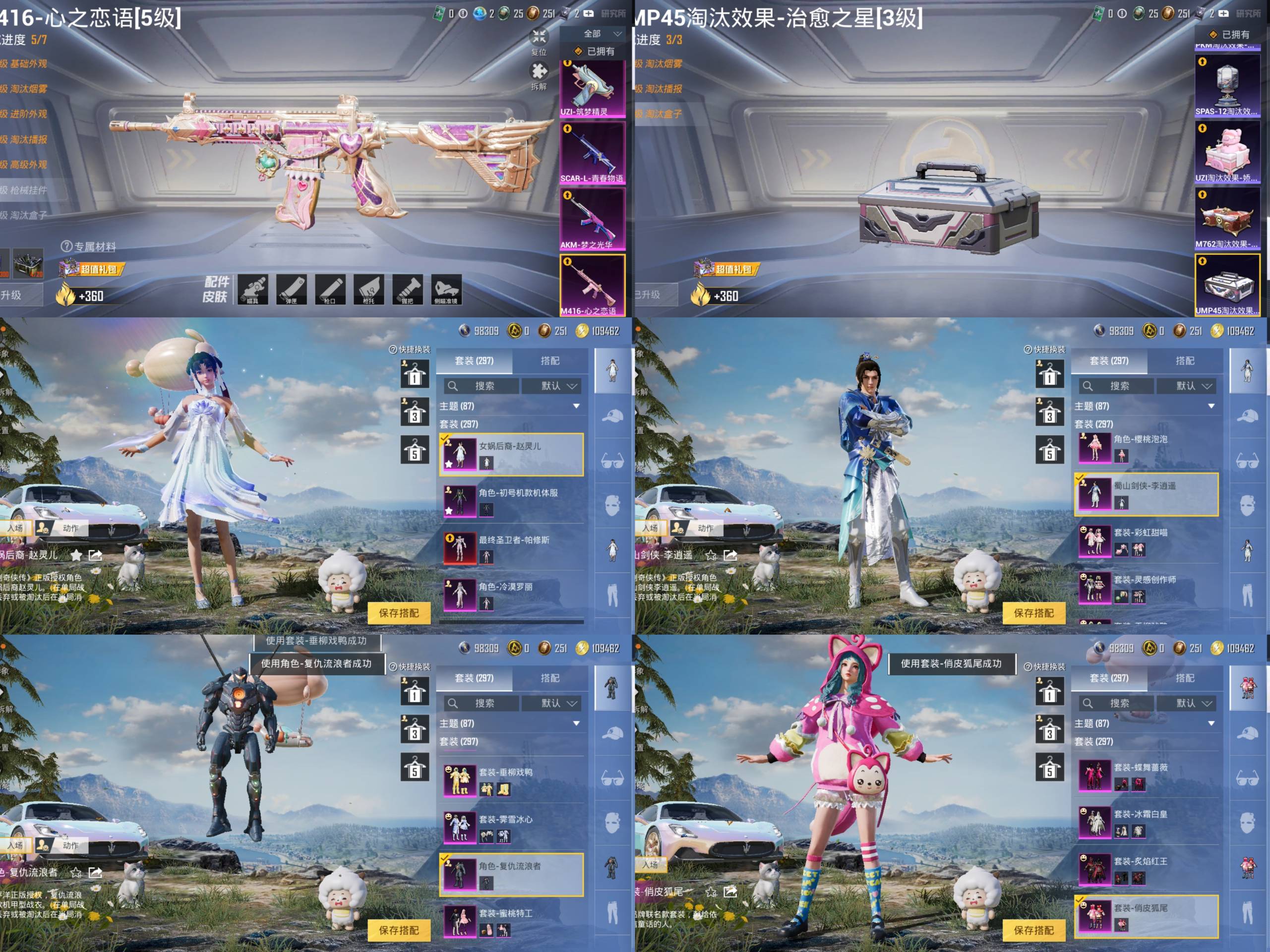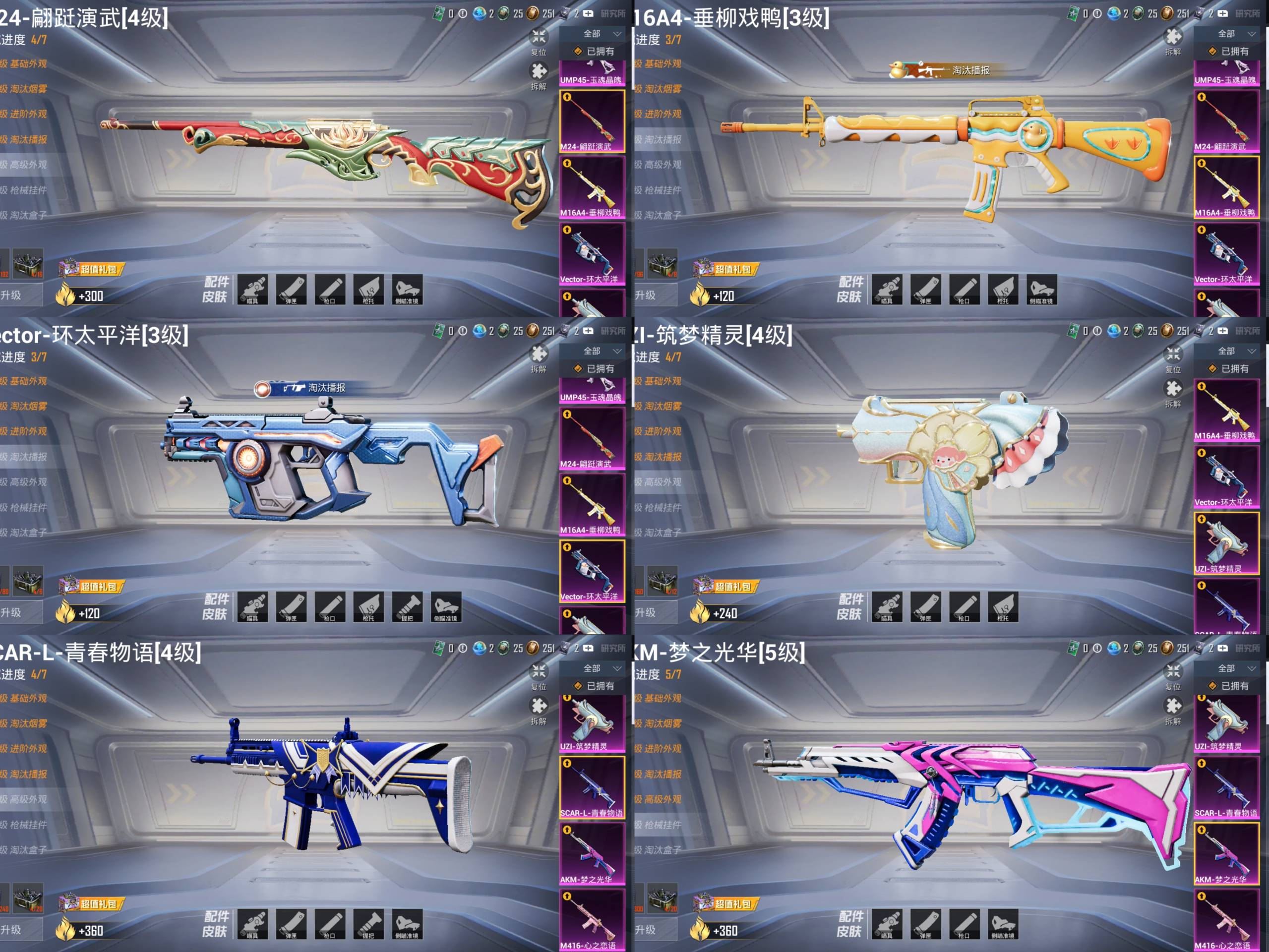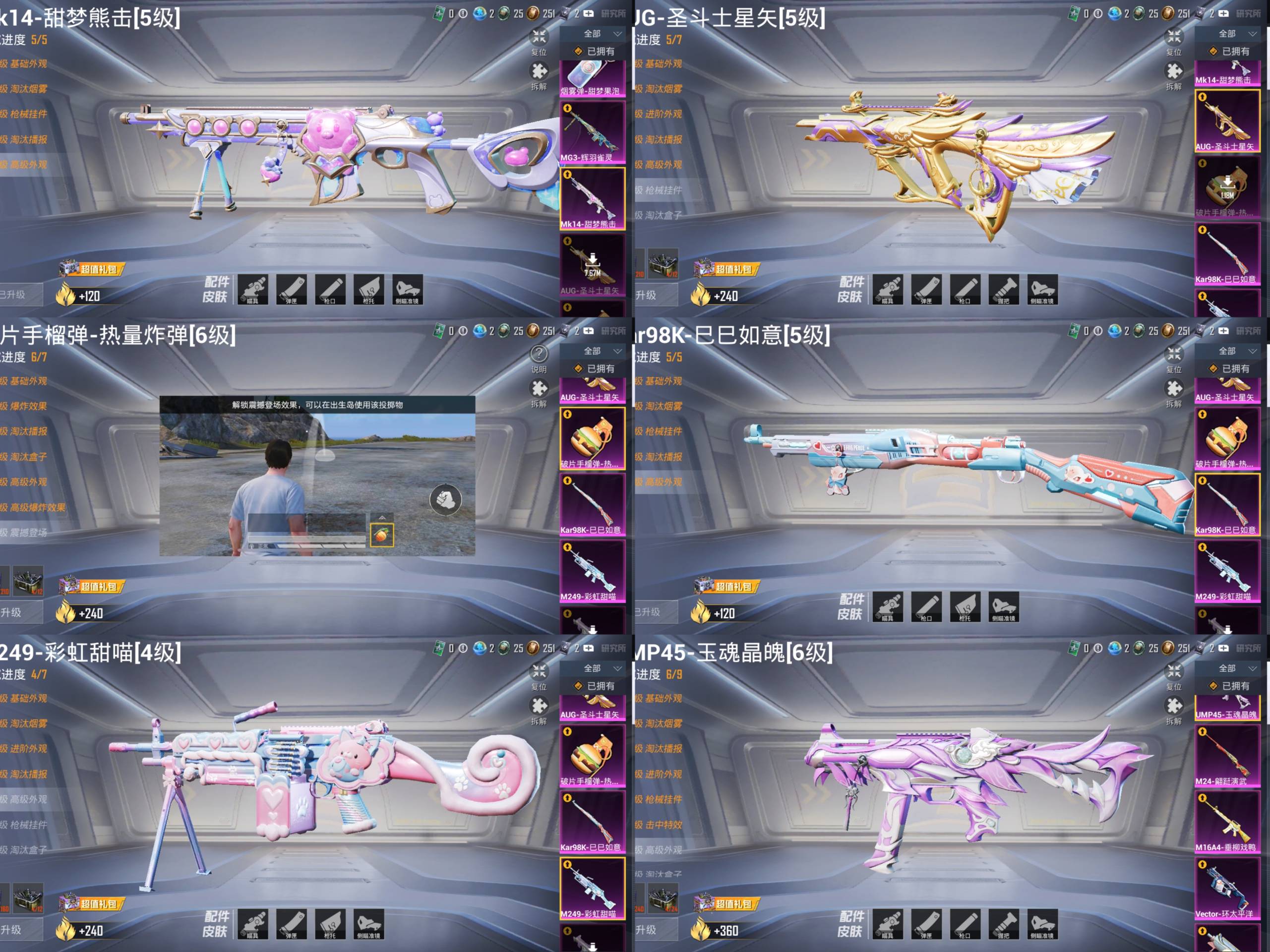 M416-心之恋语,AKM-梦之光华,SCAR-L-青春物语,UZI-筑梦精灵,Vector-环太平洋,M16A4-垂柳戏鸭,M249-彩虹甜喵,M24-翩跹演武,UMP45-玉魂晶魄,Kar98K-巳巳如意,破片手榴弹-热量炸弹