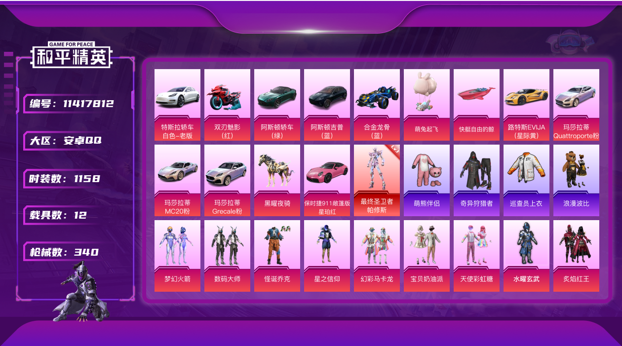 [11417812]WBDS0065 安卓Q 历史无敌战神 297套装 340枪皮 1神装26粉装19特效枪13载具 最终圣卫者-帕修斯 (1级) 玛莎拉蒂Q幻星粉 (6级) 玛莎拉蒂M幻星粉 (1级) 玛莎拉蒂G幻星粉 (1级) 保时捷911敞篷版(星珀红) 路特斯EV黄色 阿斯顿马丁S绿色 阿斯顿马丁X蓝色 合金龙骨蓝色 特斯拉3白色 黑曜夜骑 双刃魅影红色 自由的鲸 (1级) 萌兔起飞僚机 奇异狩猎者 巡查衣 赤蝎幽灵 AKM-缤纷海域 浪漫天命 派对舞王 派对舞王(金靴子) 紫螳螂 梦幻火箭 赵灵儿 李逍遥 宝贝奶油派 天使彩虹糖 樱桃泡泡 水曜玄武 怪诞乔克 冷漠罗丽 垂柳戏鸭 放客神游 星之信仰 数码大师 极致幻想 幻彩马卡龙 花间之火 灵感创作师 俏皮狐尾 冰霜白皇 炙焰红王 霁雪冰心 彩虹甜喵 蜜桃特工 蝶舞蔷薇 复仇流浪者 M416-心之恋语 (5级) M416-灵猫魔法师 (6级) Kar98K-巳巳如意 (5级) MG3-辉羽雀灵 (3级) MG-36-沧焰双生 (5级) DP-28-豹影疾电 (5级) AUG-圣斗士星矢 (5级) Mk14-甜梦熊击 (5级) UZI-筑梦精灵 (4级) 汤姆逊-热量炸弹 (5级) AKM-梦之光华 (5级) UMP45-玉魂晶魄 (6级) M16A4-垂柳戏鸭 (3级) M24-翩跹演武 (4级) M249-彩虹甜喵 (4级) Vector-环太平洋 (3级) SCAR-L-青春物语 (4级) 破片手榴弹-热量炸弹 (6级) 烟雾弹-甜梦果泡 (4级) 心之恋语飞行翼 梦幻火箭飞行器 星之彼岸飞行器 太空嘟嘟飞行器 龟仙人 雪山精英 恶魔人蛛 梦魇先生 呆萌铁蟹 万圣娃娃 鹰眼刺客 兔兔白日梦 激萌罗小黑 暗夜行者 浪漫波比 金羽特工 童话森林 罗小黑 胖达圆圆 神秘黑猫 暗夜契约 暗影哥特 SS1特训 团圆交子 瑞龙福将 星河浪客 纯白誓言 粉红小猪 萌熊伴侣 狂沙舞者 冰爽海盐 韶华初心 粉甜马卡龙 海洋之心 娴静芝兰 破蛋小黄鸡 风华少年志 白月香洋装 黑色刀锋 极速红龙 军刀雅典娜 英勇保护者 弄潮海豚 M416-魔法学院 M762-奇异狩猎者 M762-瑞龙福将 S686-奇异狩猎者 AUG-魔法学院 M24-香水柠檬 九霄头盔 精灵迷巫头盔 水曜玄武头盔 甜心宝贝头盔 金风玉露头盔 甜蜜誓约头盔 心之恋语头盔 花间之火头盔 甜心宝贝背包 百万伏特背包 萌熊伴侣背包 神秘黑猫背包 甜蜜誓约背包 心之恋语背包 马卡龙背包 花间之火背包