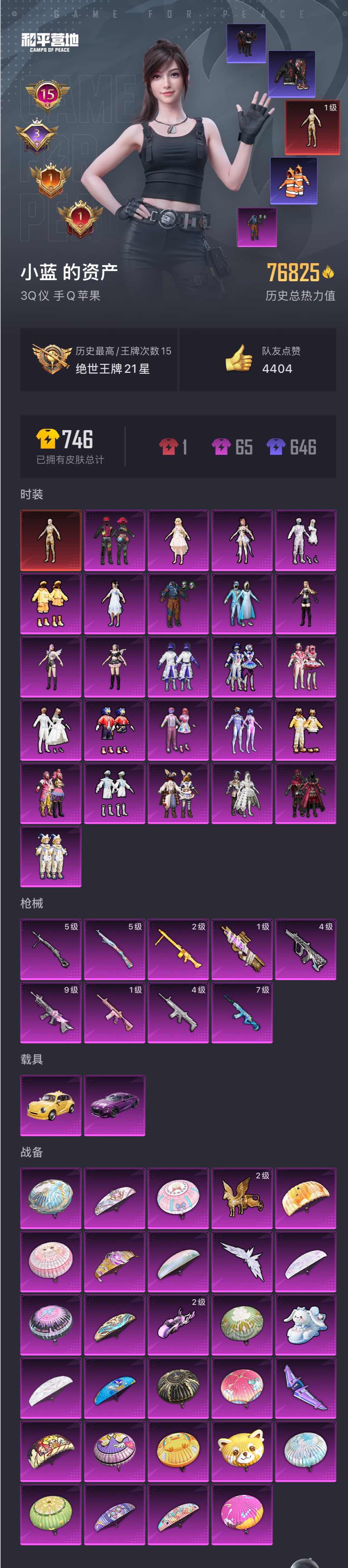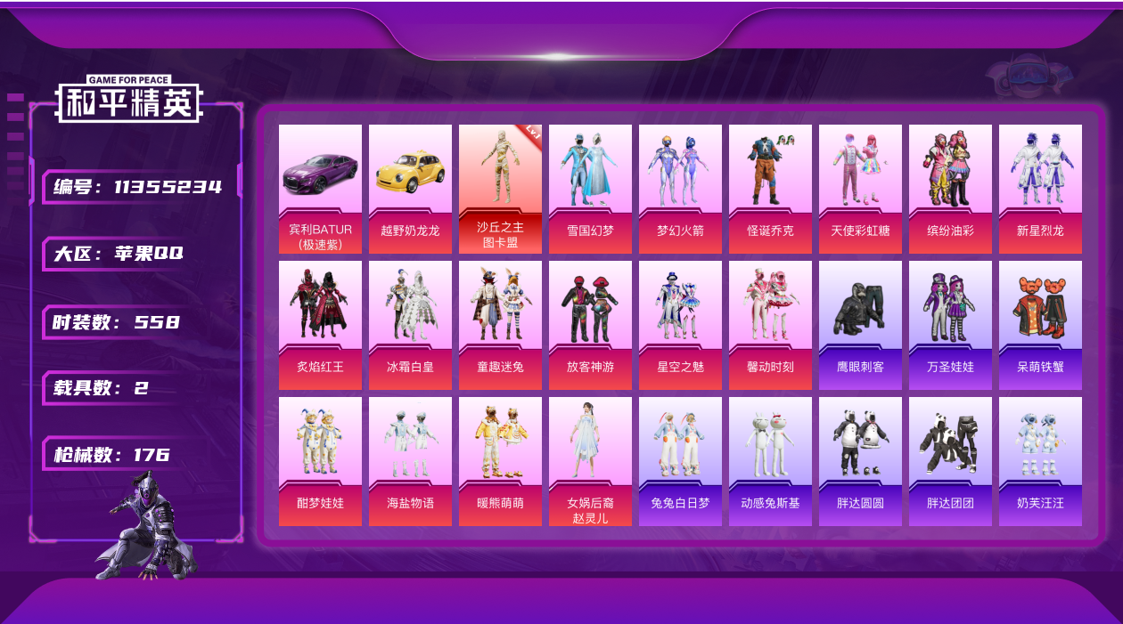[11355234]WBDS0061 苹果Q 148套装 176枪皮 1神装25粉装9特效枪2载具 沙丘之主-图卡盟 (1级) M416-超新星 (9级) 宾利BATUR(极速紫) 越野奶龙龙 赤蝎幽灵 AKM-缤纷海域 浪漫天命 圣堂之誓 梦幻火箭 雪国幻梦 赵灵儿 蔷薇星 白兰星 茉莉星 憨憨奶龙 天使彩虹糖 小叽联名款 怪诞乔克 镜光幻境 酣梦娃娃 缤纷油彩 放客神游 心之回忆 新星烈龙 星空之魅 童趣迷兔 冰霜白皇 炙焰红王 暖熊萌萌 馨动时刻 音爆索尼克 海盐物语 SCAR-L-纯梦嫁纱 (4级) M416-心之恋语 (1级) P90-沙丘之主 (1级) Kar98K-巳巳如意 (5级) AKM-百合蜜语 (7级) MG3-酷泡奶龙 (2级) DP-28-豹影疾电 (5级) AUG-超新星 (4级) 梦幻火箭飞行器 镜光幻境飞行翼 萌物绒绒飞行器 龟仙人 动感兔斯基 潮萌小黄鸭 呆萌铁蟹 万圣娃娃 鹰眼刺客 兔兔白日梦 奶芙汪汪 恶魔喵喵 激萌罗小黑 胖达圆圆 胖达团团 暗影哥特 雪国精灵头盔 深海小丑鱼头盔 梦幻火箭背包 雪国精灵背包 甜心宝贝背包 深海小丑鱼背包
